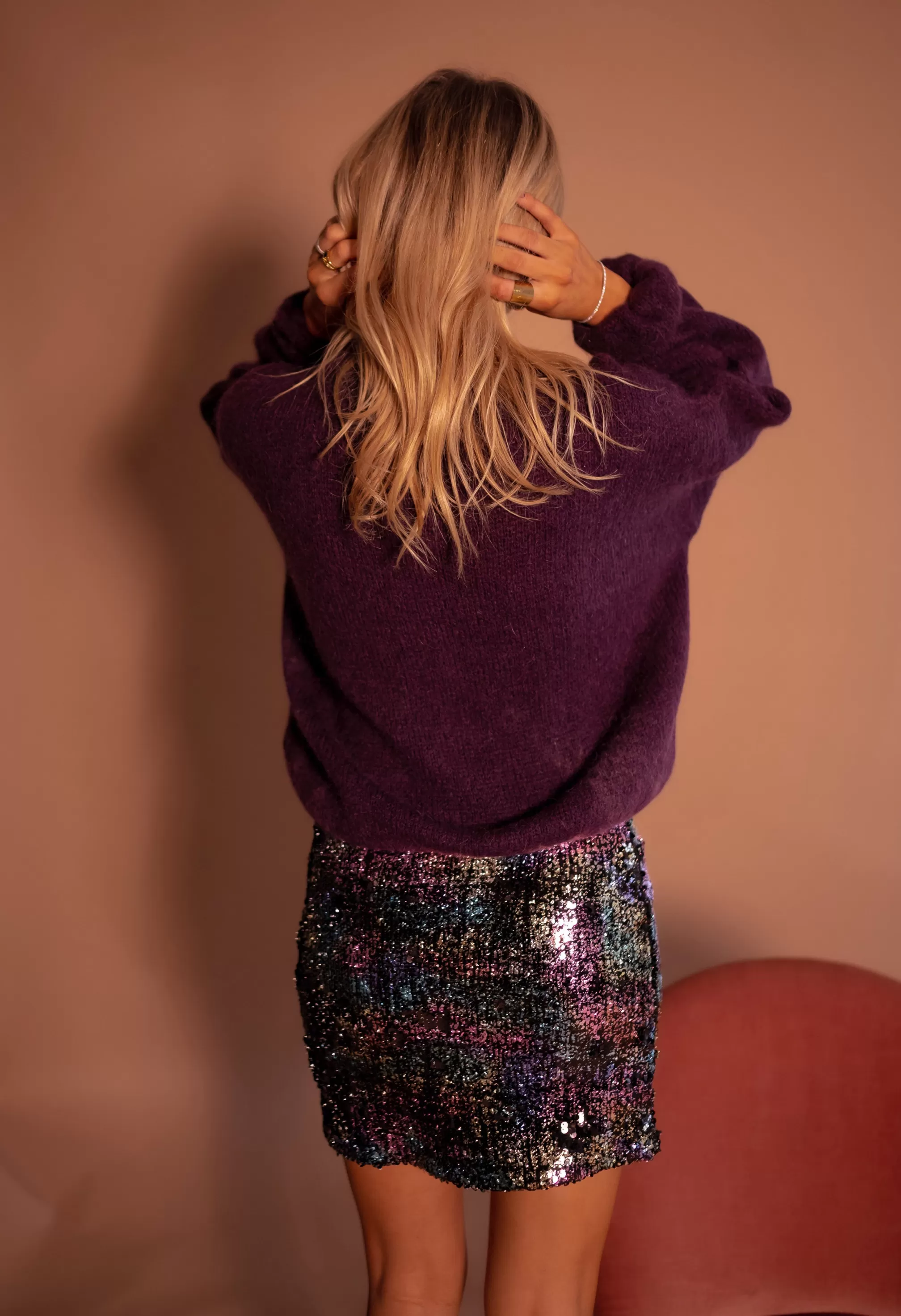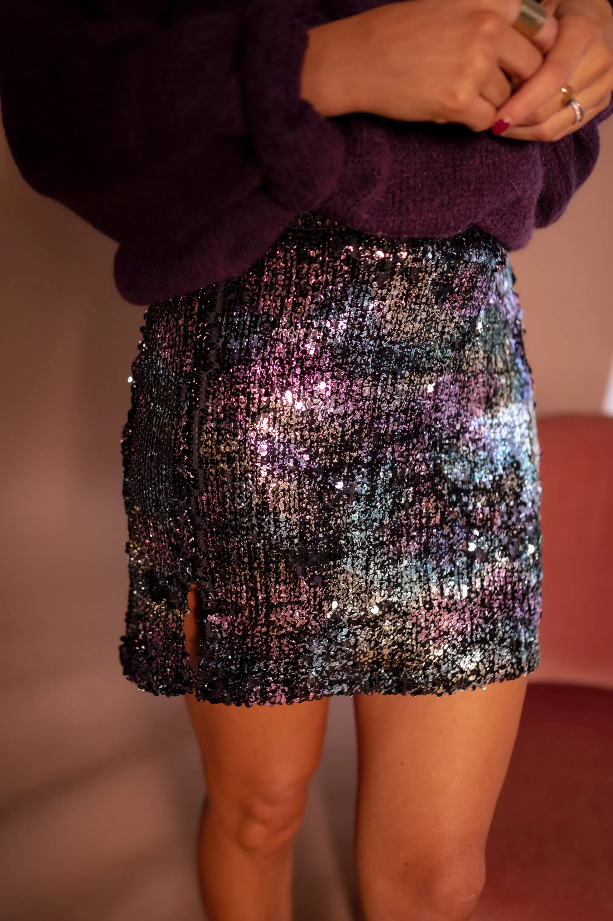 Mini skirtSplit on the side Slightly tightLiningGlitters with purple, golden, seagreen an…