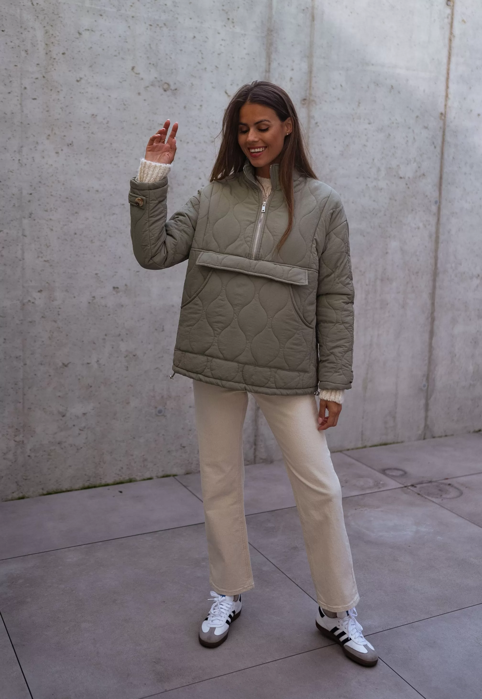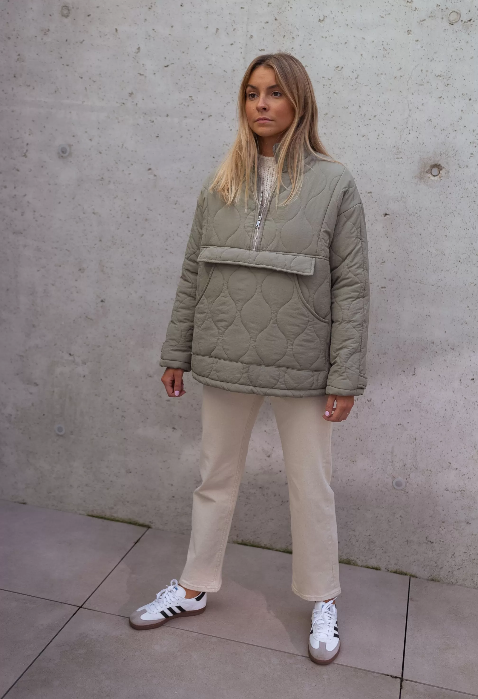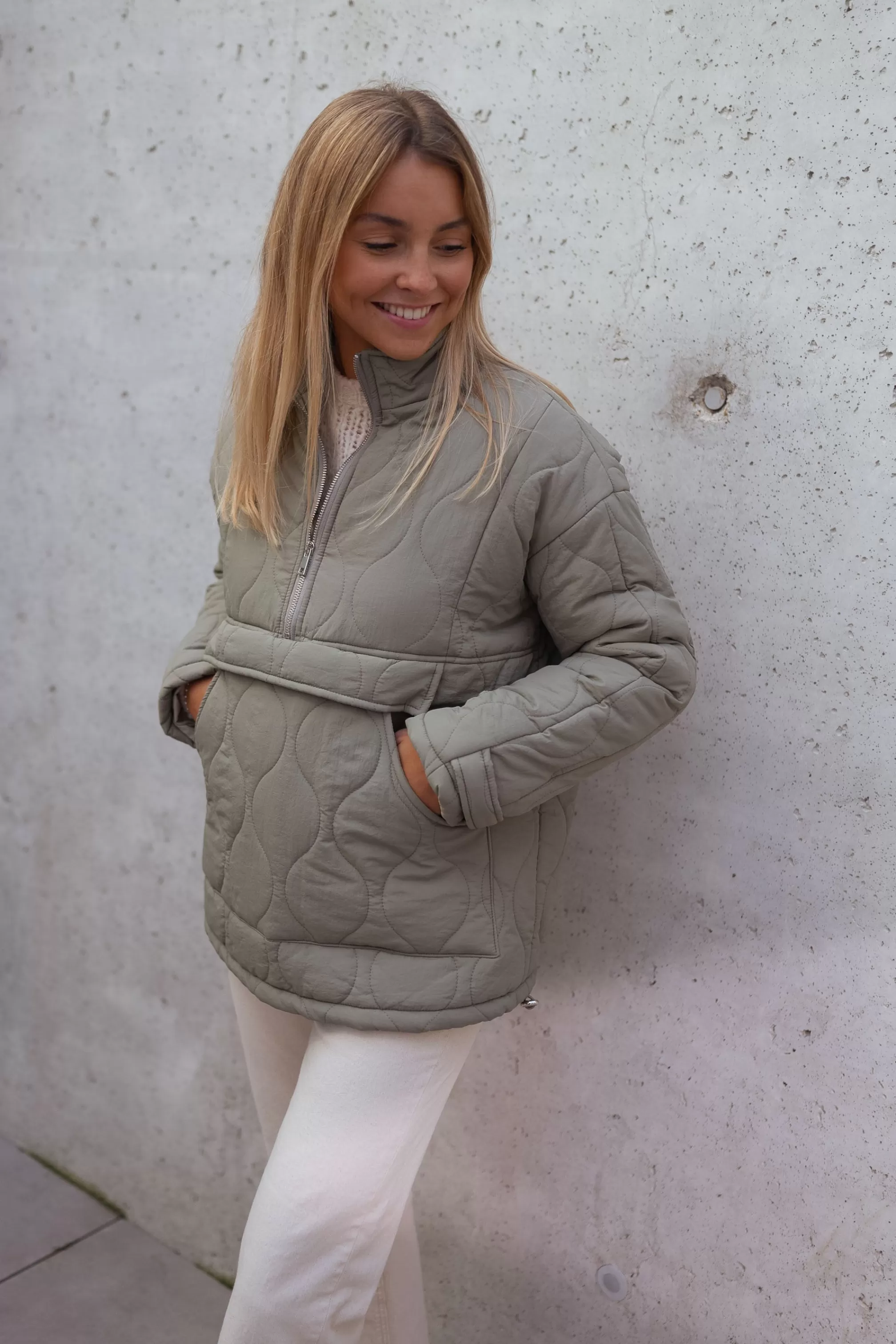 - Silvery zipper on the front