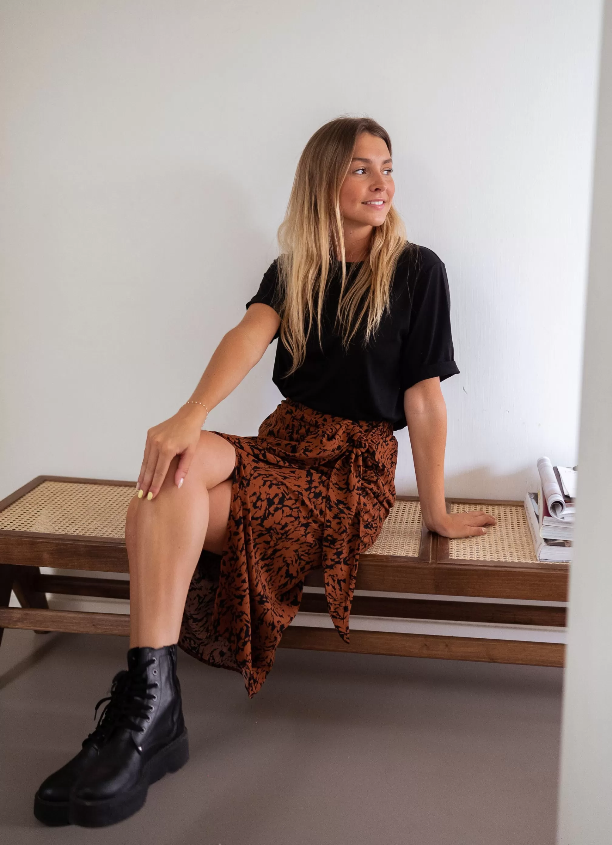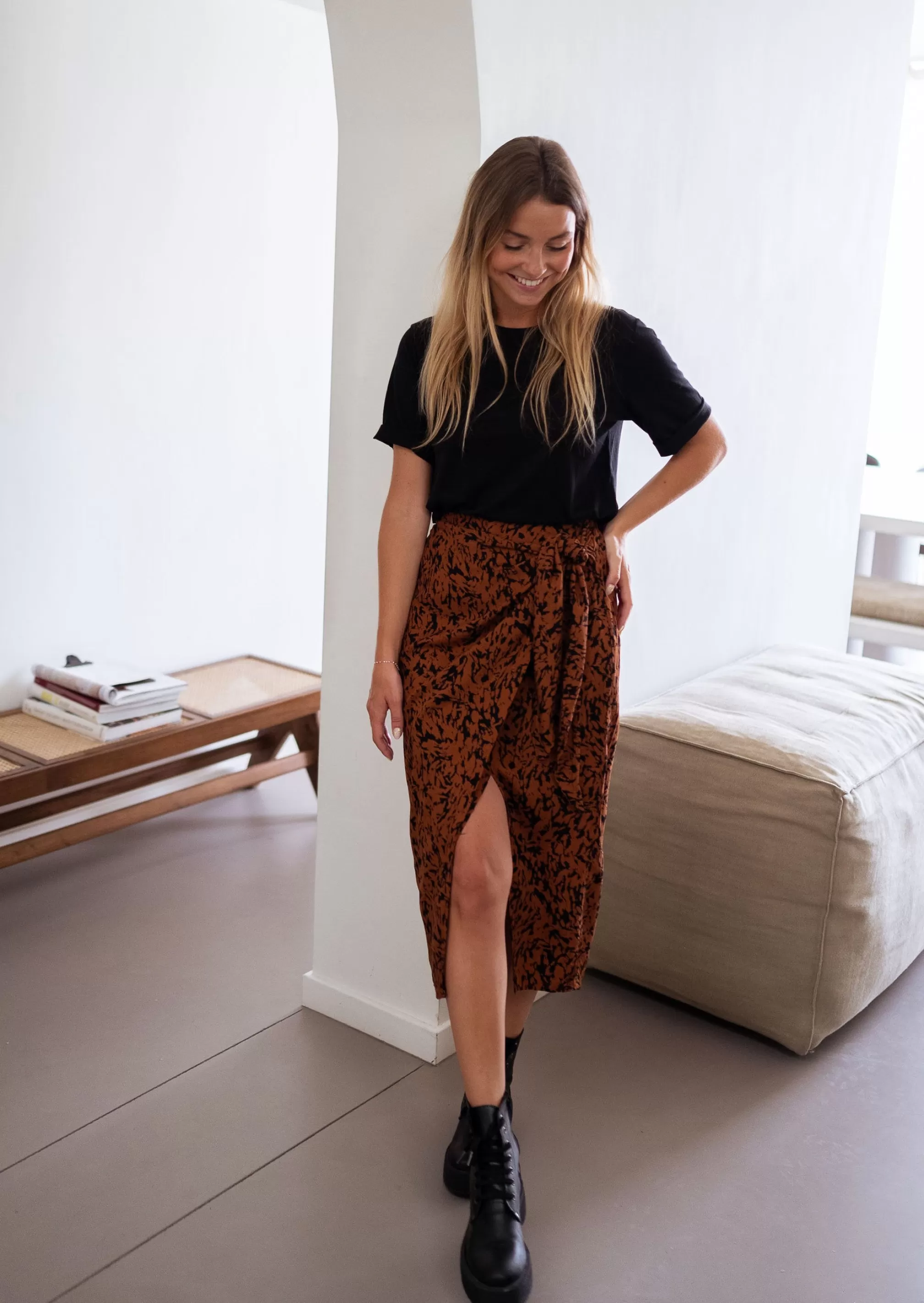 Midi skirt Wrap front with a knot to tieElastic in the back Lining Soft fabric&…