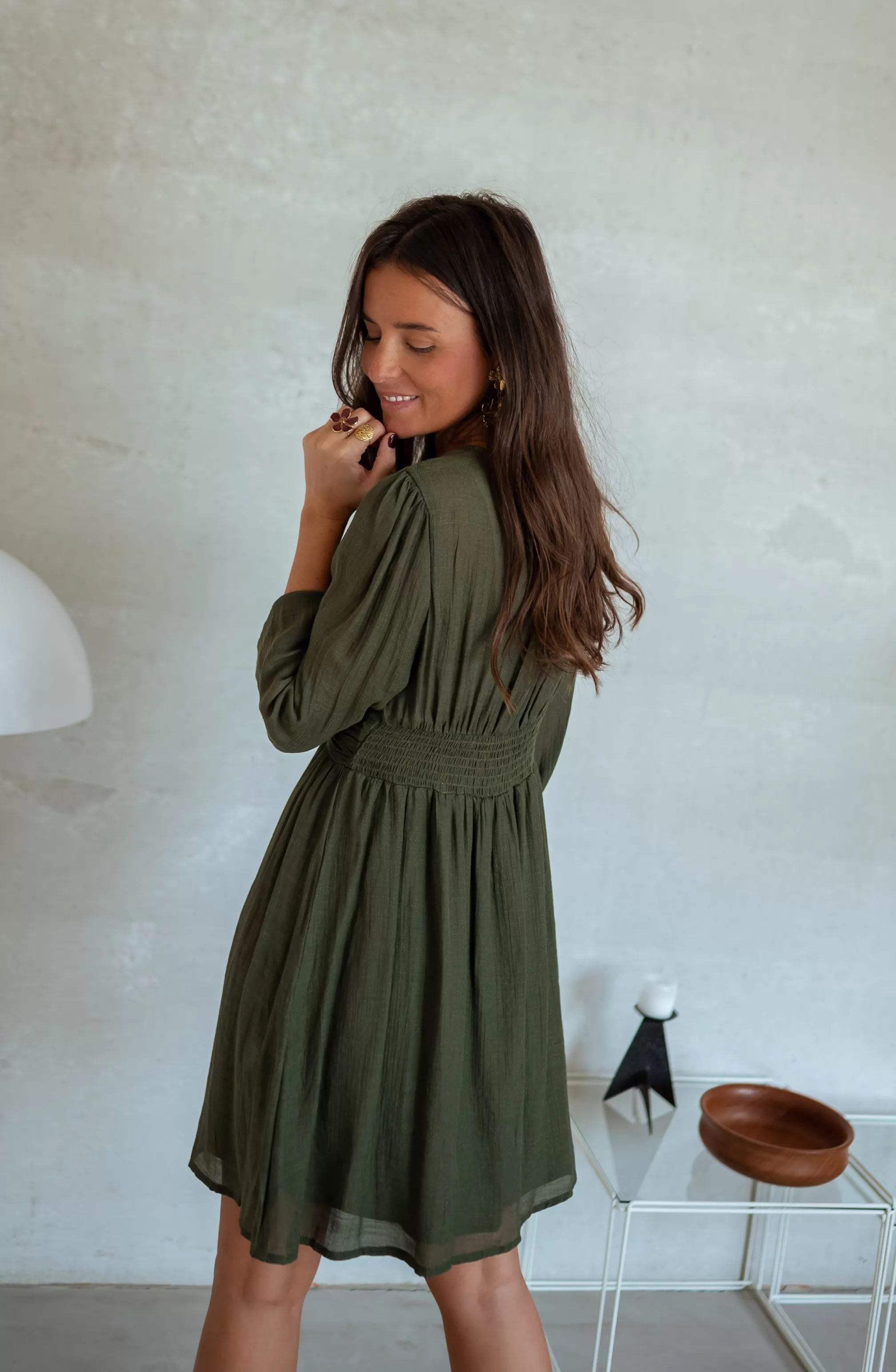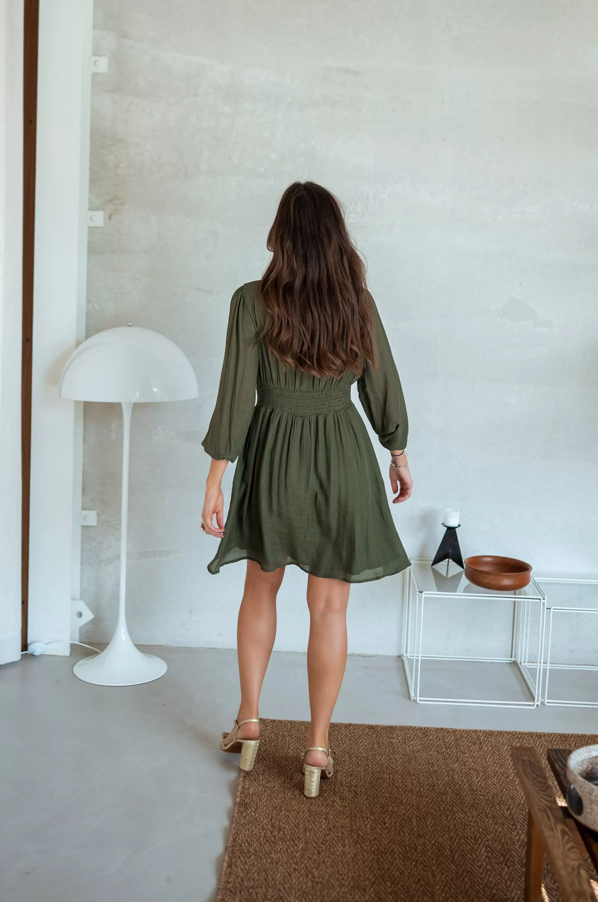 Deep v-neck Tightened at the chest Long flared sleeves with elastic at the wristLini…