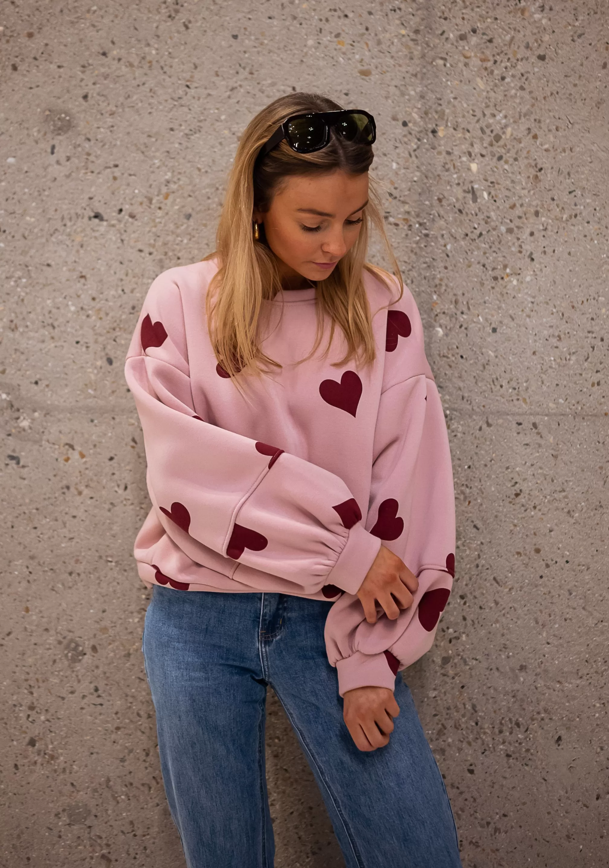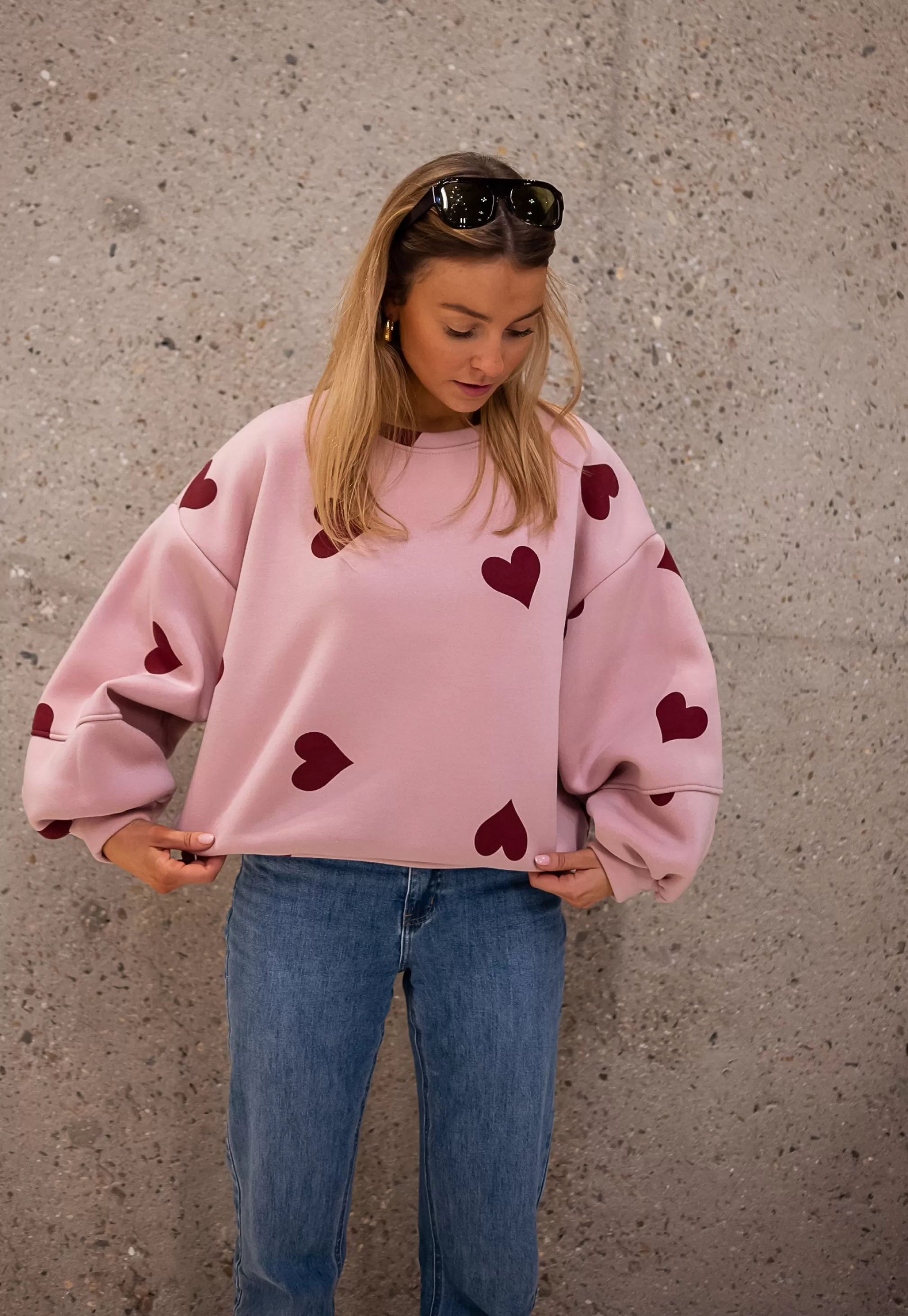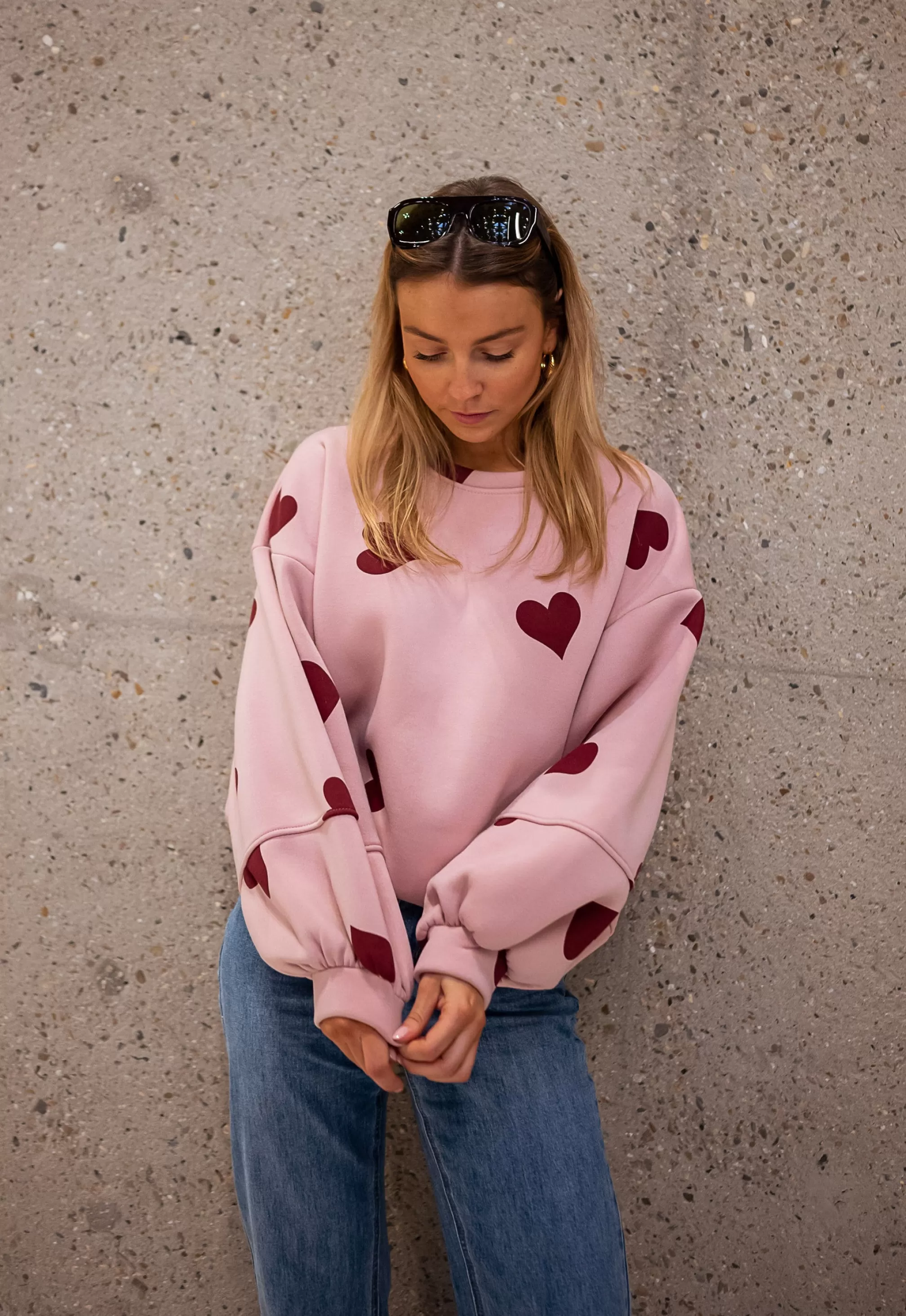 Loose sweater Pink background with red hearts Made in ItalyOphélie is 1m68 and usua…