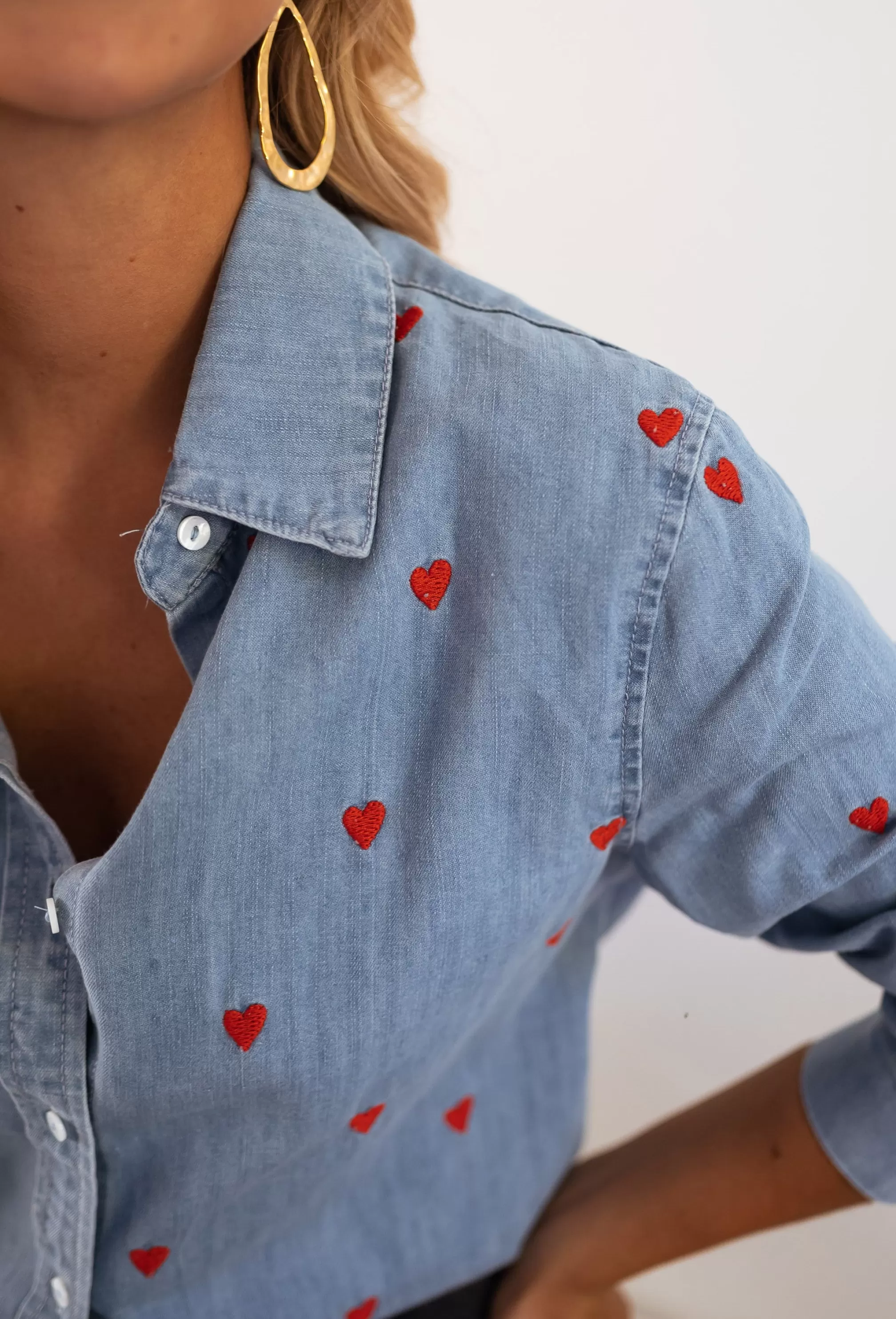 Long sleevesRed hearts Light denim shirt Fluid Ecru buttons all along the shirt…