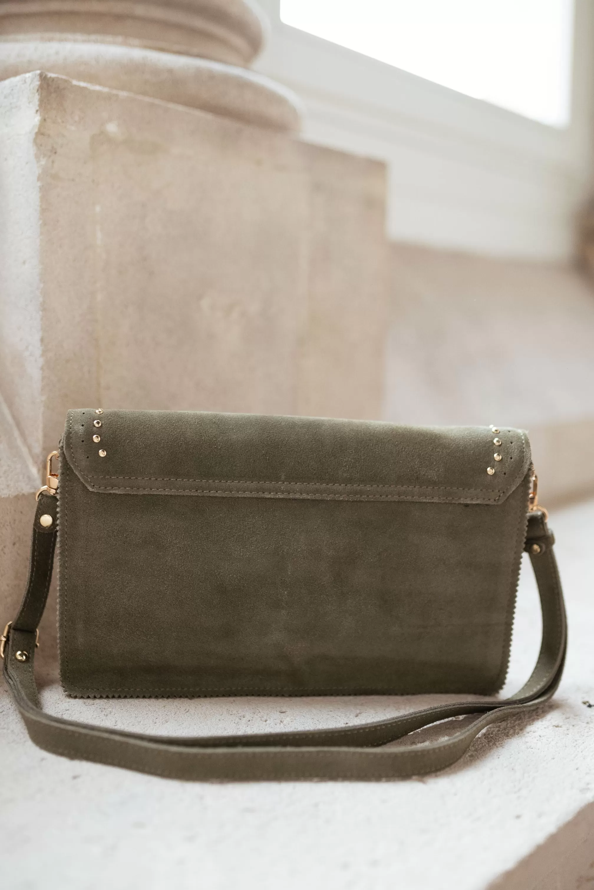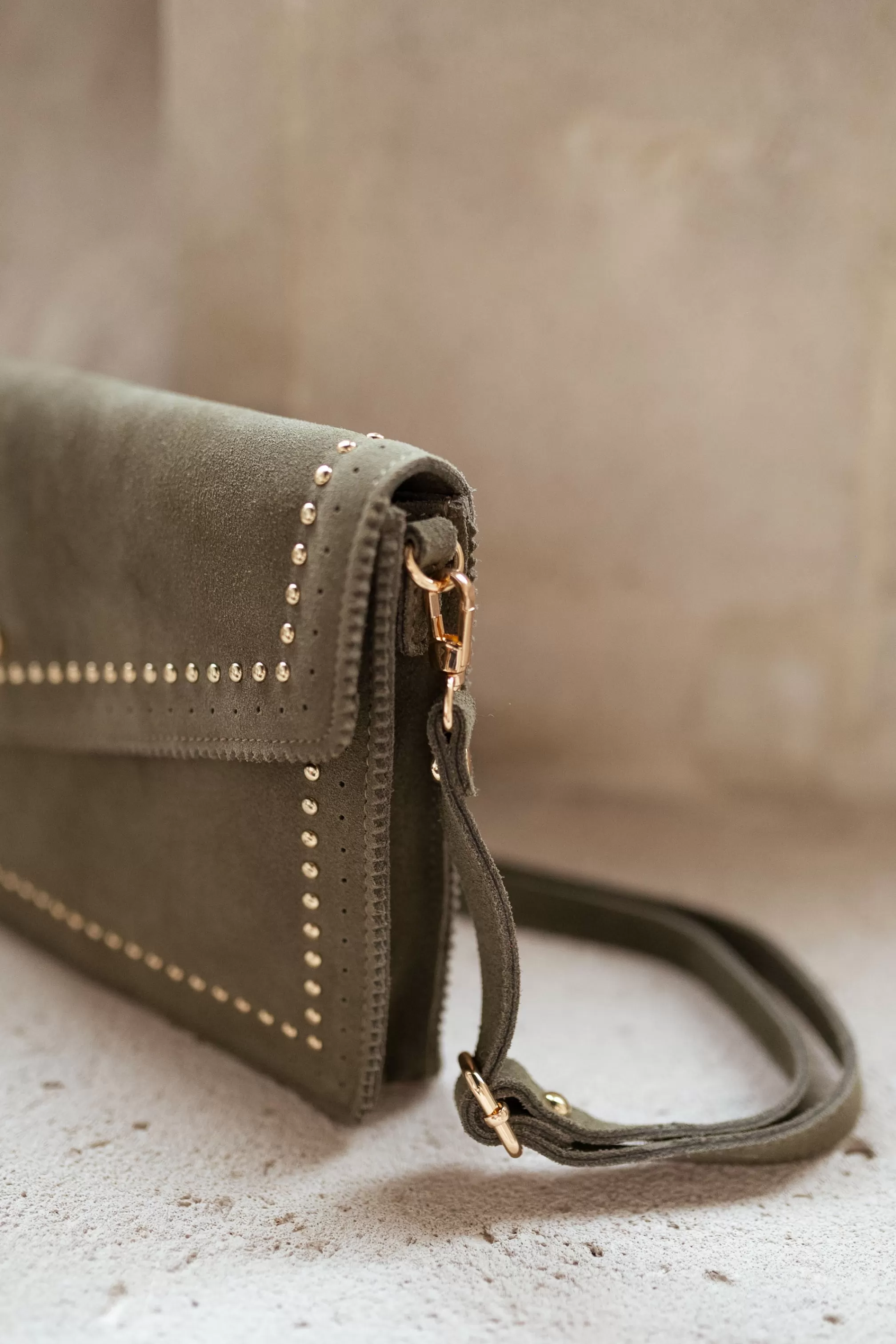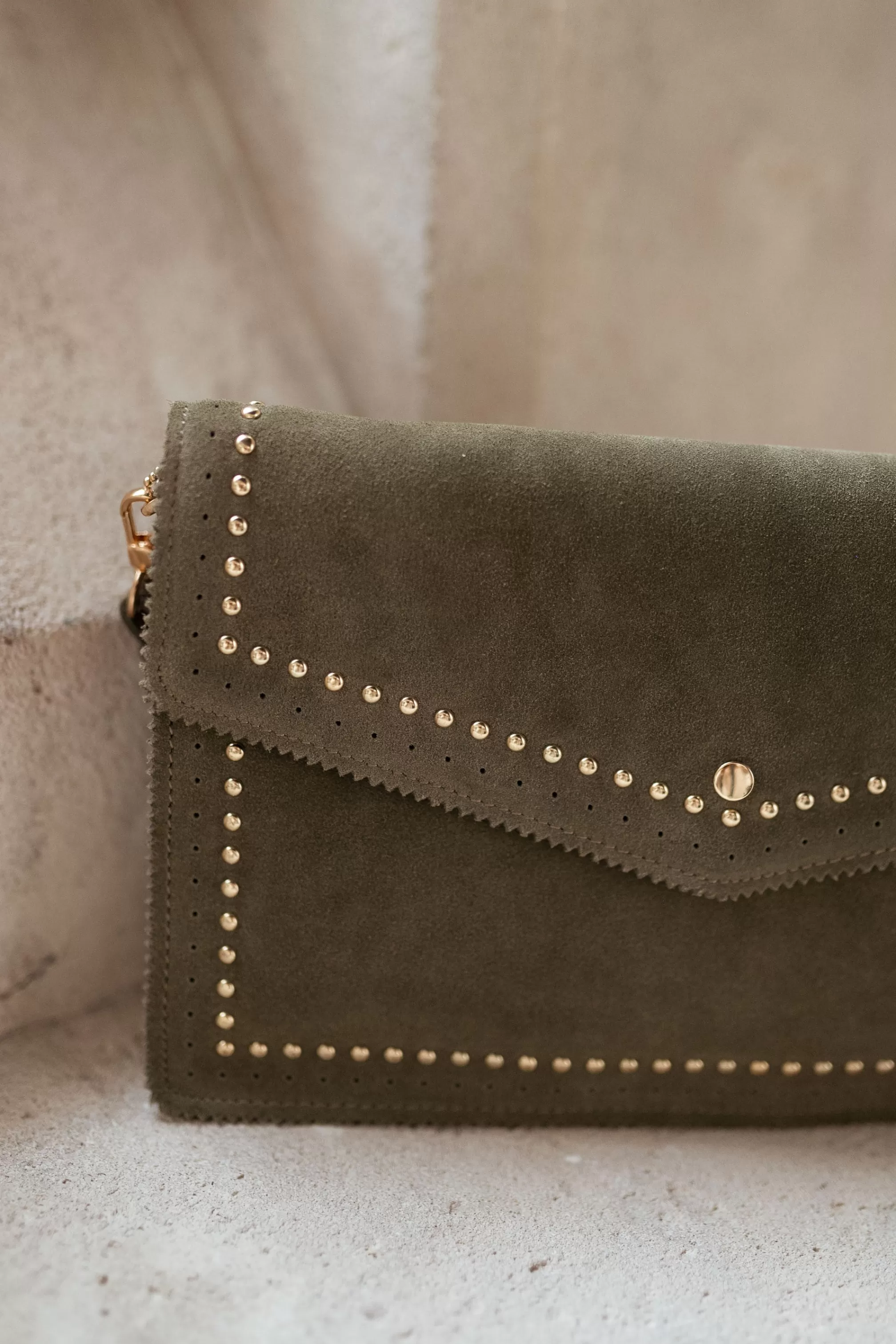 Suede effectRectangular shapeStrap providedGolden detailsColors : khakiLength 30 cm – Width 19…