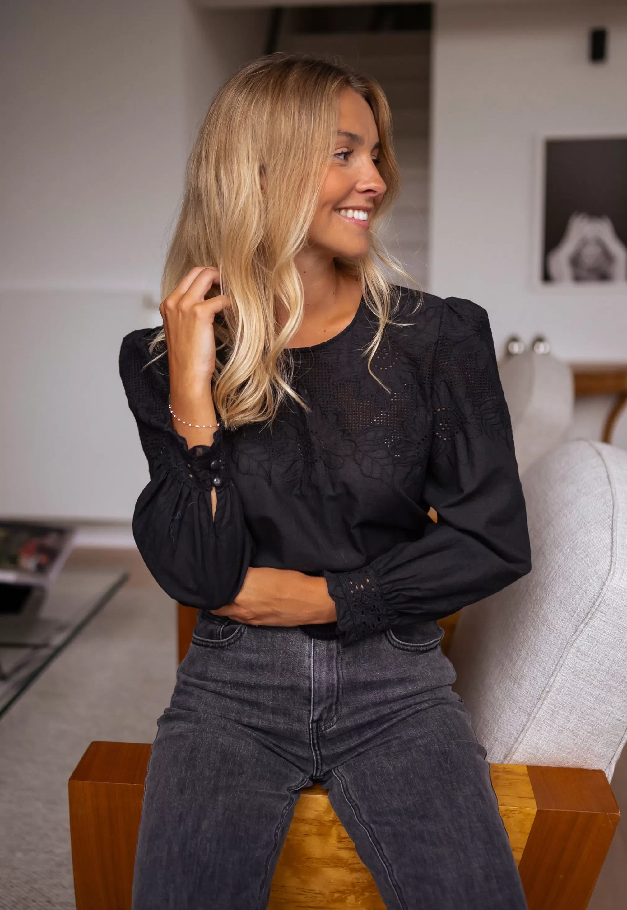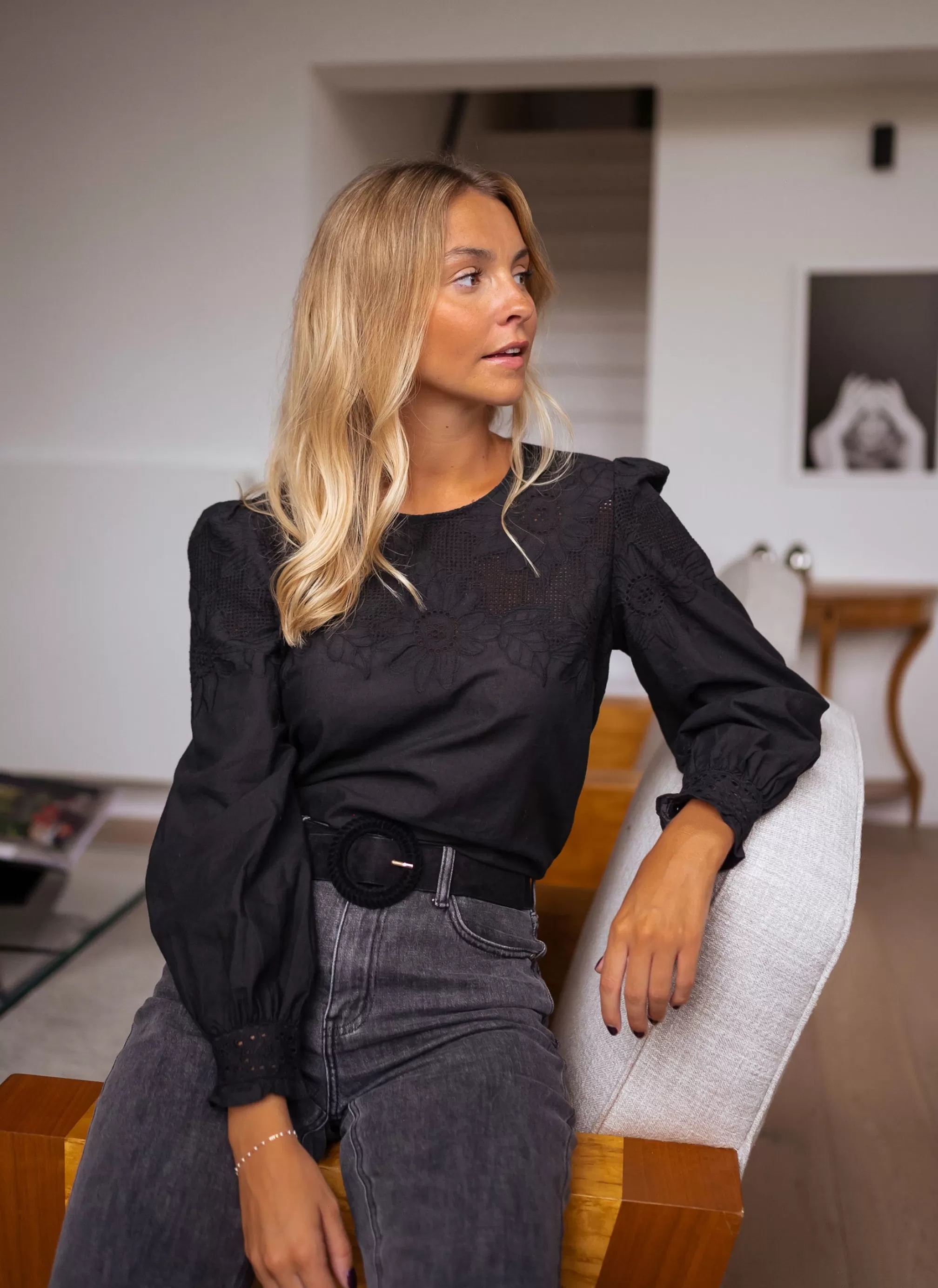 - Openwork pattern on collar and cuffs