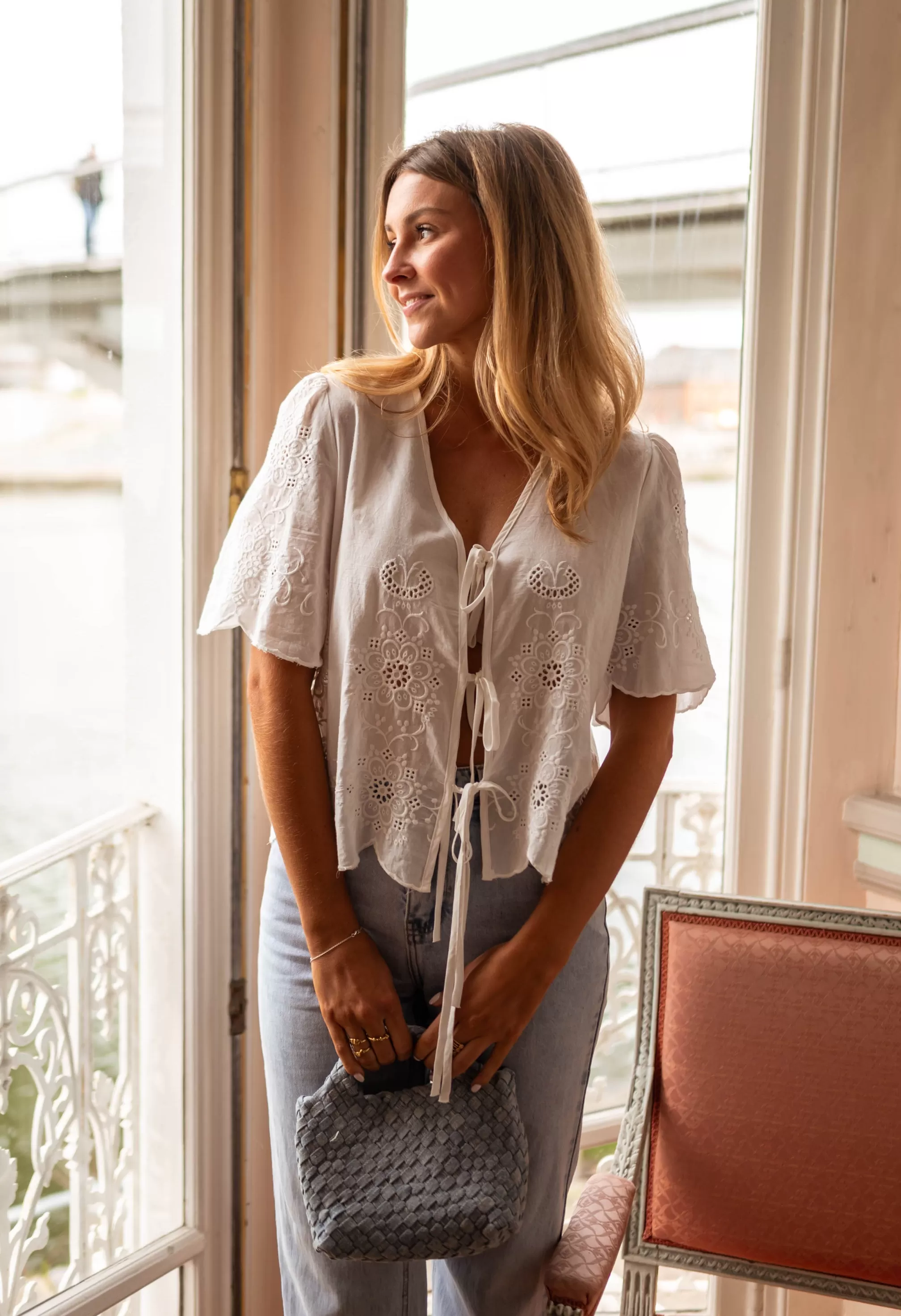 Short sleevesBow to tie on the front Ophélie is 1m68 and wears a size S-MManon is 1m69 a…