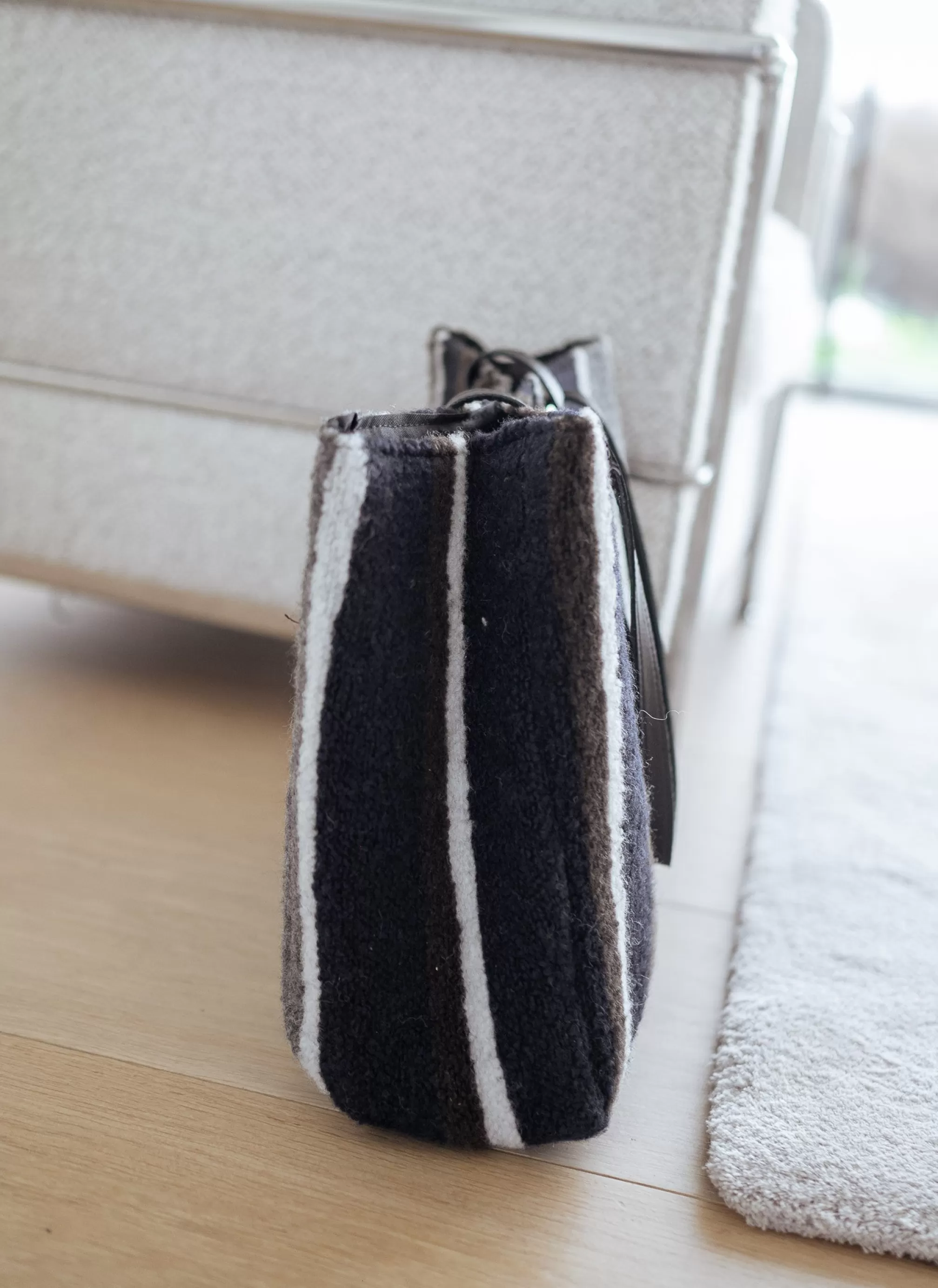 Cabas effectRectangular shapeLeather handleWool effectPocket inside the bag Colors : blue…