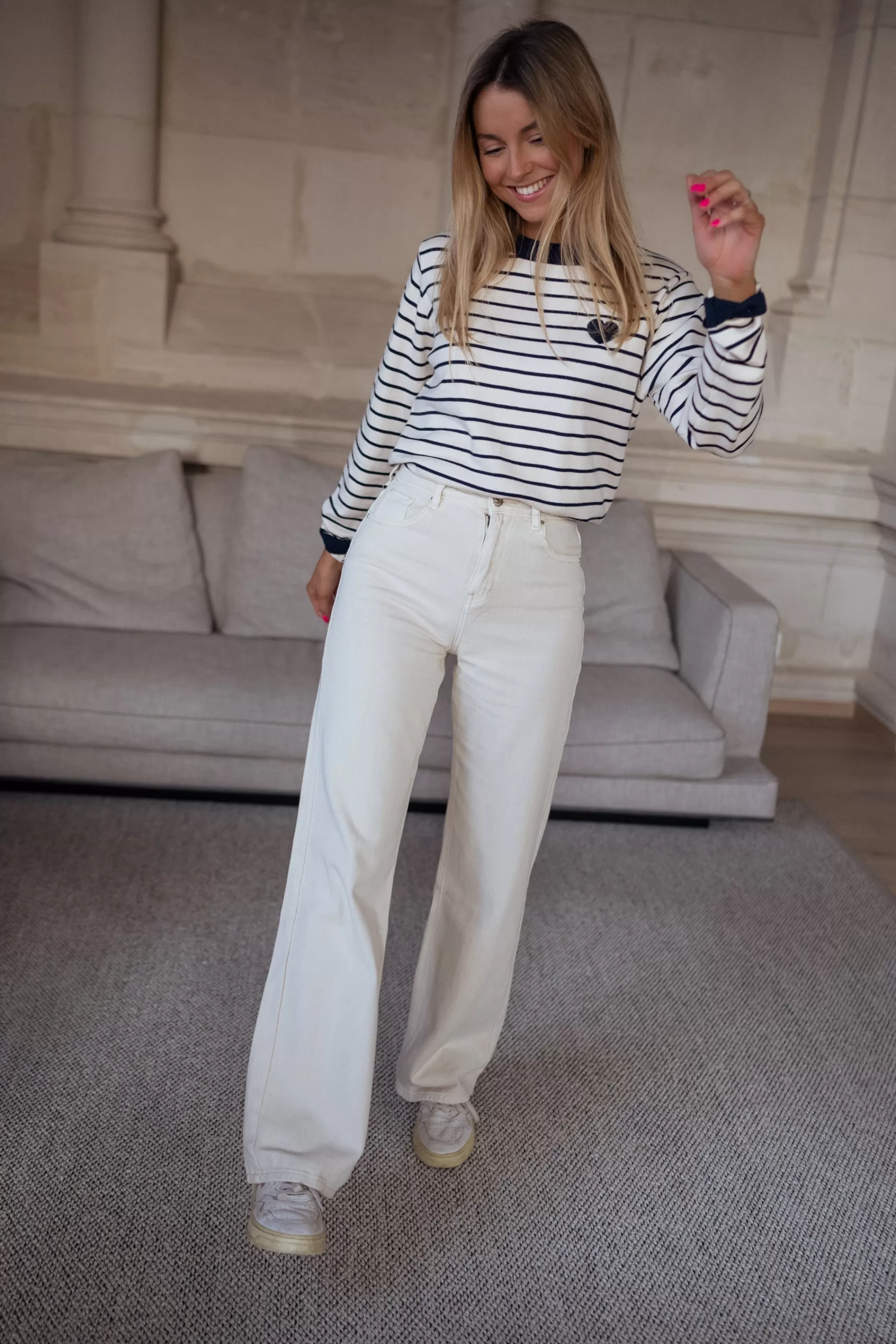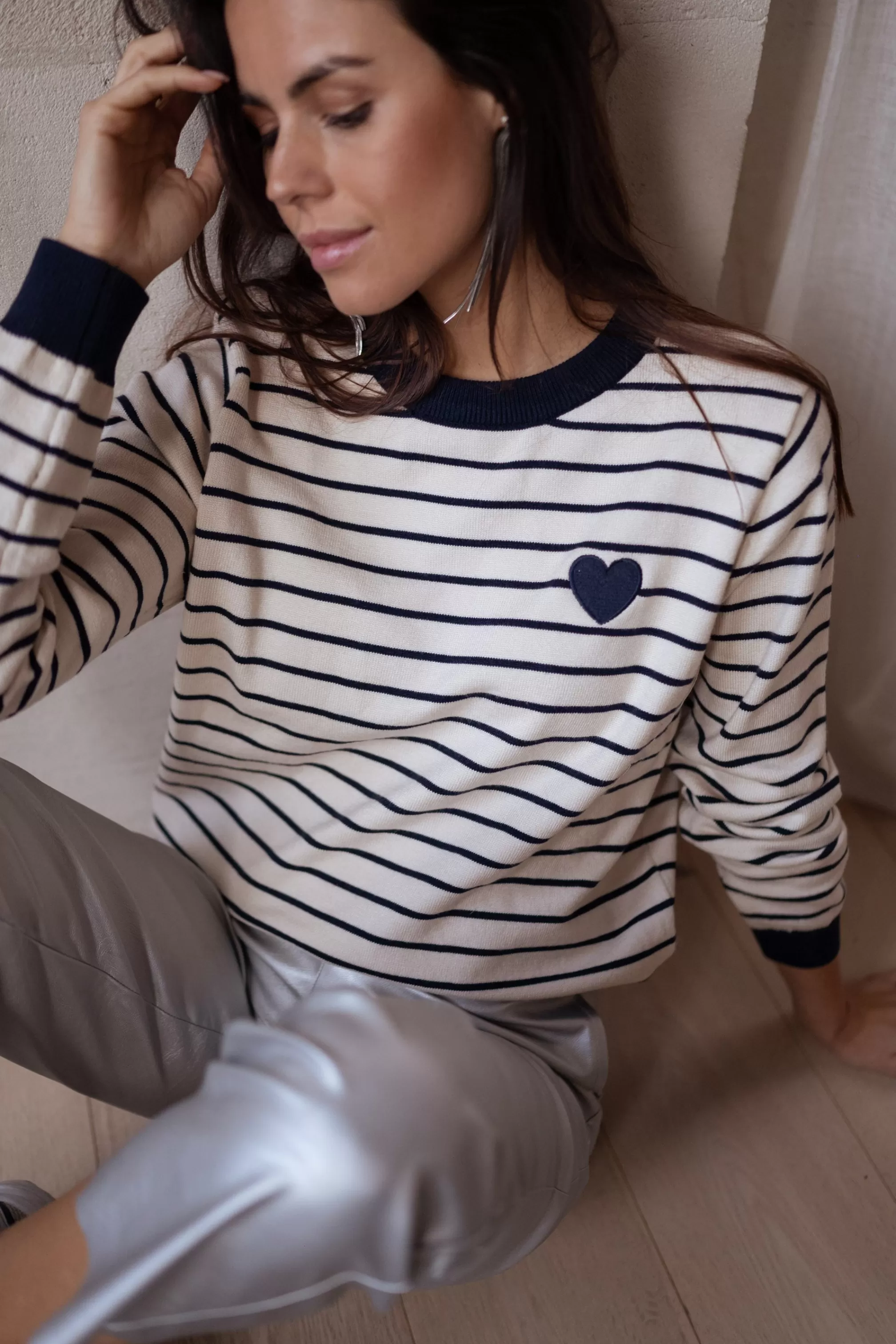 Ecru and blue sweater with lines Blue heart shape on the right Ophélie is 1m68, Lar…