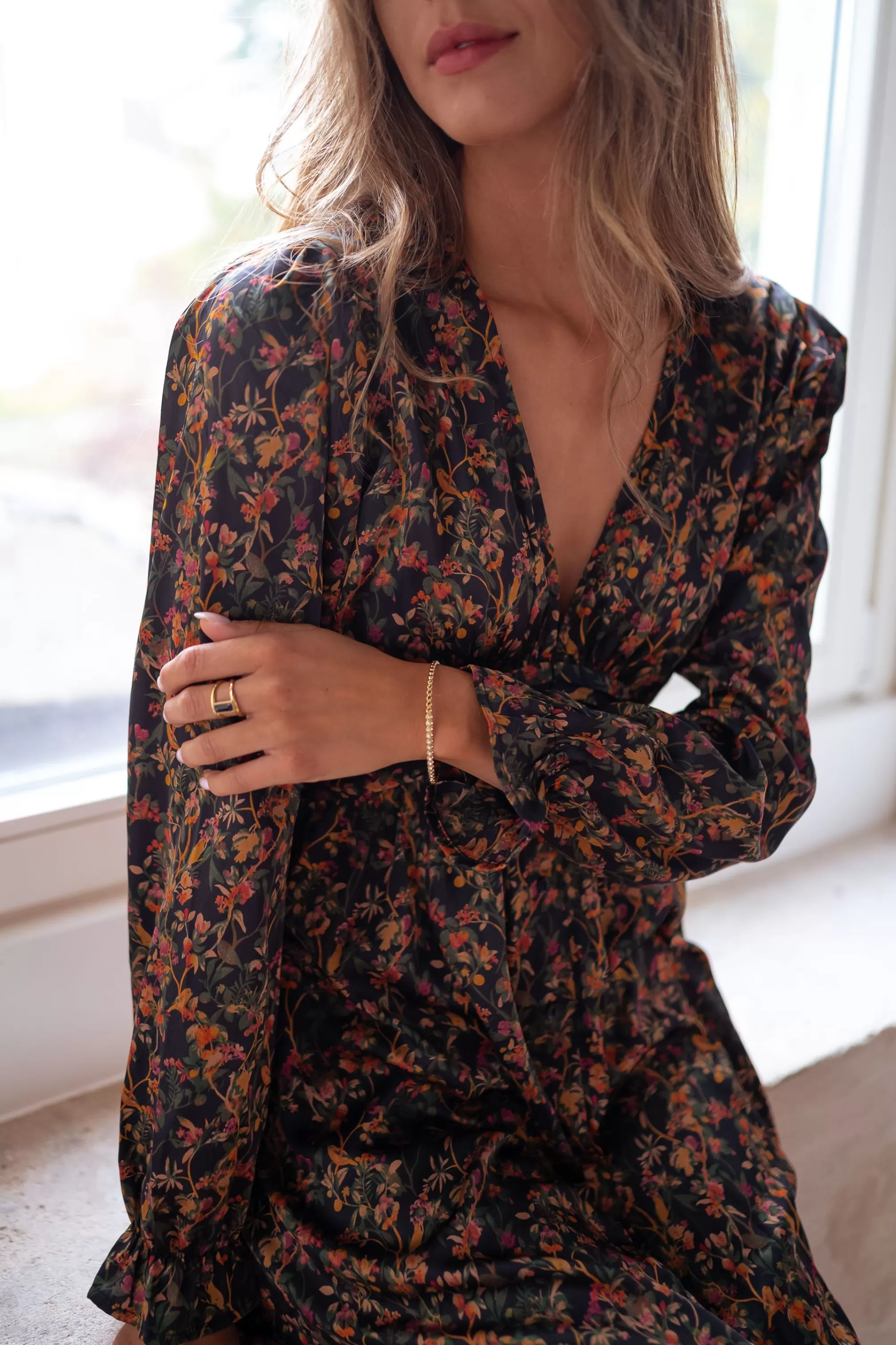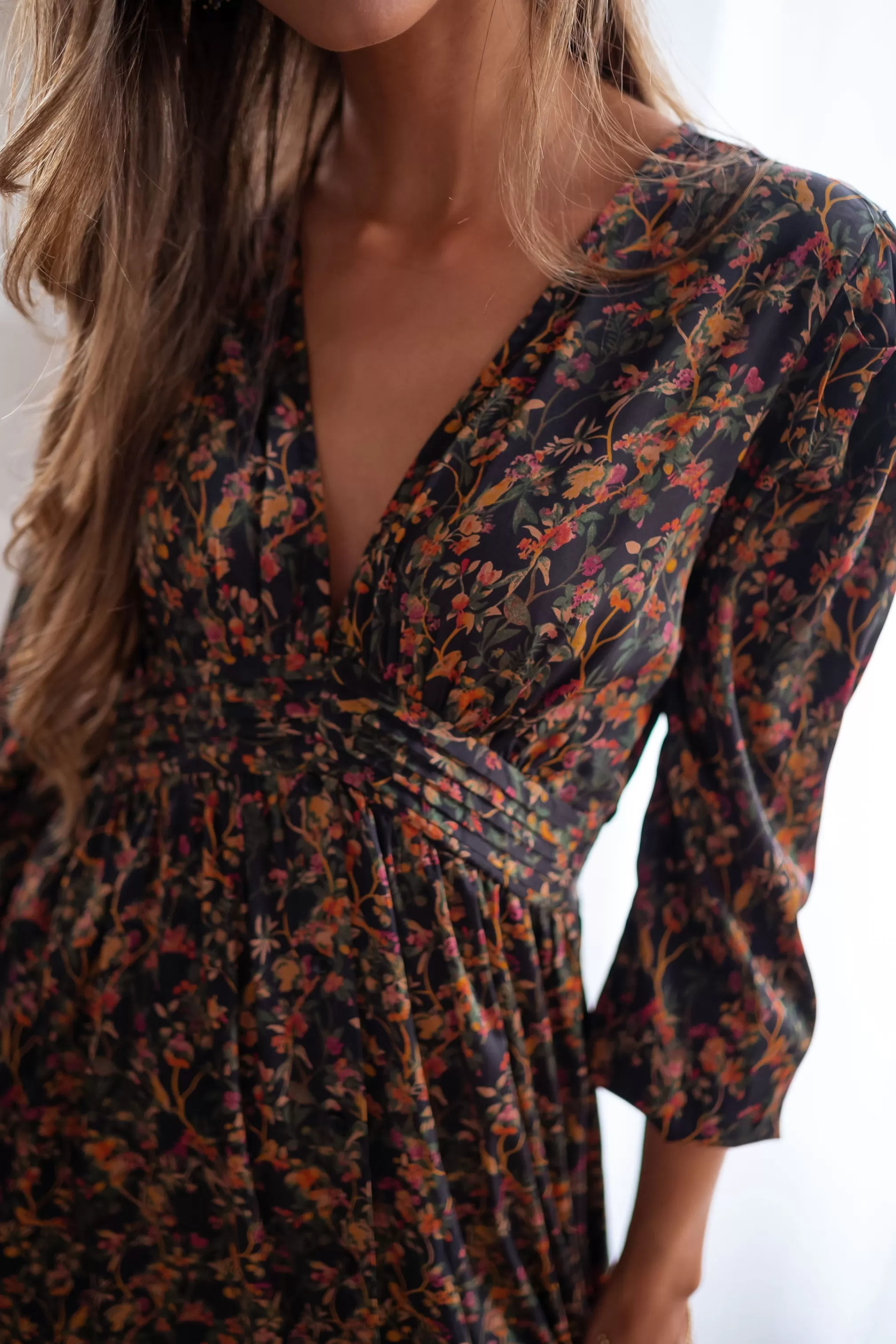 Long dressV neckLong sleevesSilk effect fabricElastic back at the waistPleated fabric under th…