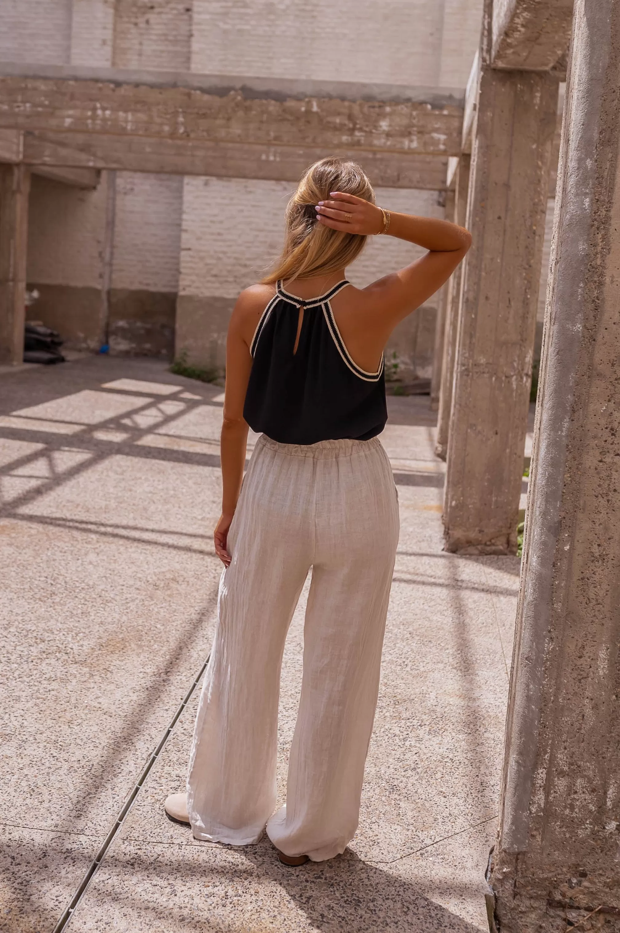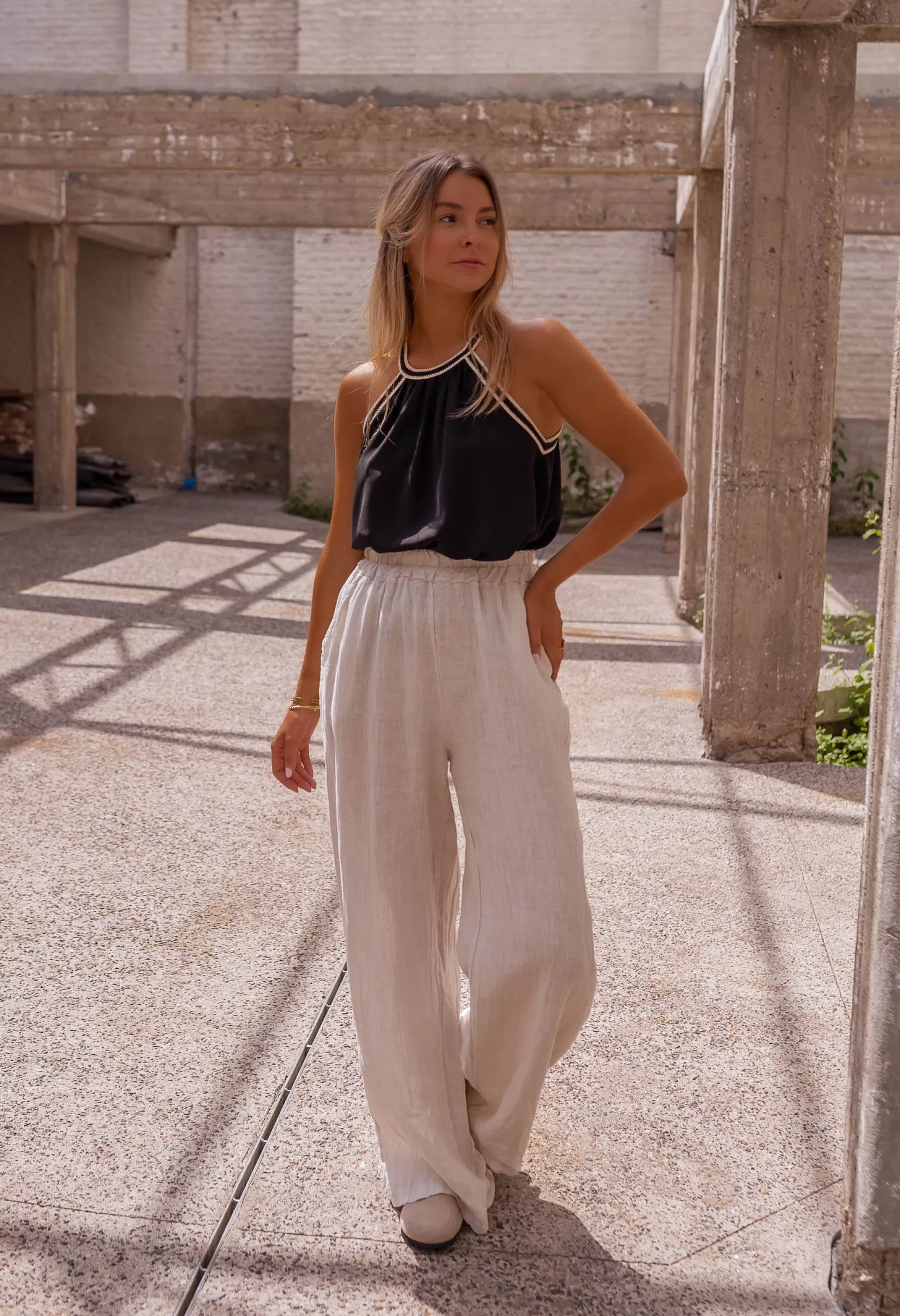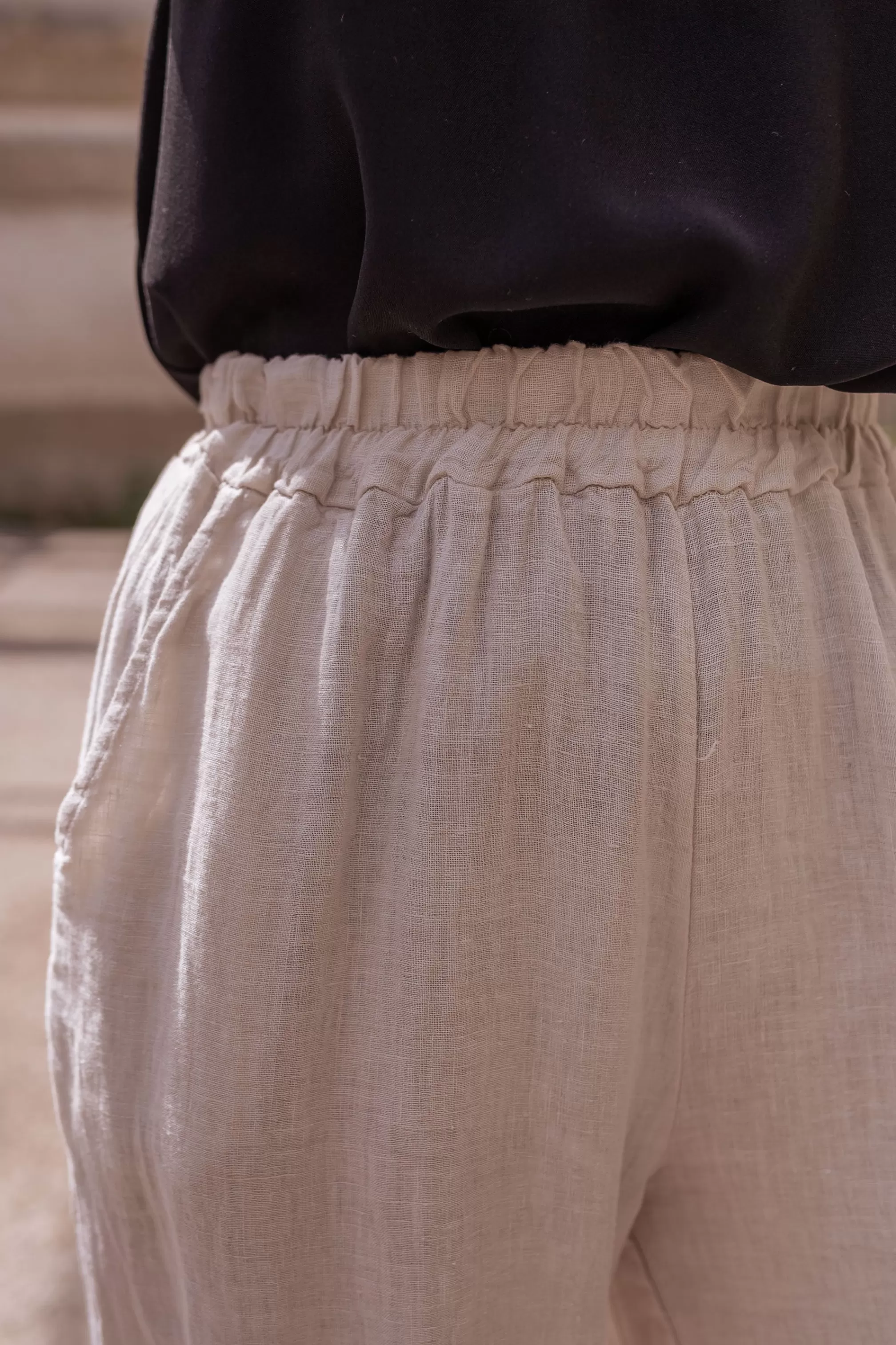 Elastic at the waistLong FluidLinenPockets on the front Slightly sheerOphélie is 1m…