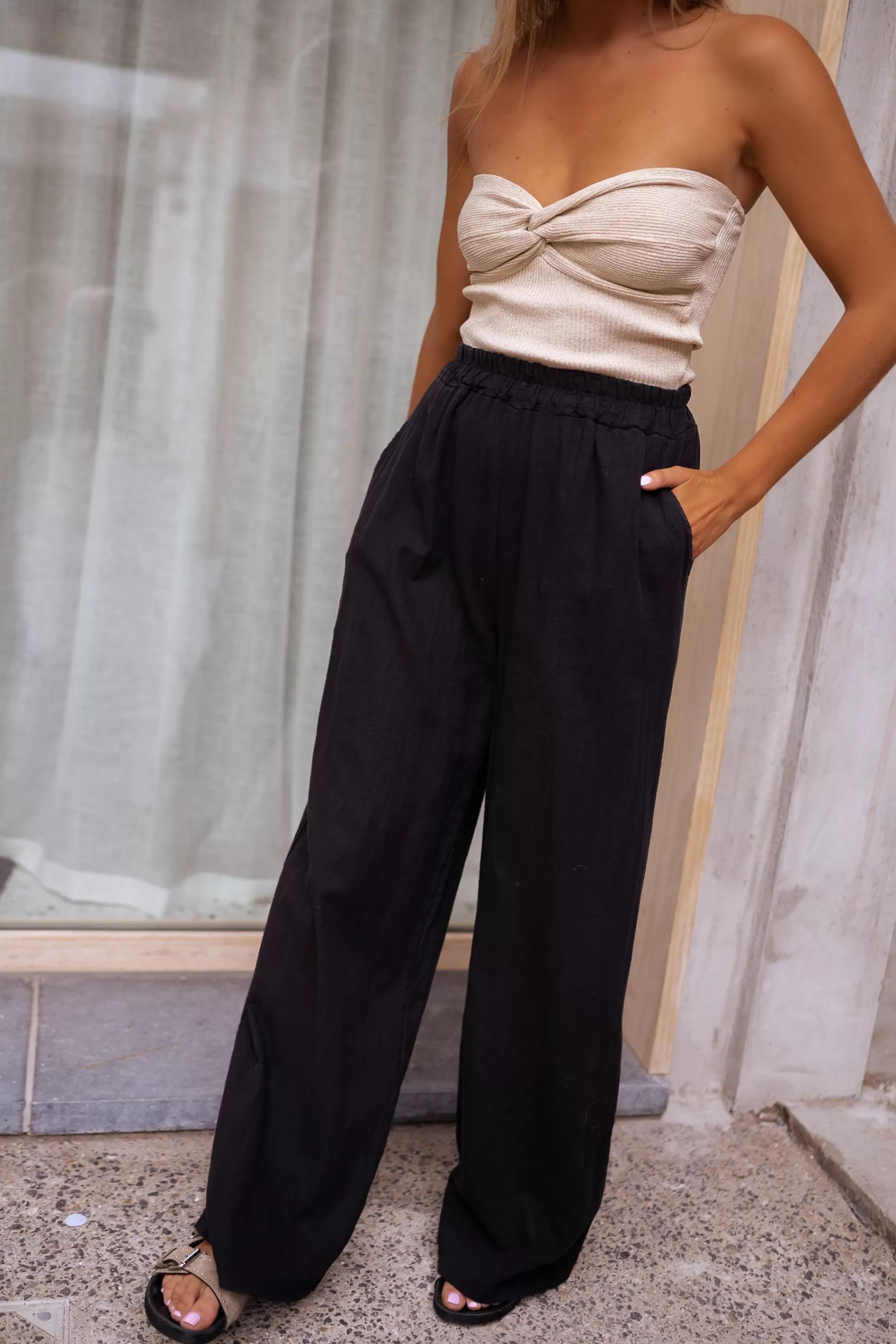 Elastic at the Size Long Fluid Linen pockets At the front of the pants Slightly transparent O…