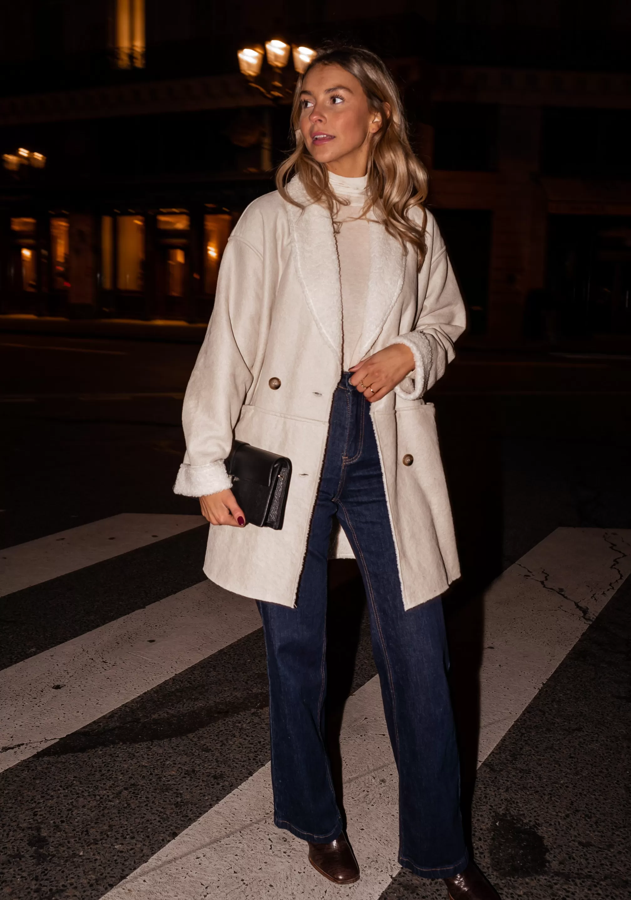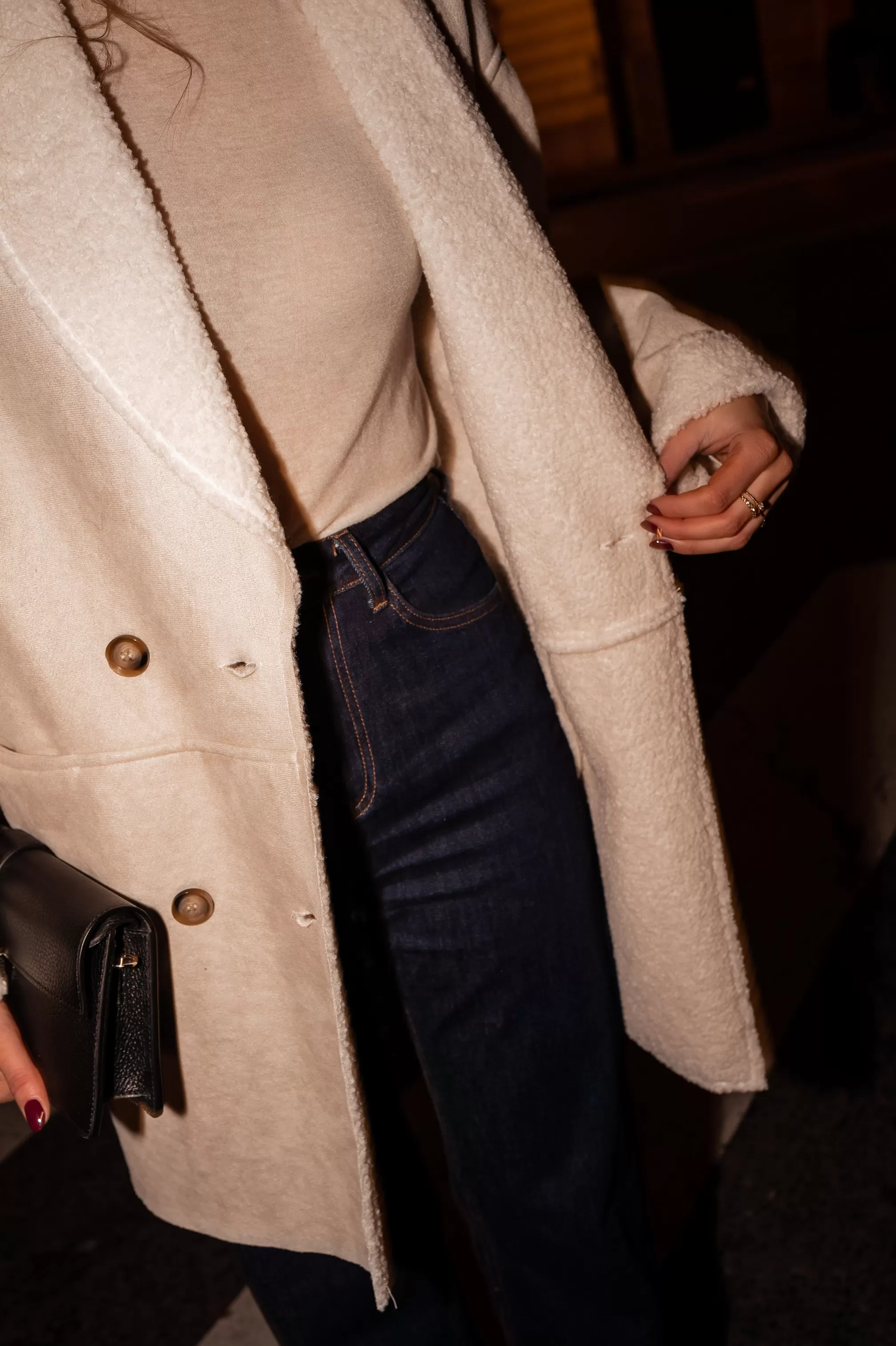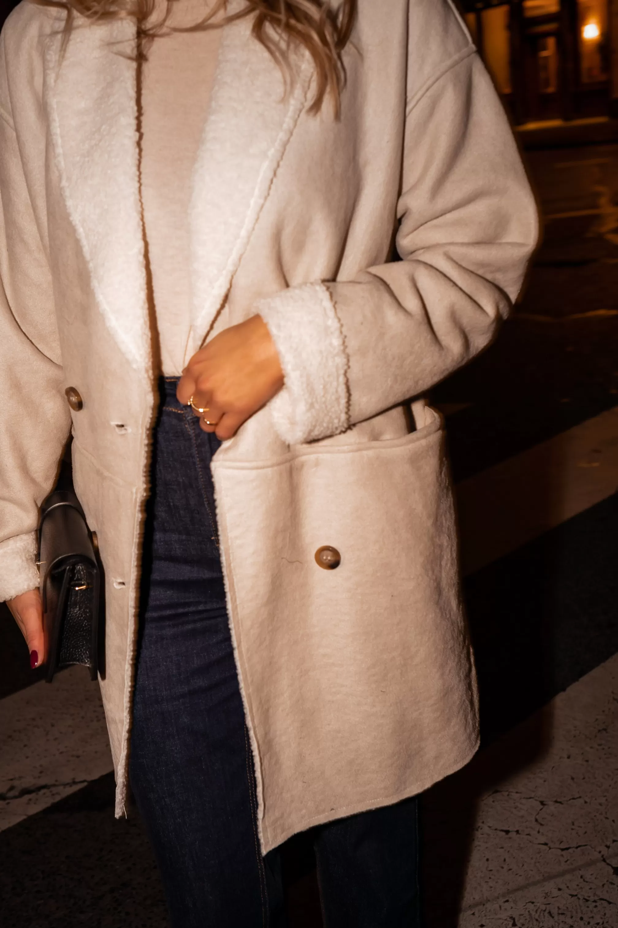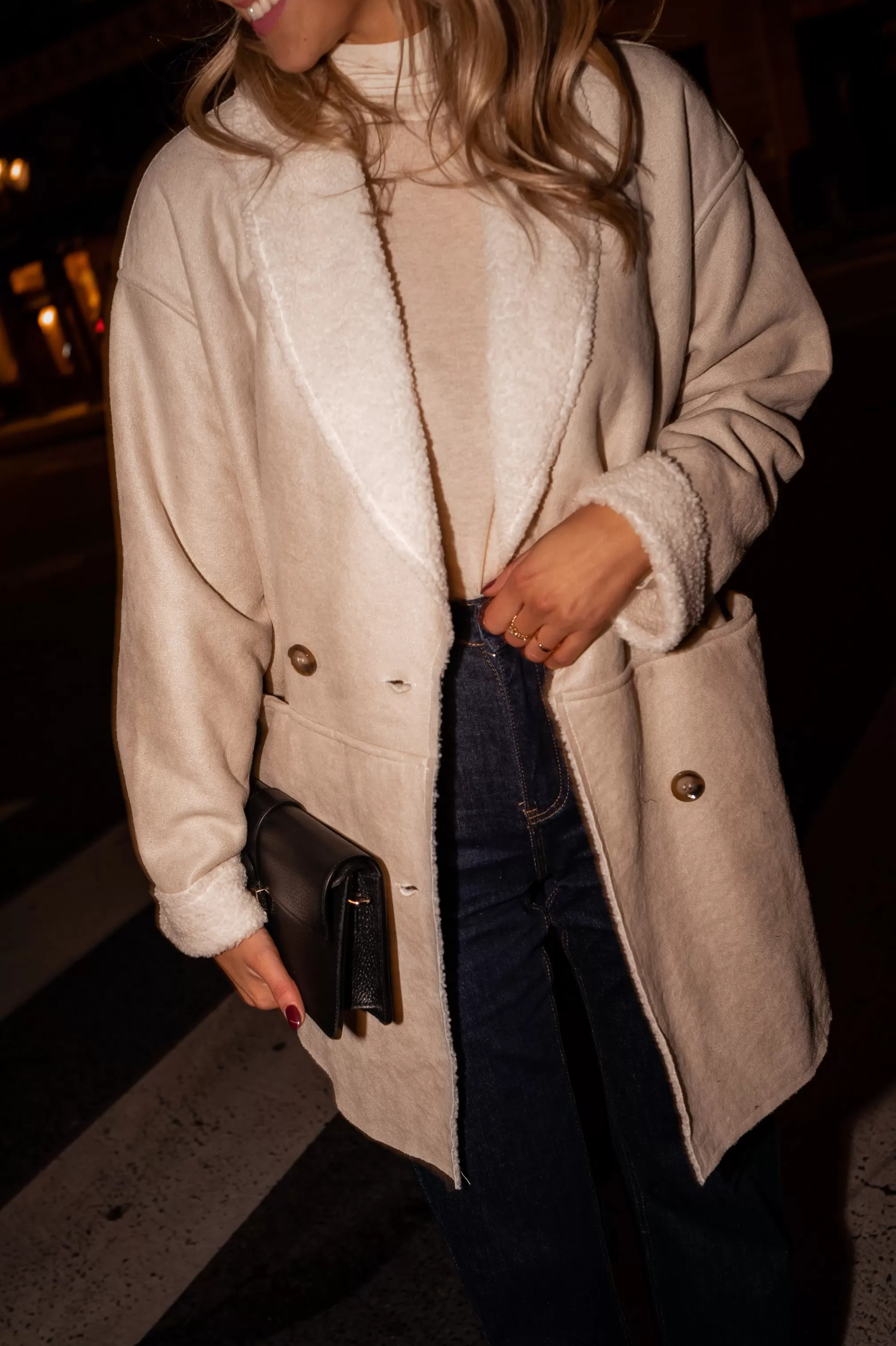 - Beige faux sheep fur coat