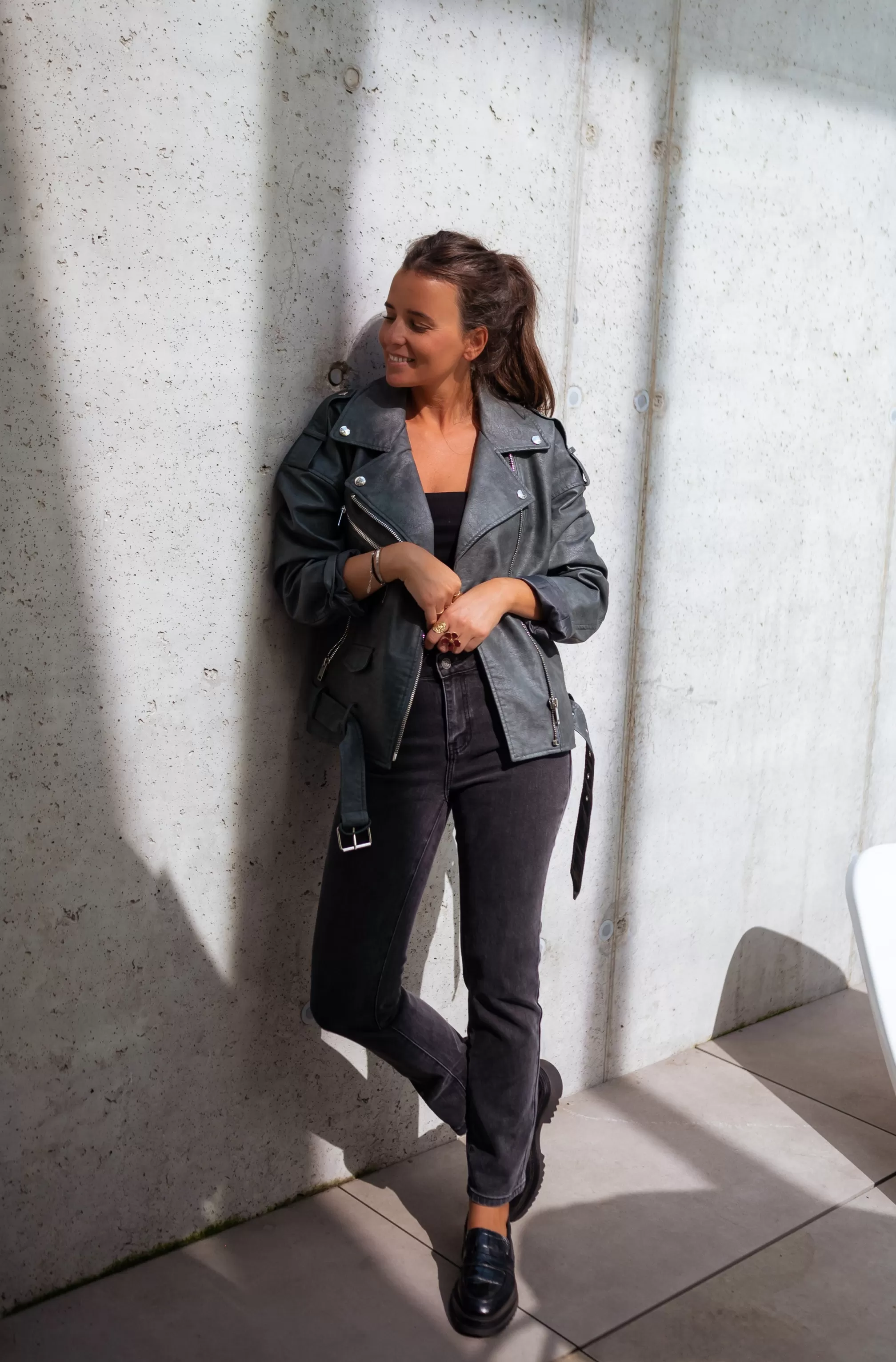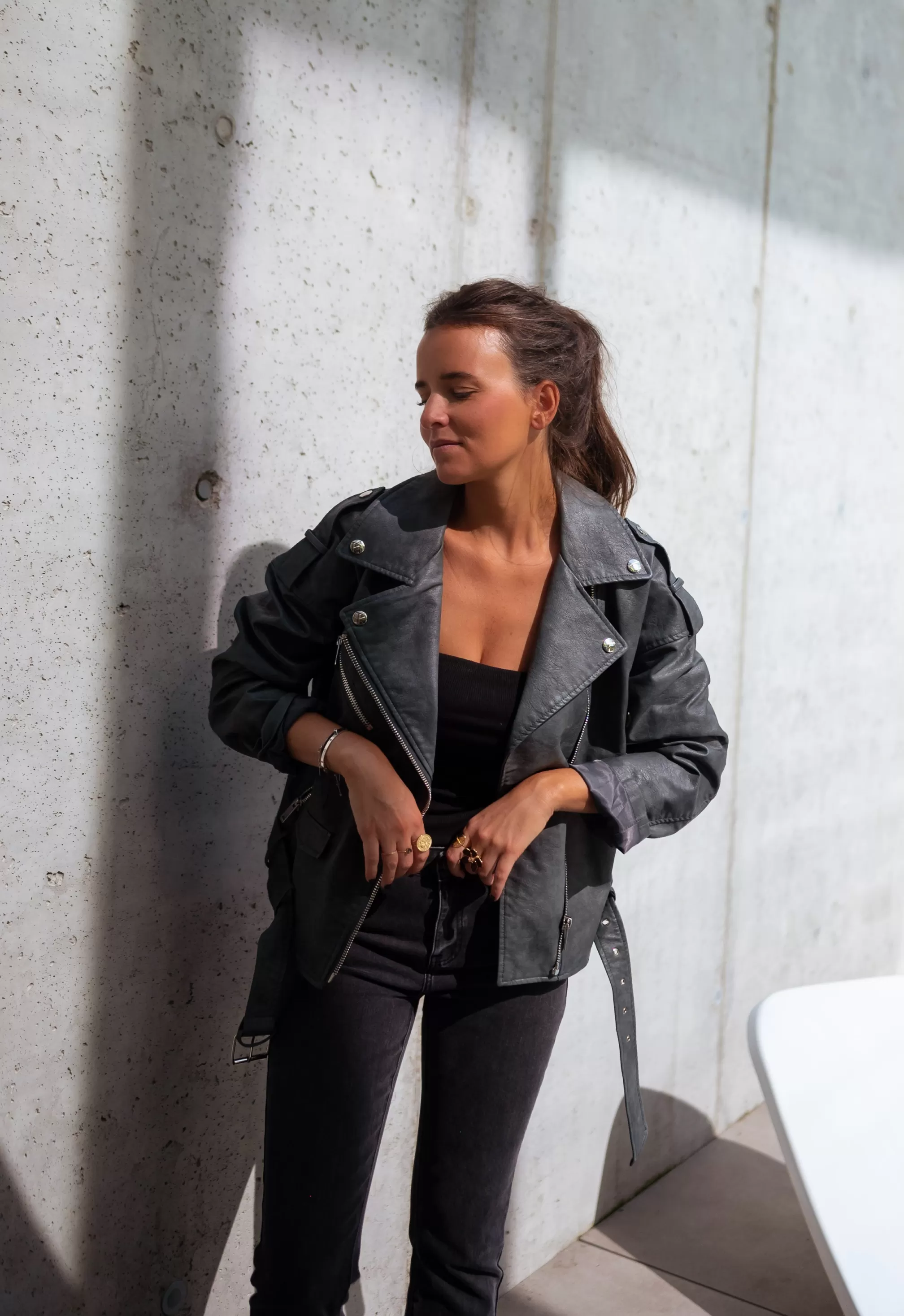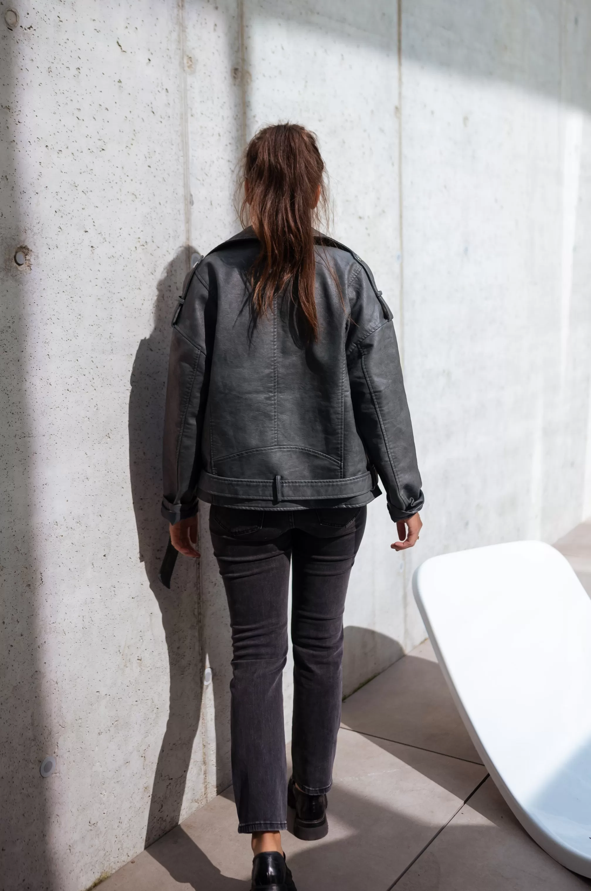 Long sleevesLeather effectSoft LinedSilvery buttons and zipperSlightly looseBelt at the b…