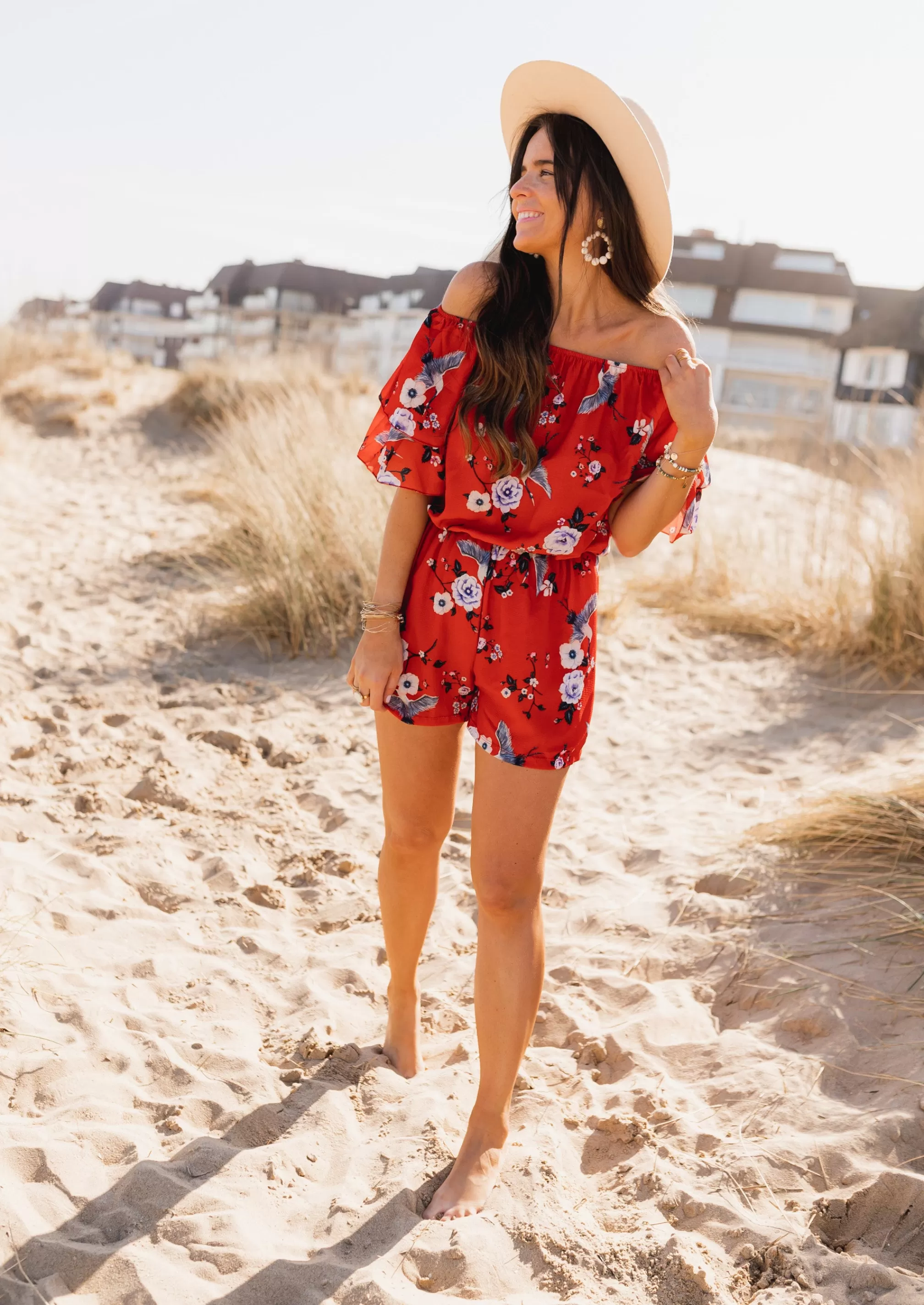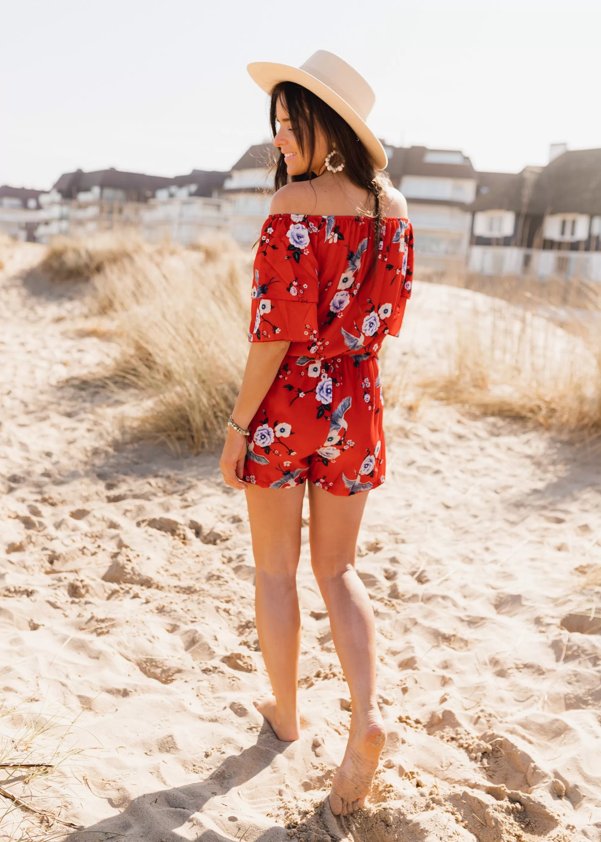 Strapless jumpsuitRed background with patternsMarine is 1m70 and wears a size SElastic waistNo…