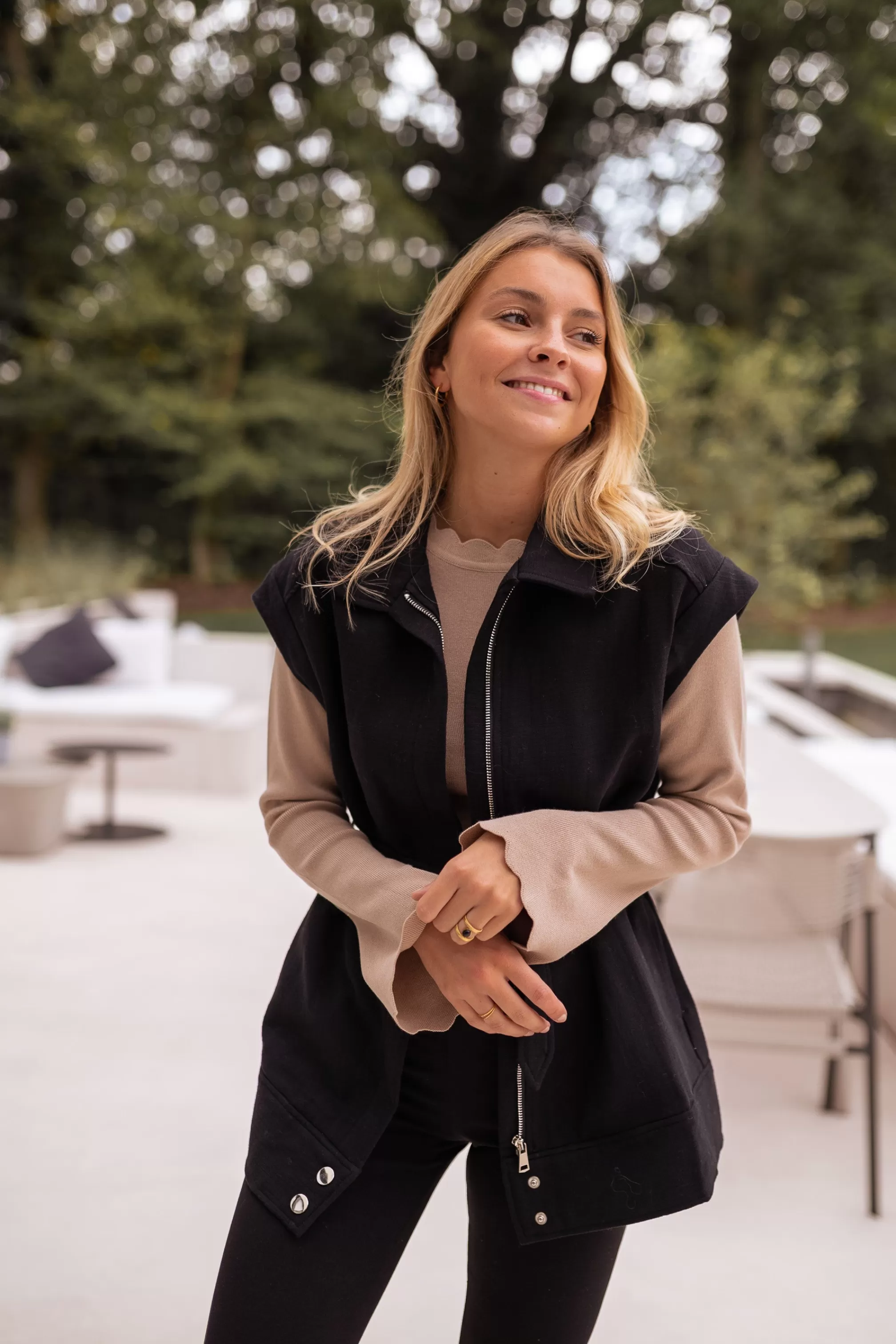 - Silver press stud at bottom