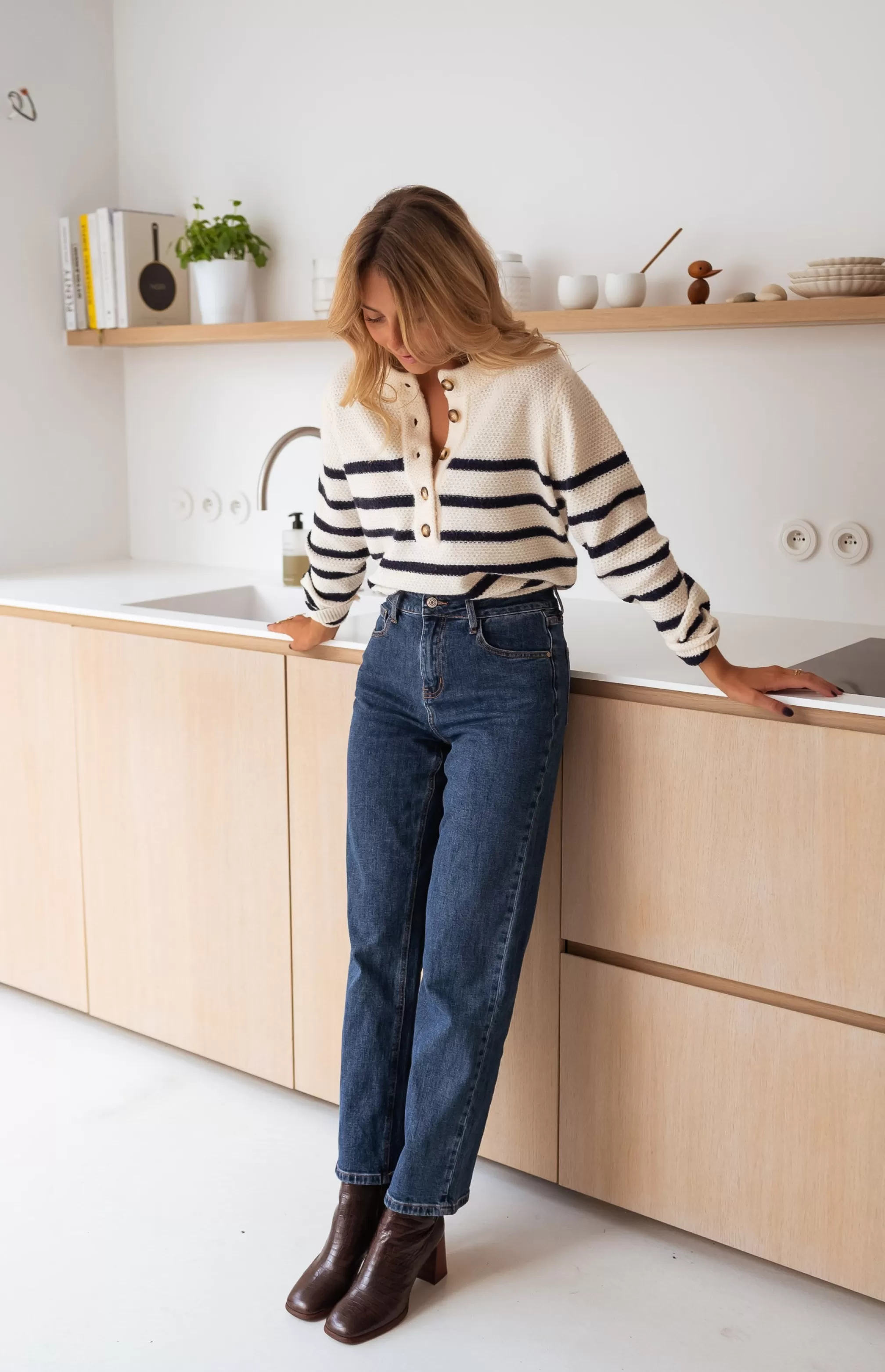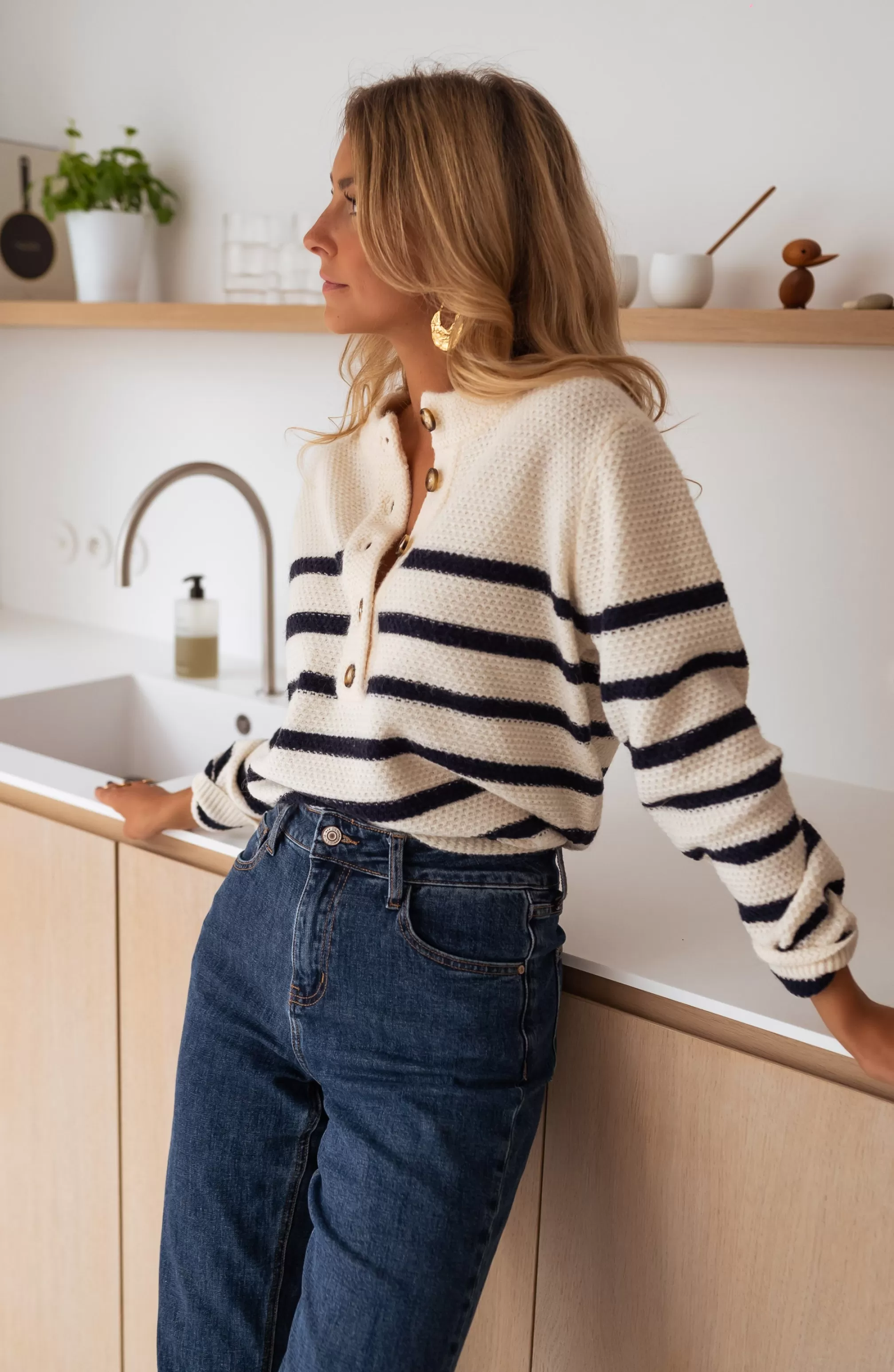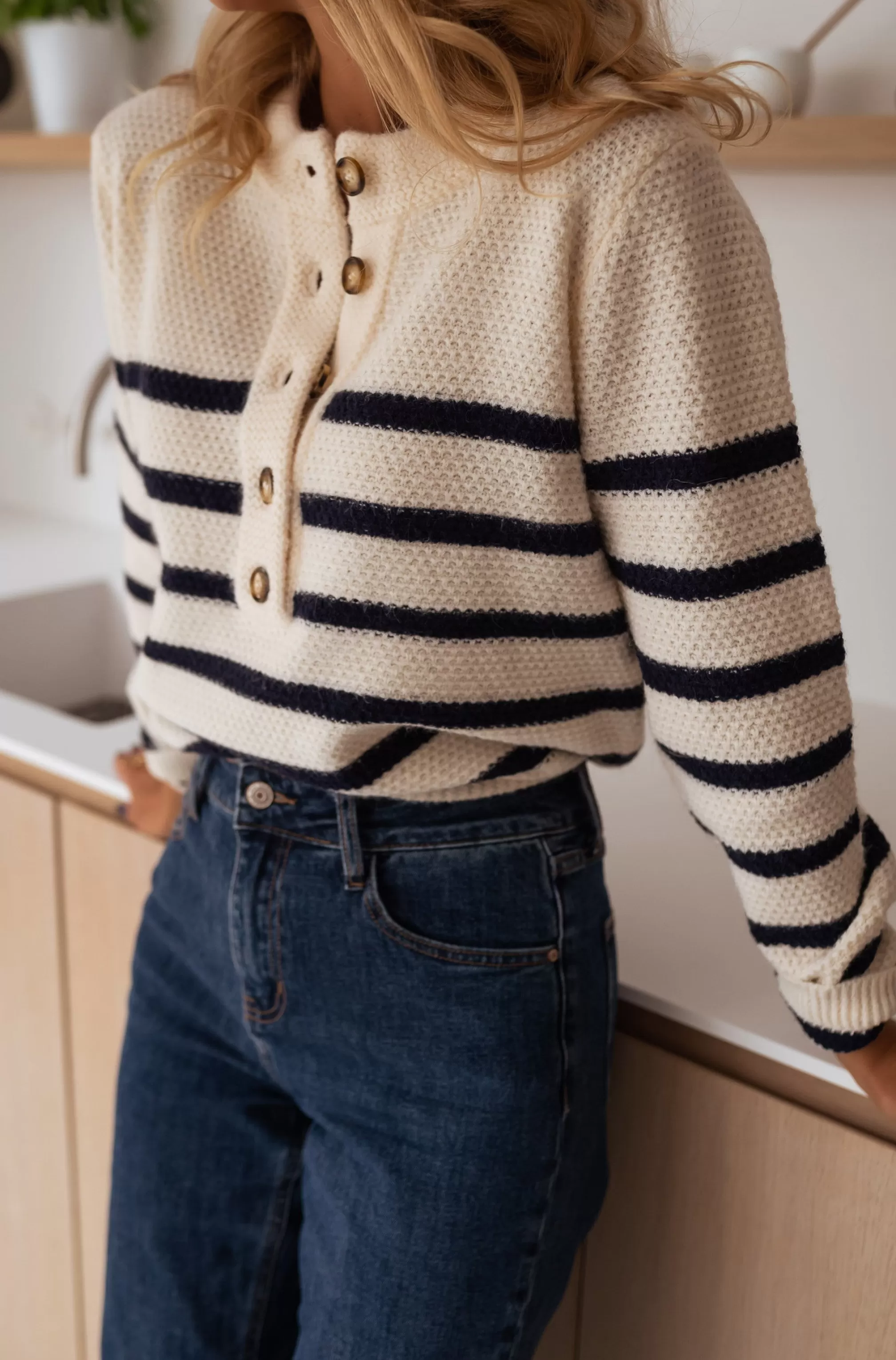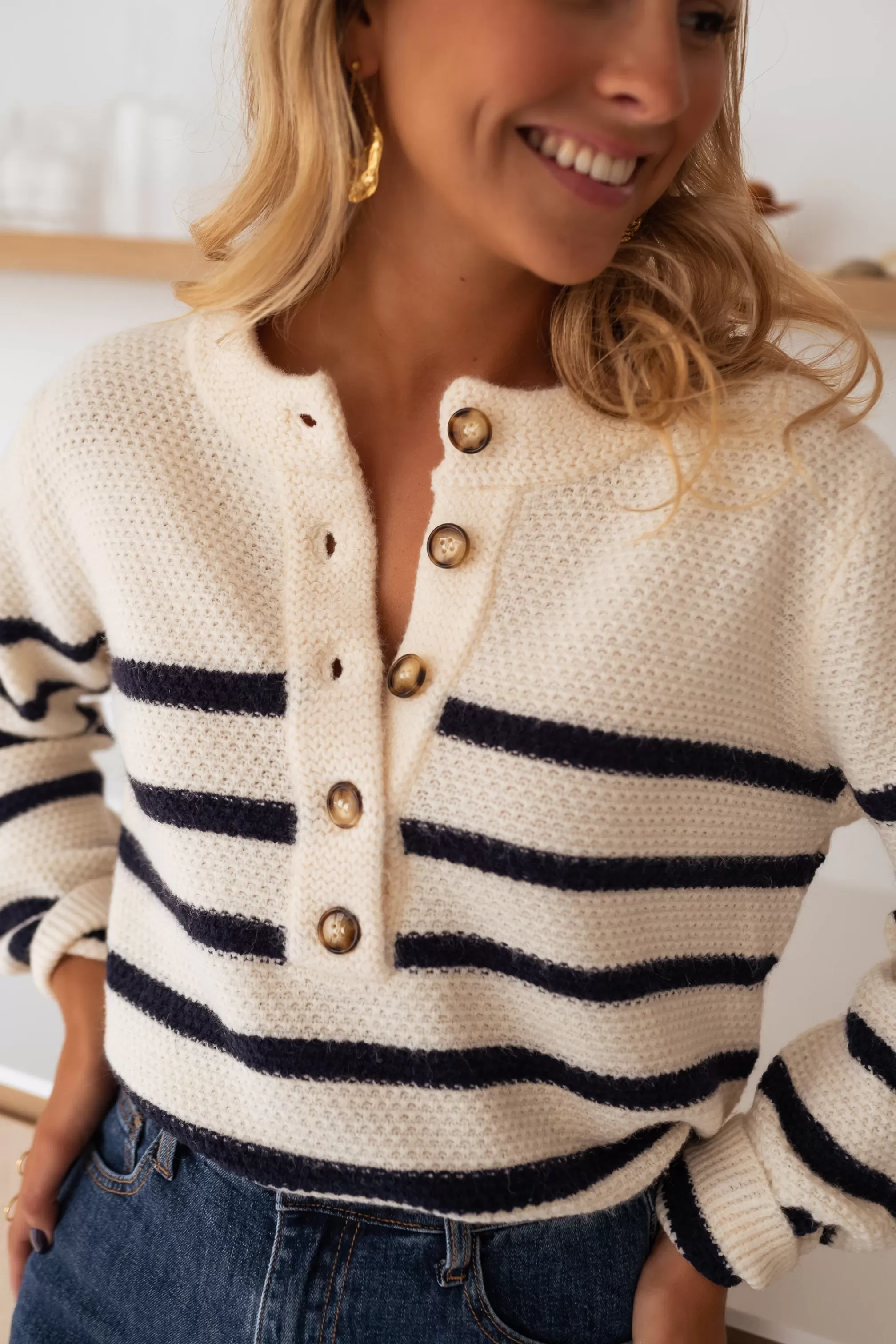 Long sleevesRound collarSoftButtons at bustMarinièreDark navy blue linesONE SIZE (fits sizes …
