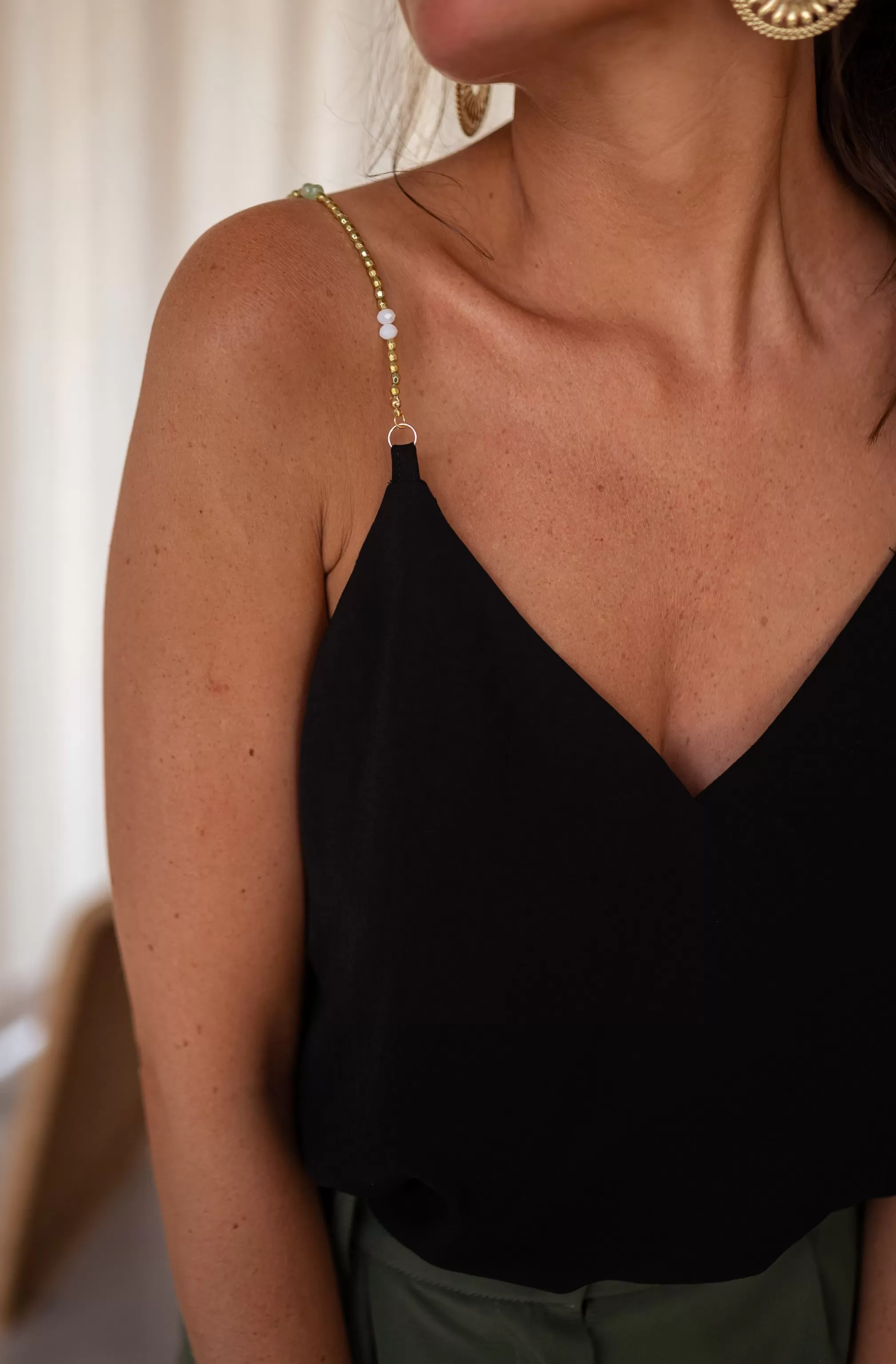 Straps with pearls Not adjustable straps Lining V-neck on the front …