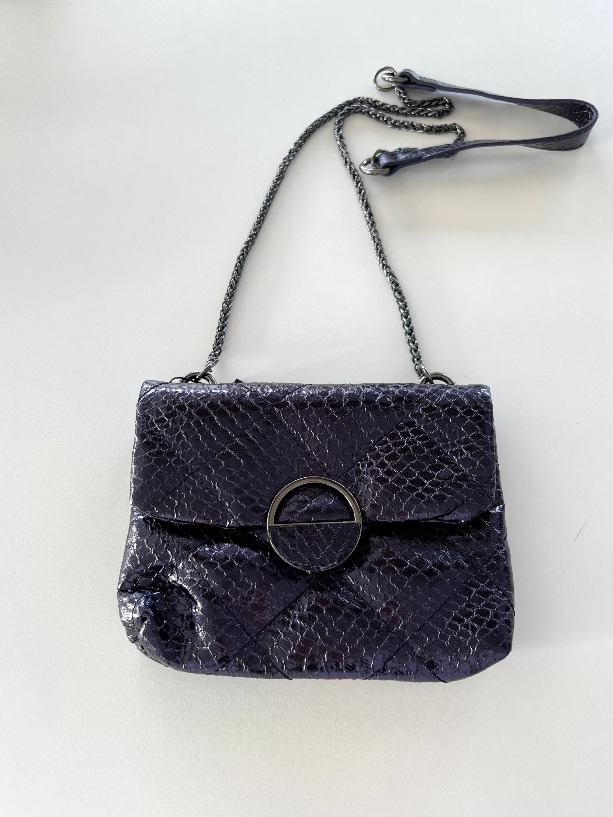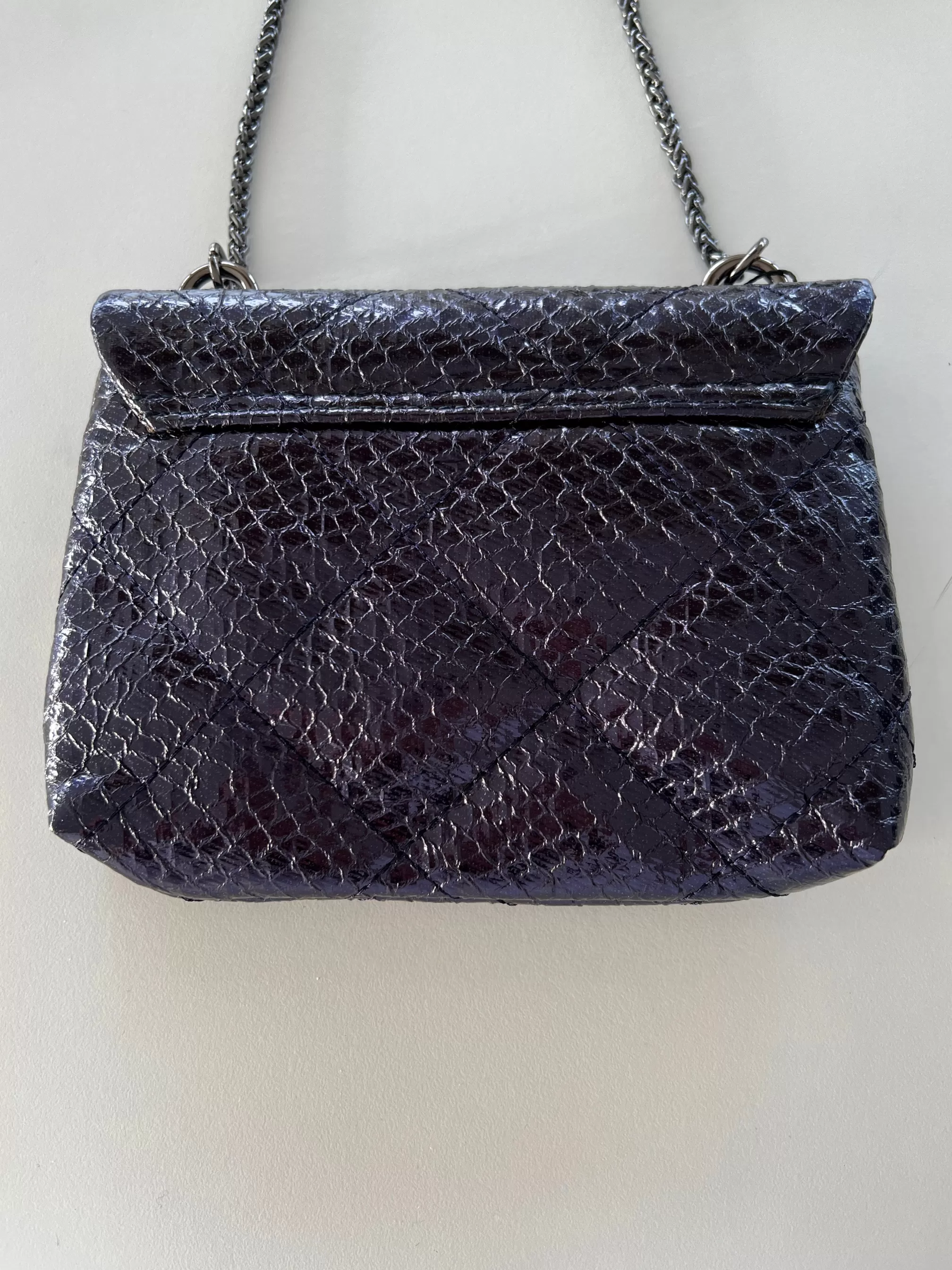 Rectangular shape Bag strap providedMetallic sheenPurple sheenDark silvery finishLength 1…