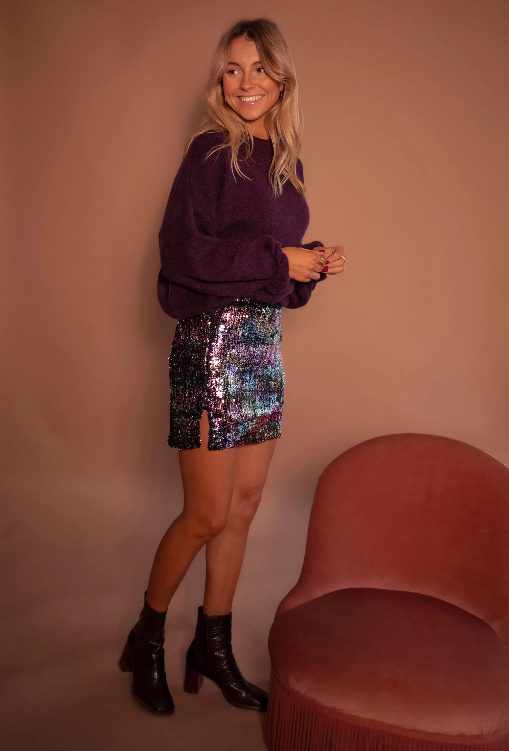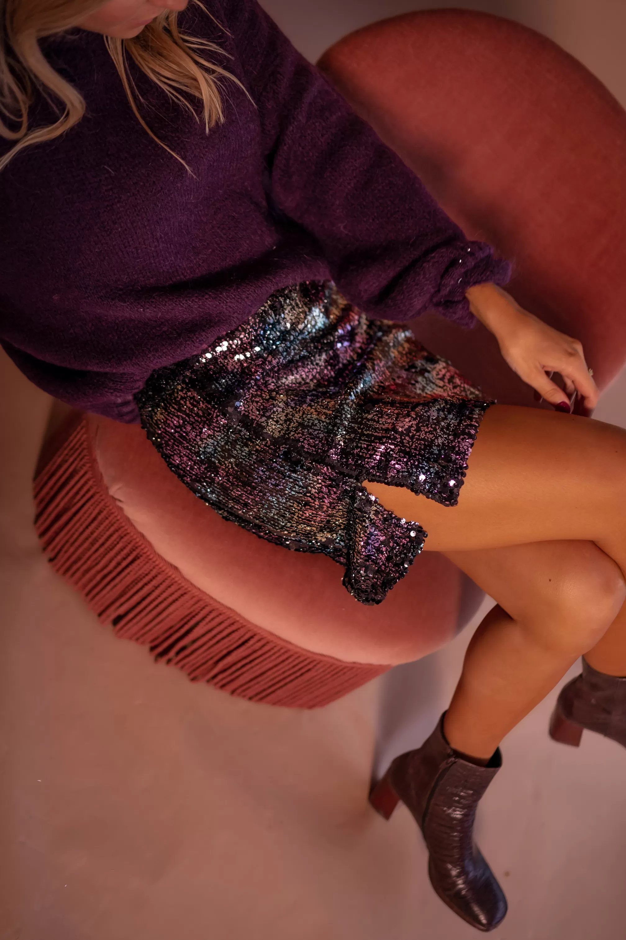Mini skirtSplit on the side Slightly tightLiningGlitters with purple, golden, seagreen an…
