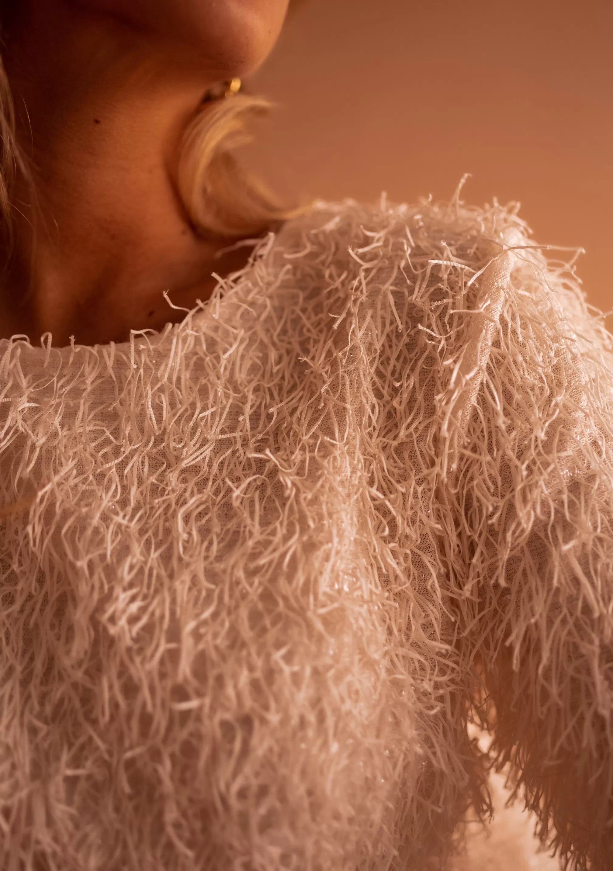 Deep neckline in the backRemovable silvery chainsBackground slightly glittery Ecru thread…