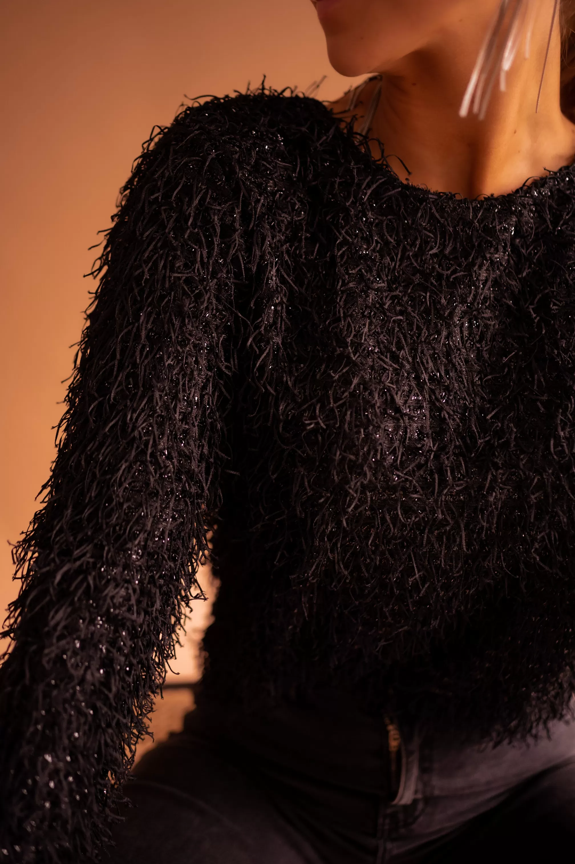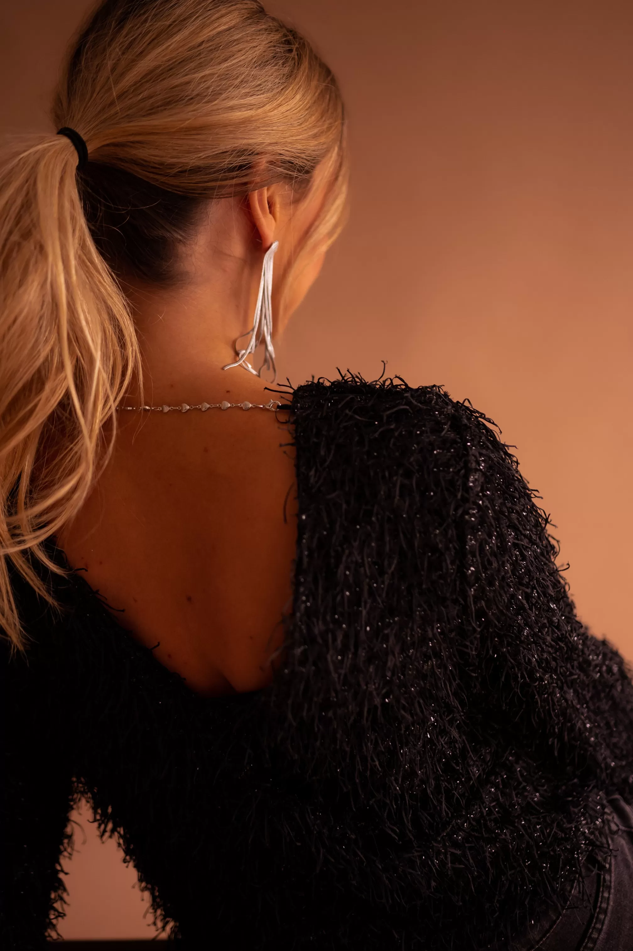 Deep neckline in the backRemovable silvery chainsBlack threads all over the blouseBackground s…