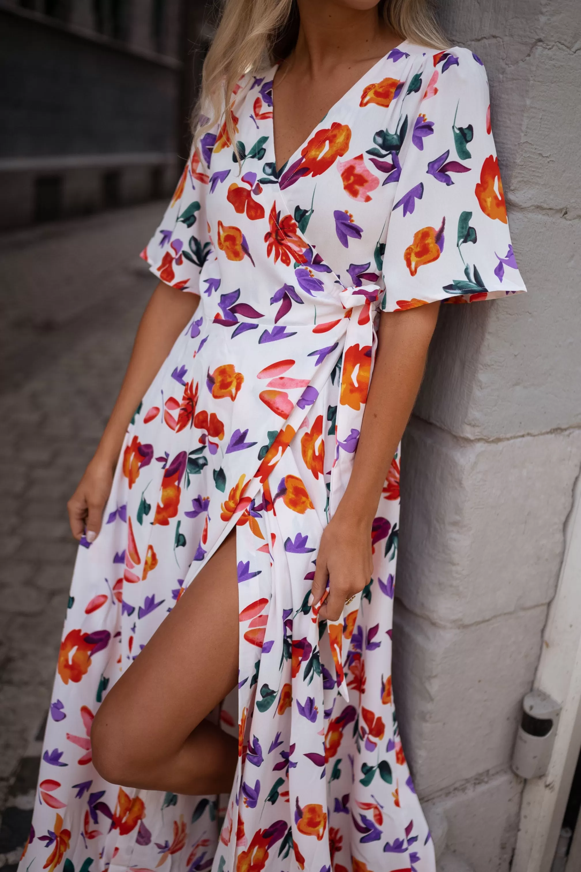 Short flared sleevesFloral patternWrap front Adustable bow to tieFluid Sizes :…