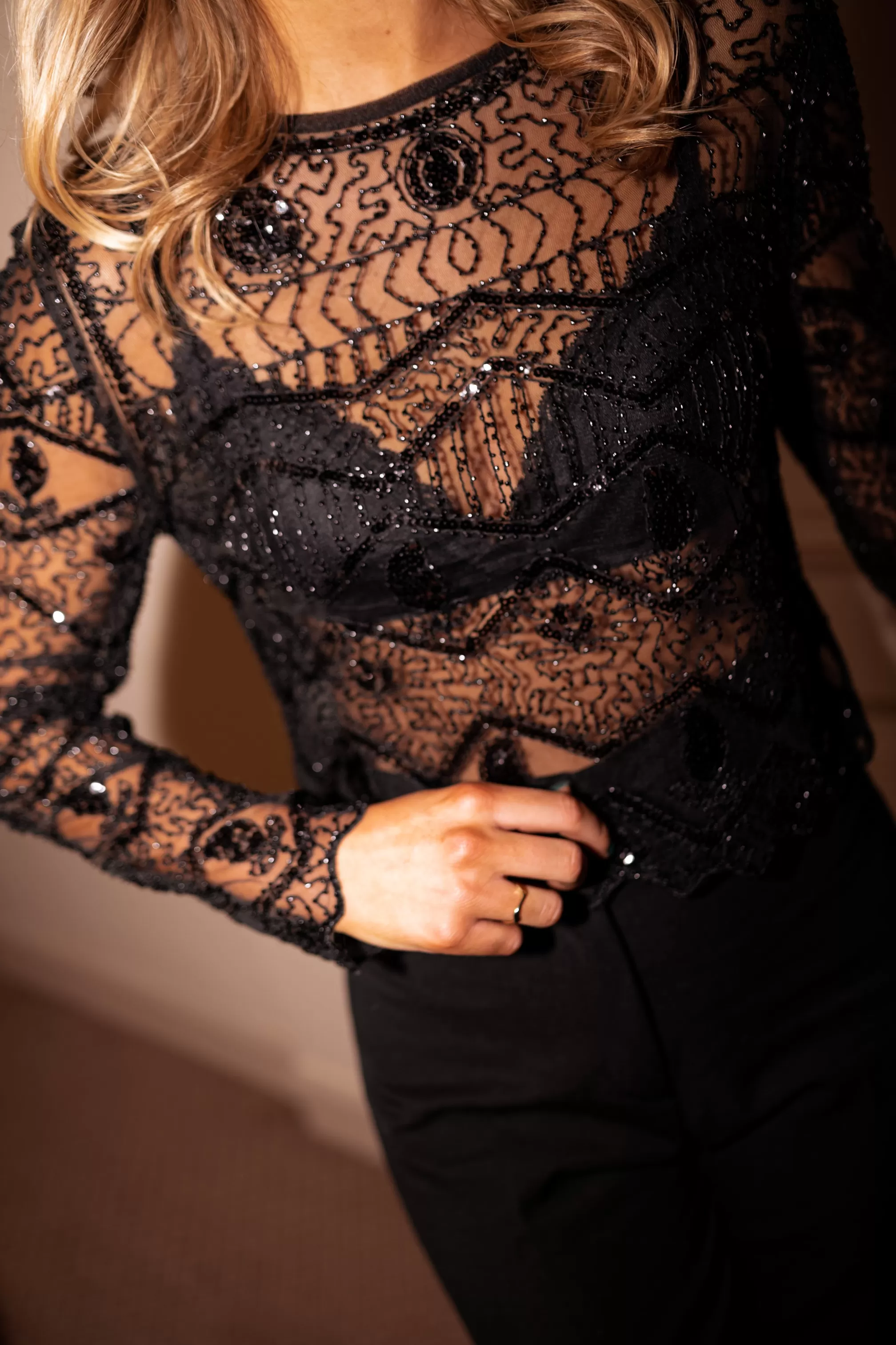 Transparent embroidered with pearls Long sleevesCrewneckSizes : S-M / M-L S-M : Leng…