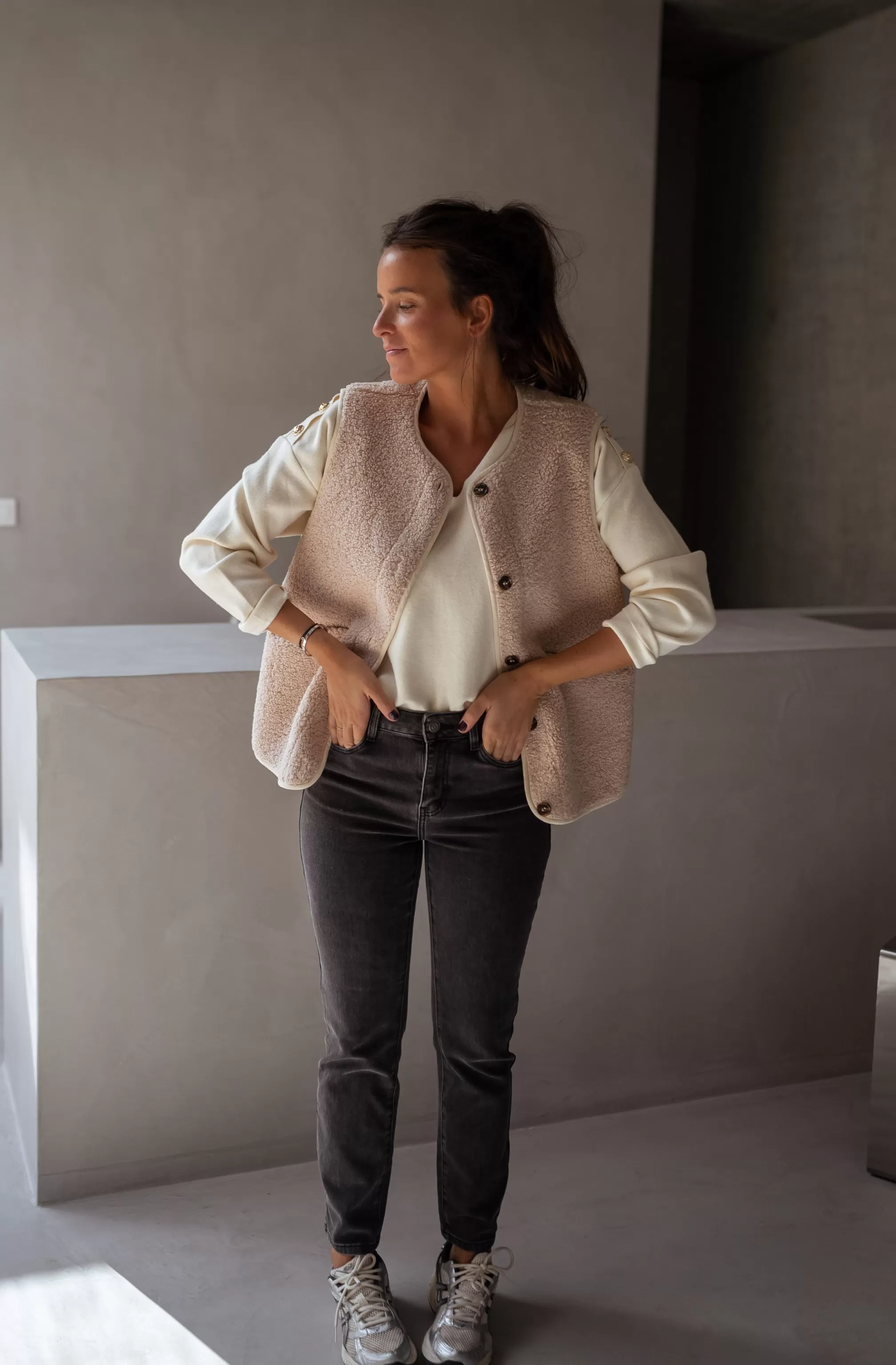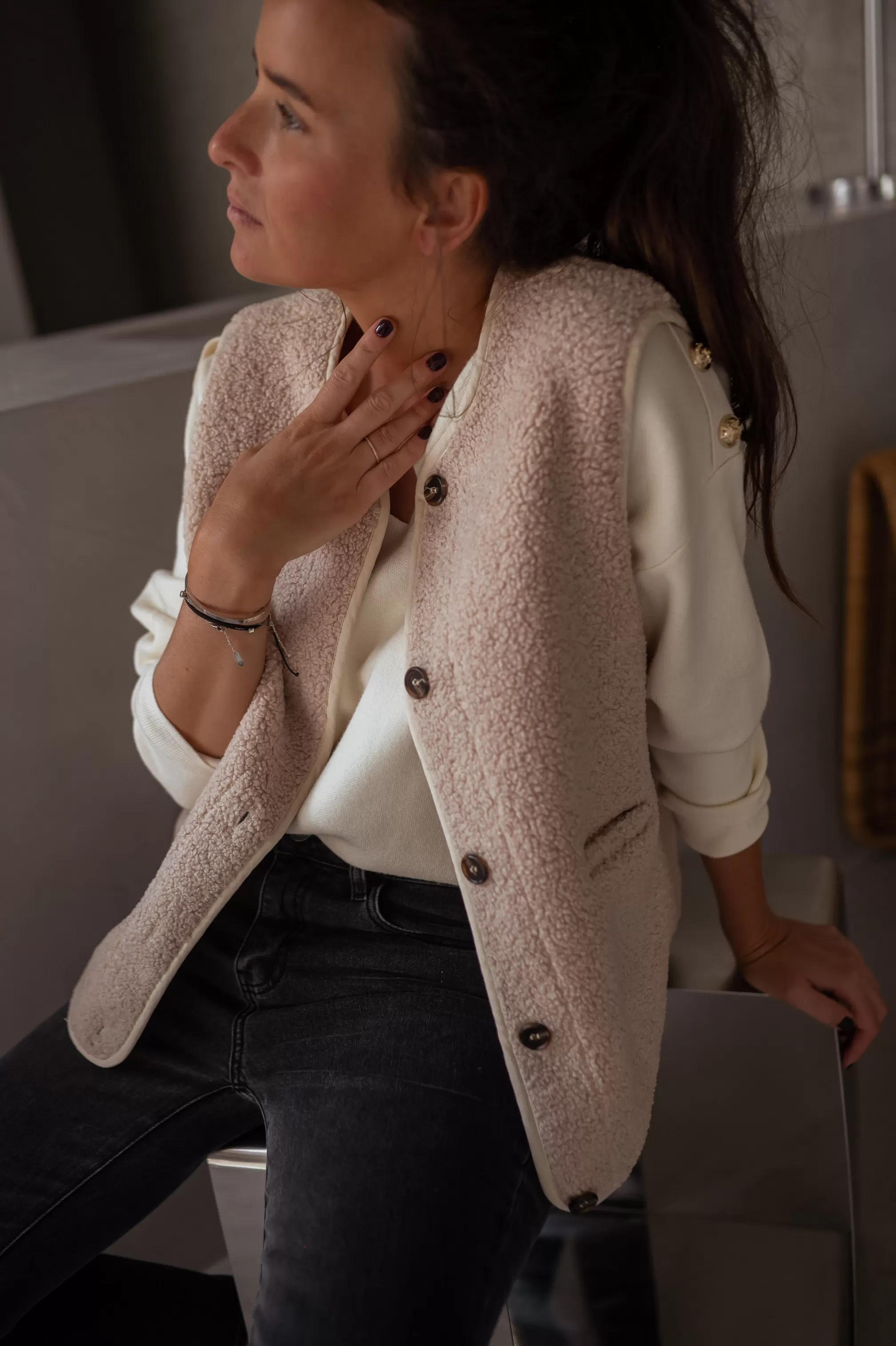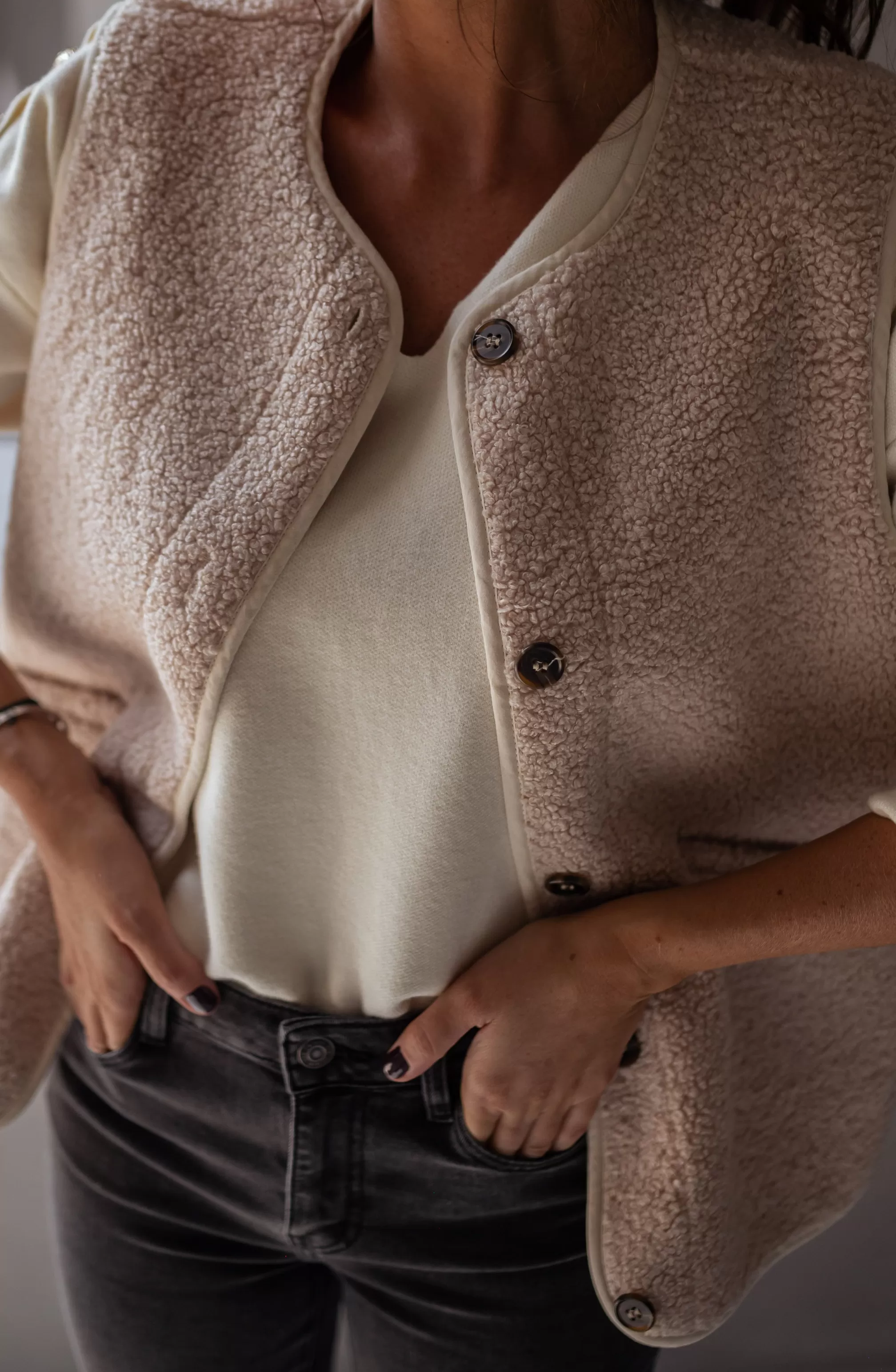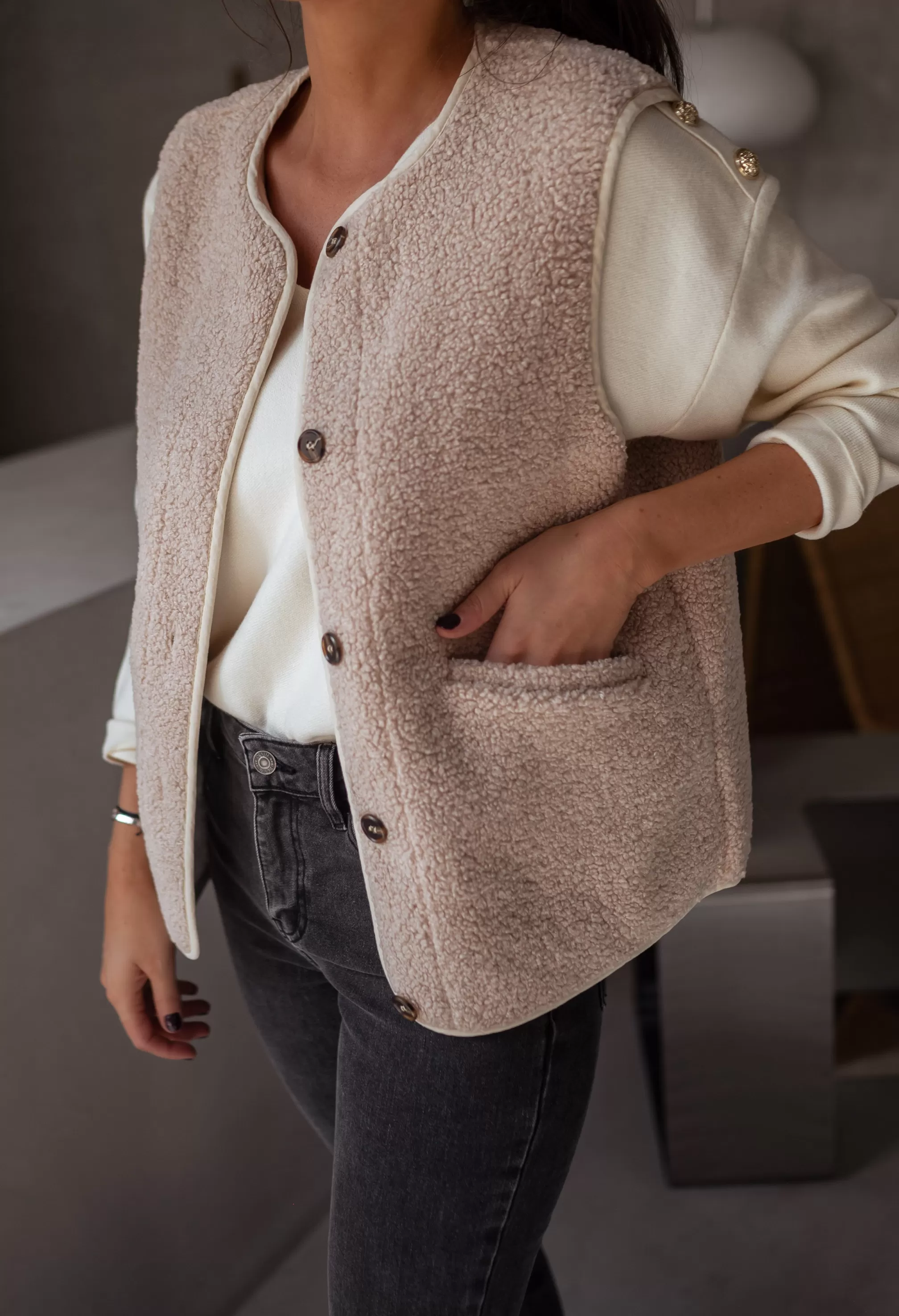 Sleeveless cardiganTeddy cotton effectBrown buttons Pockets on the front Lining …
