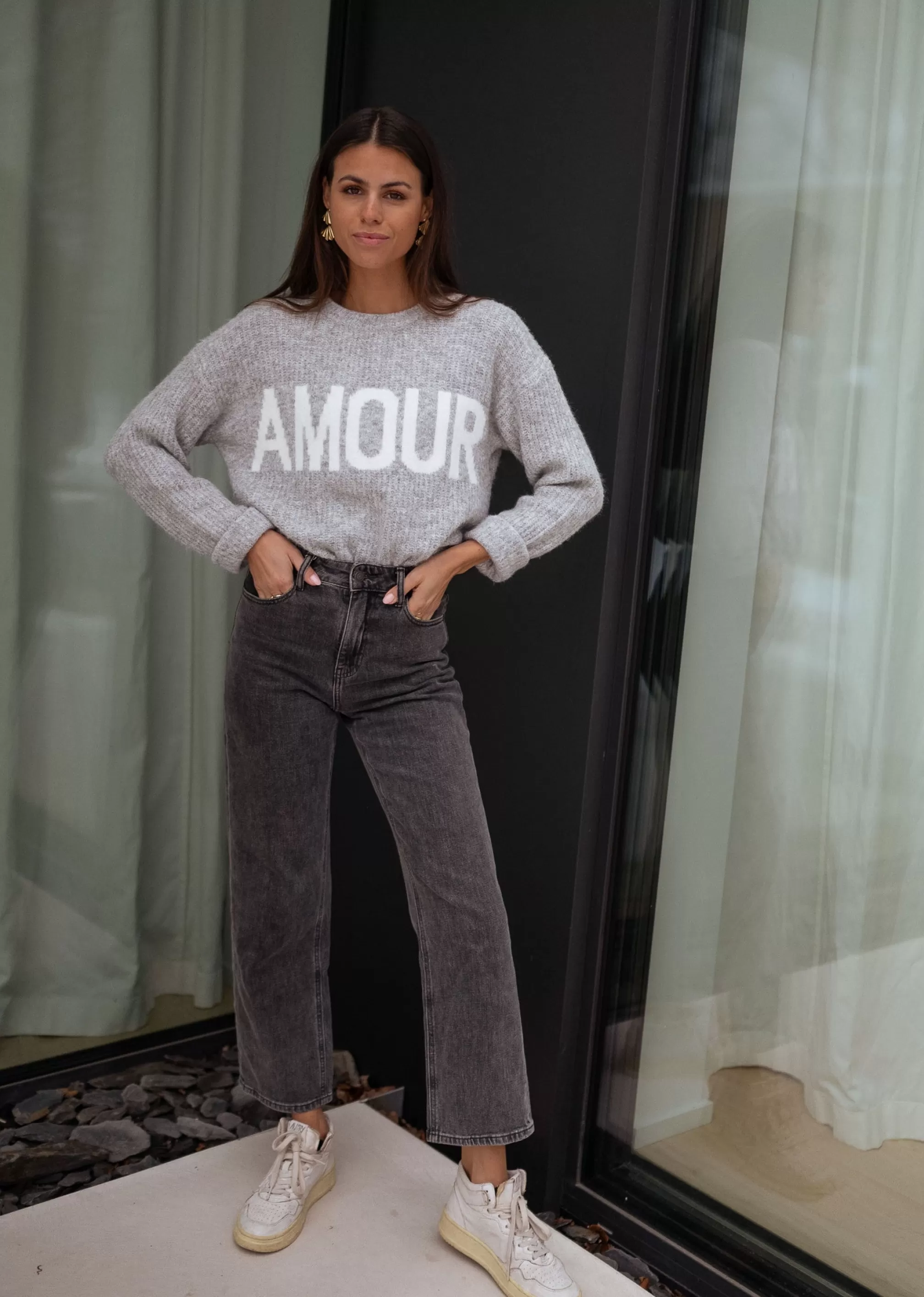 White writing “AMOUR” Long sleevesOphélie is 1m68, Larissa is 1m74 and both usually …