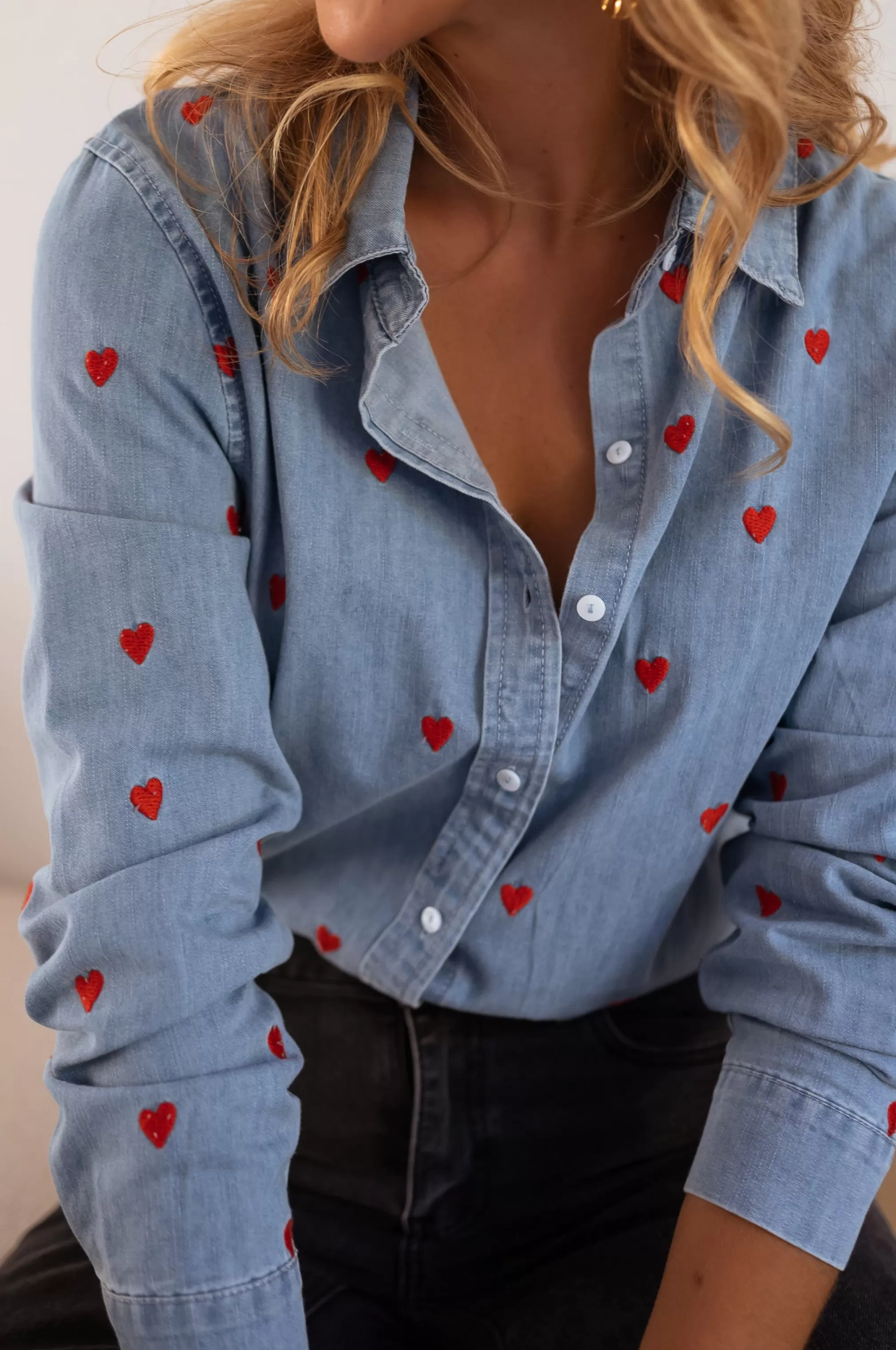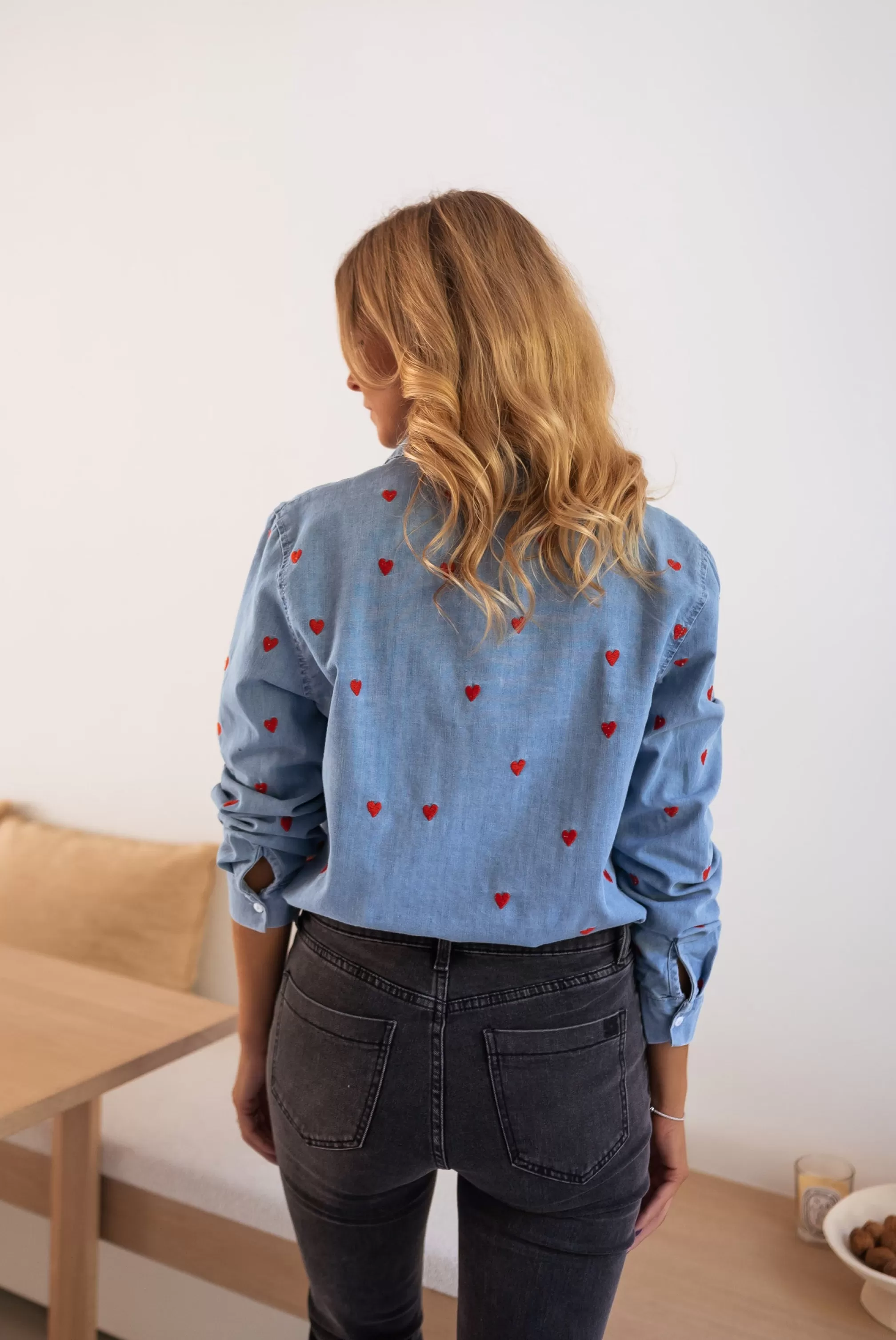 Long sleevesRed hearts Light denim shirt Fluid Ecru buttons all along the shirt…