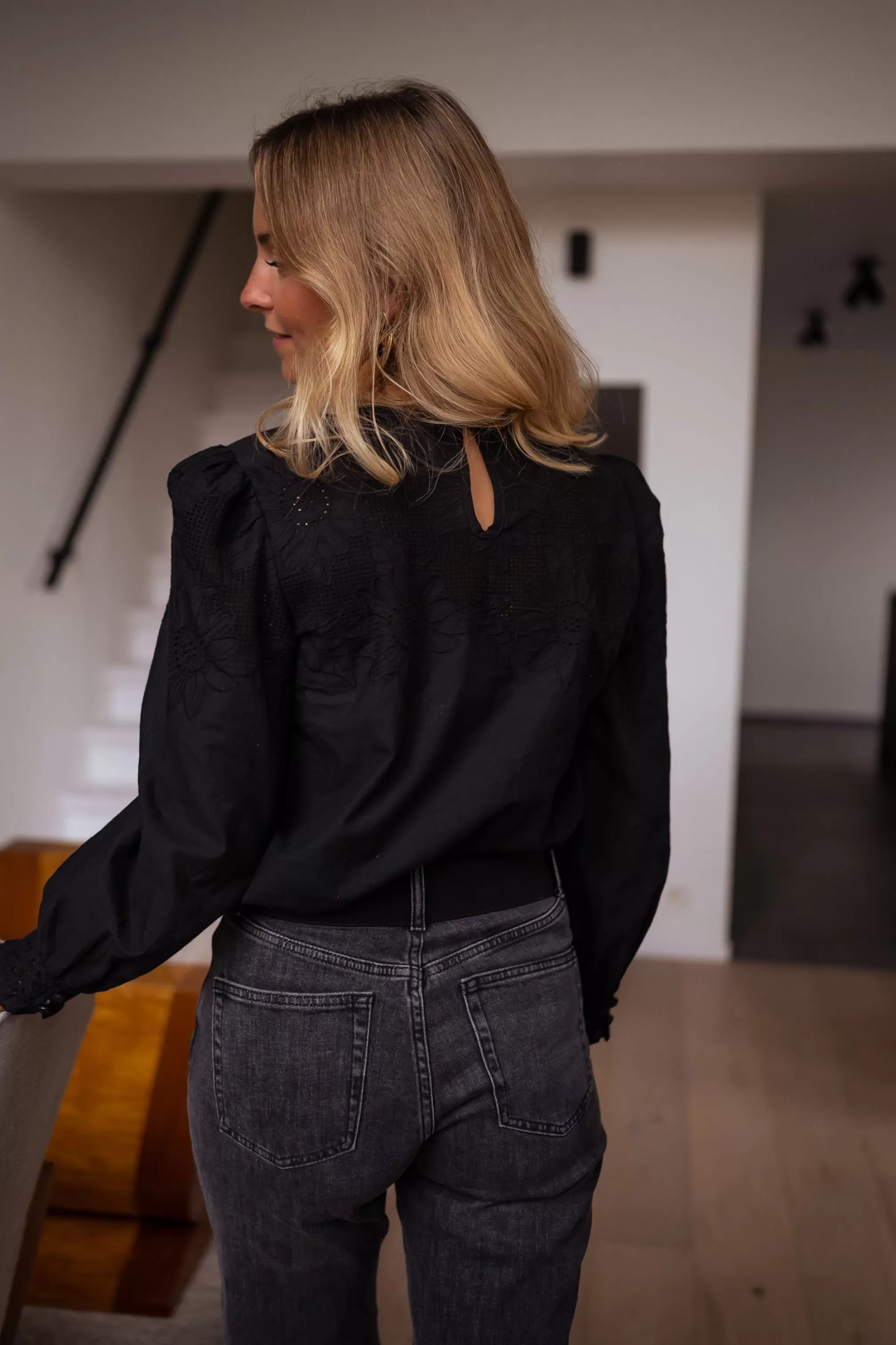 - Openwork pattern on collar and cuffs