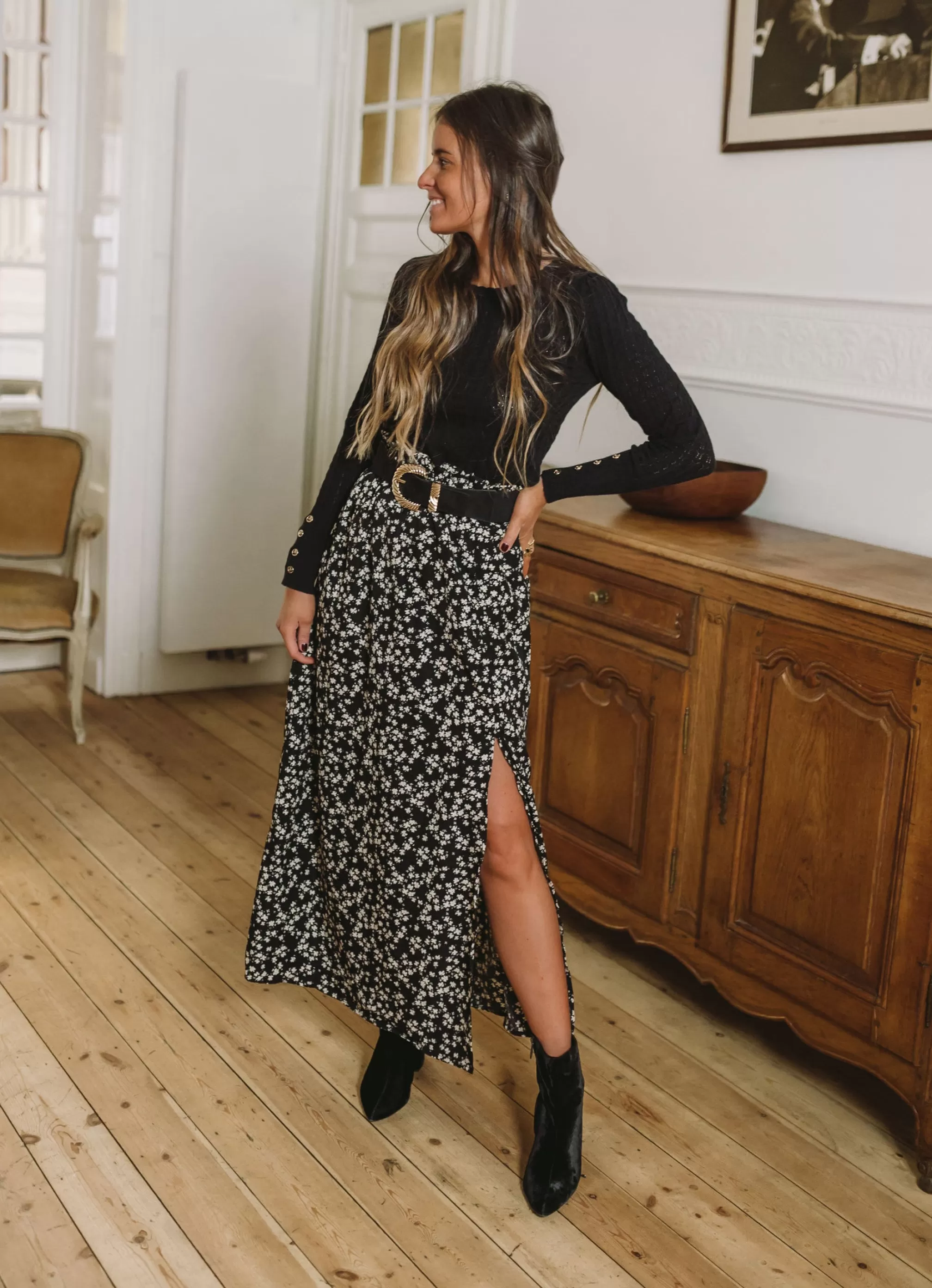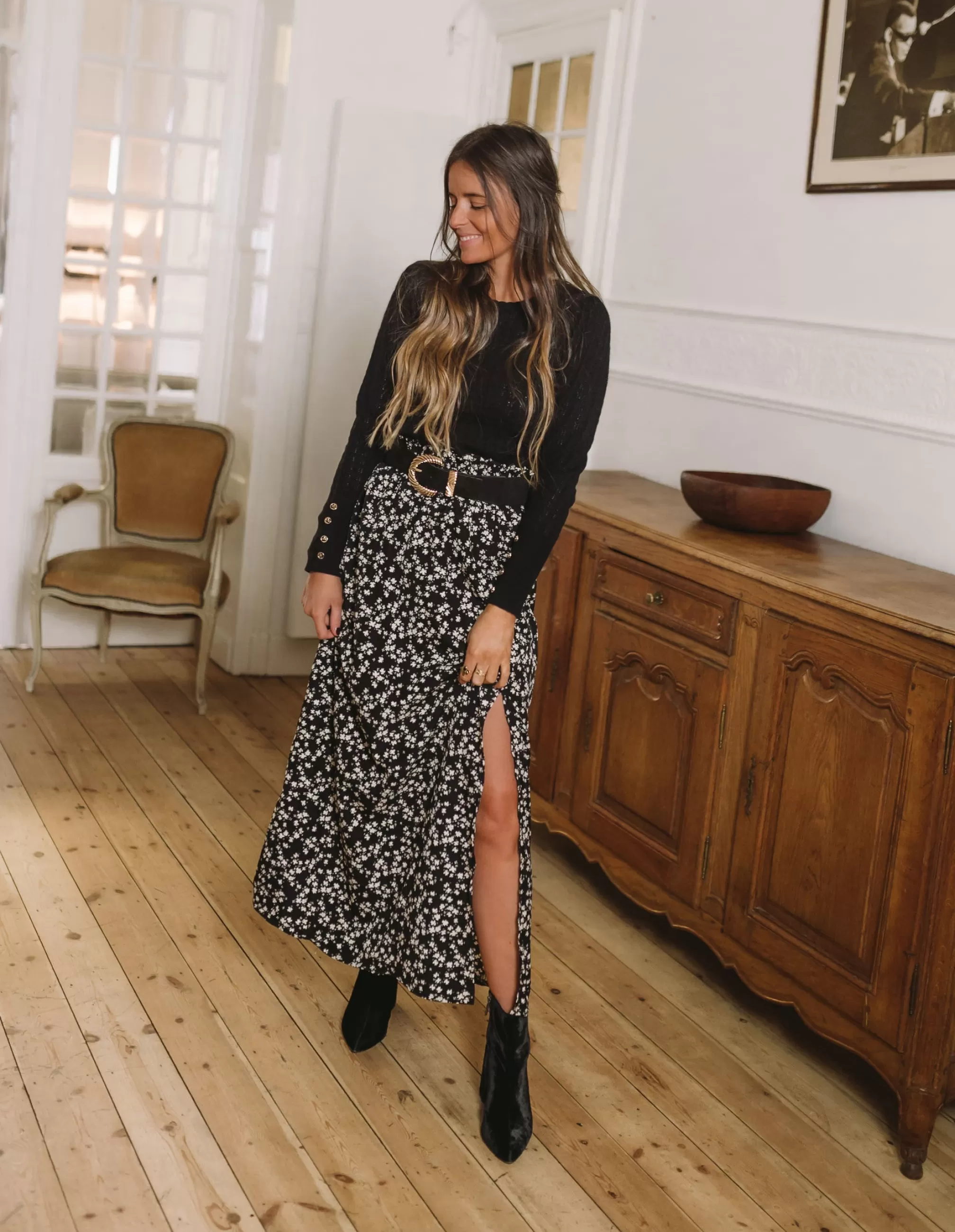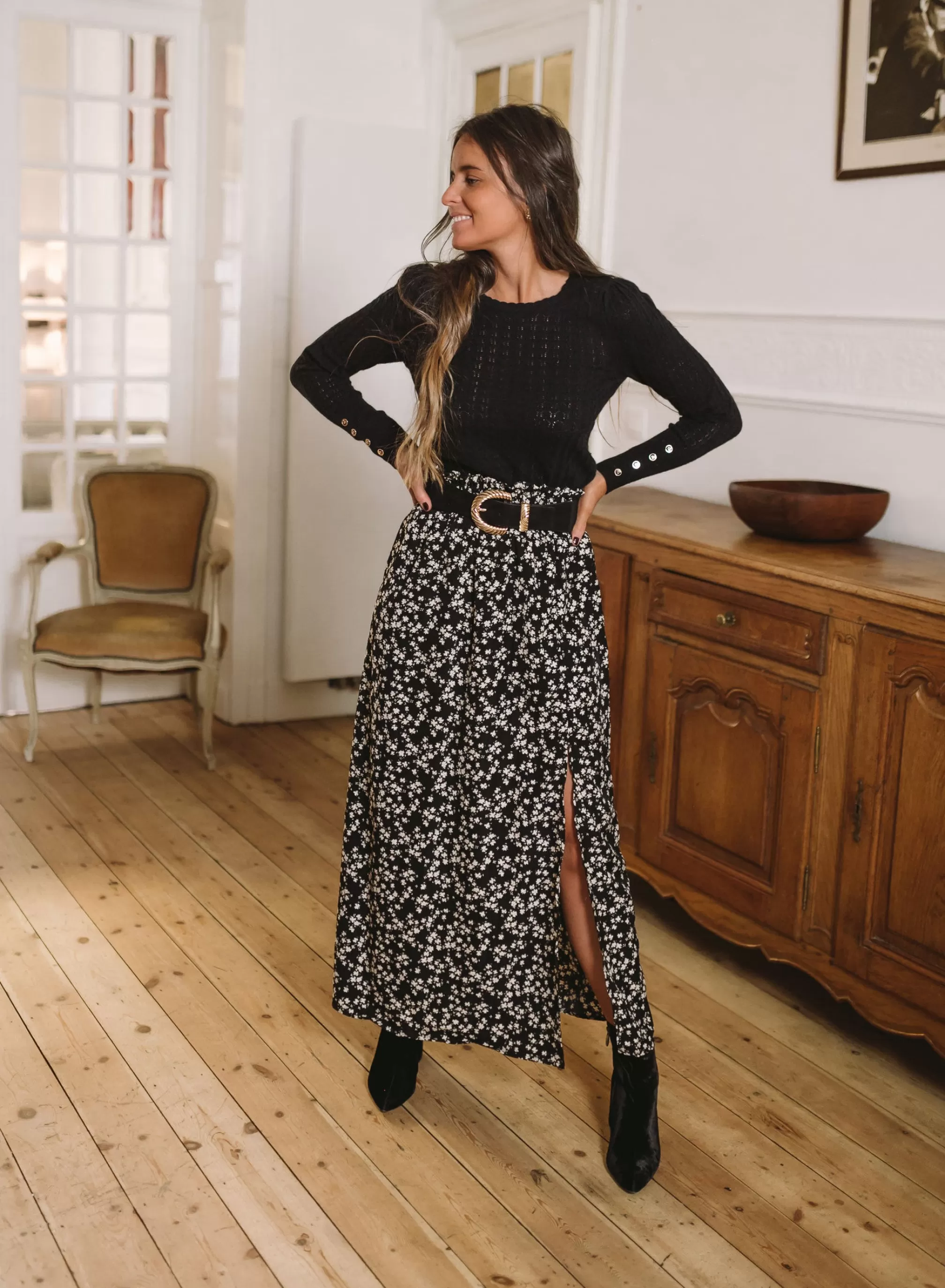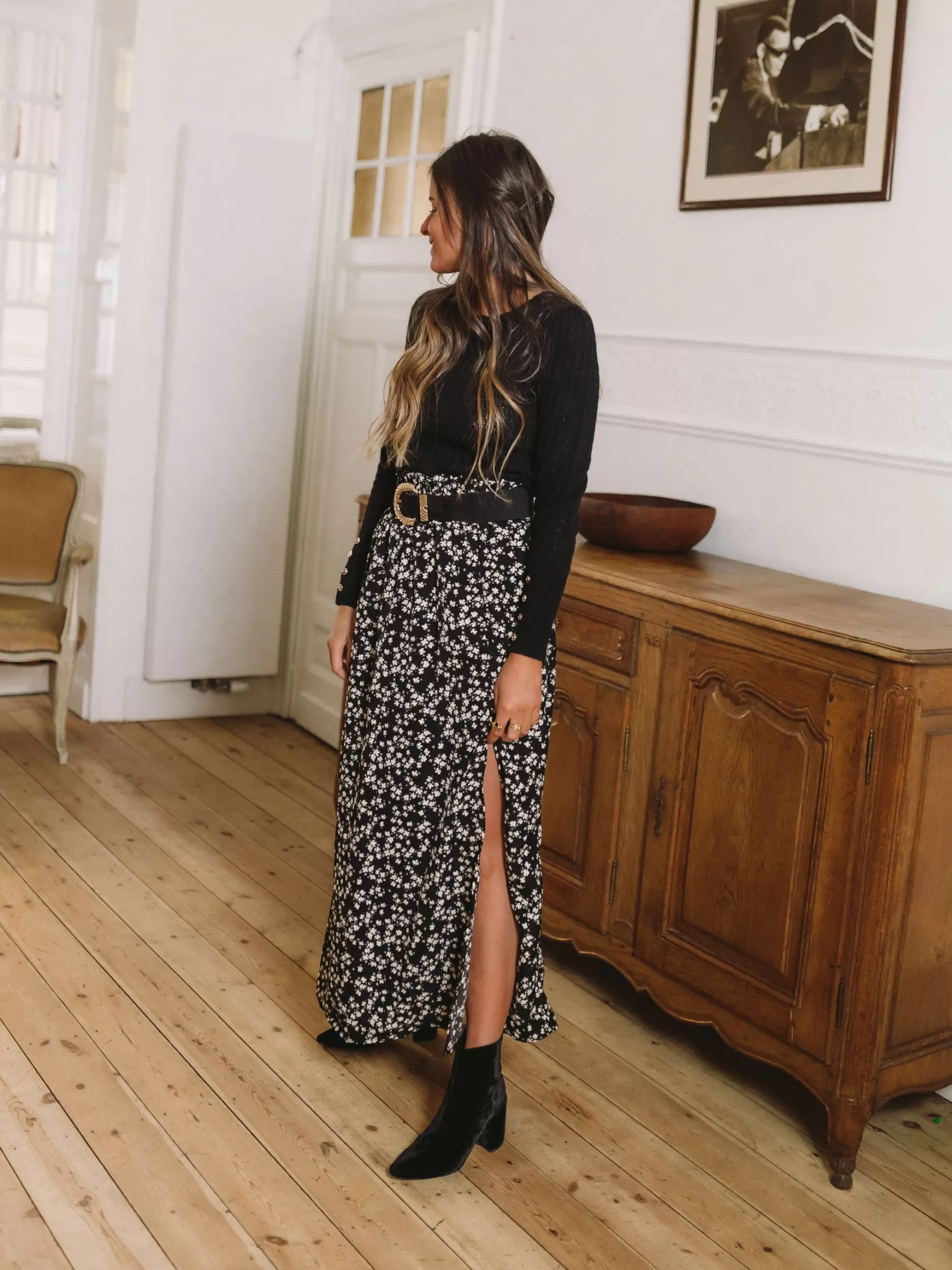 Size highElasticated SizeA slit on the side of the skirtFluidFloral pattern ecruSizes : S-M …