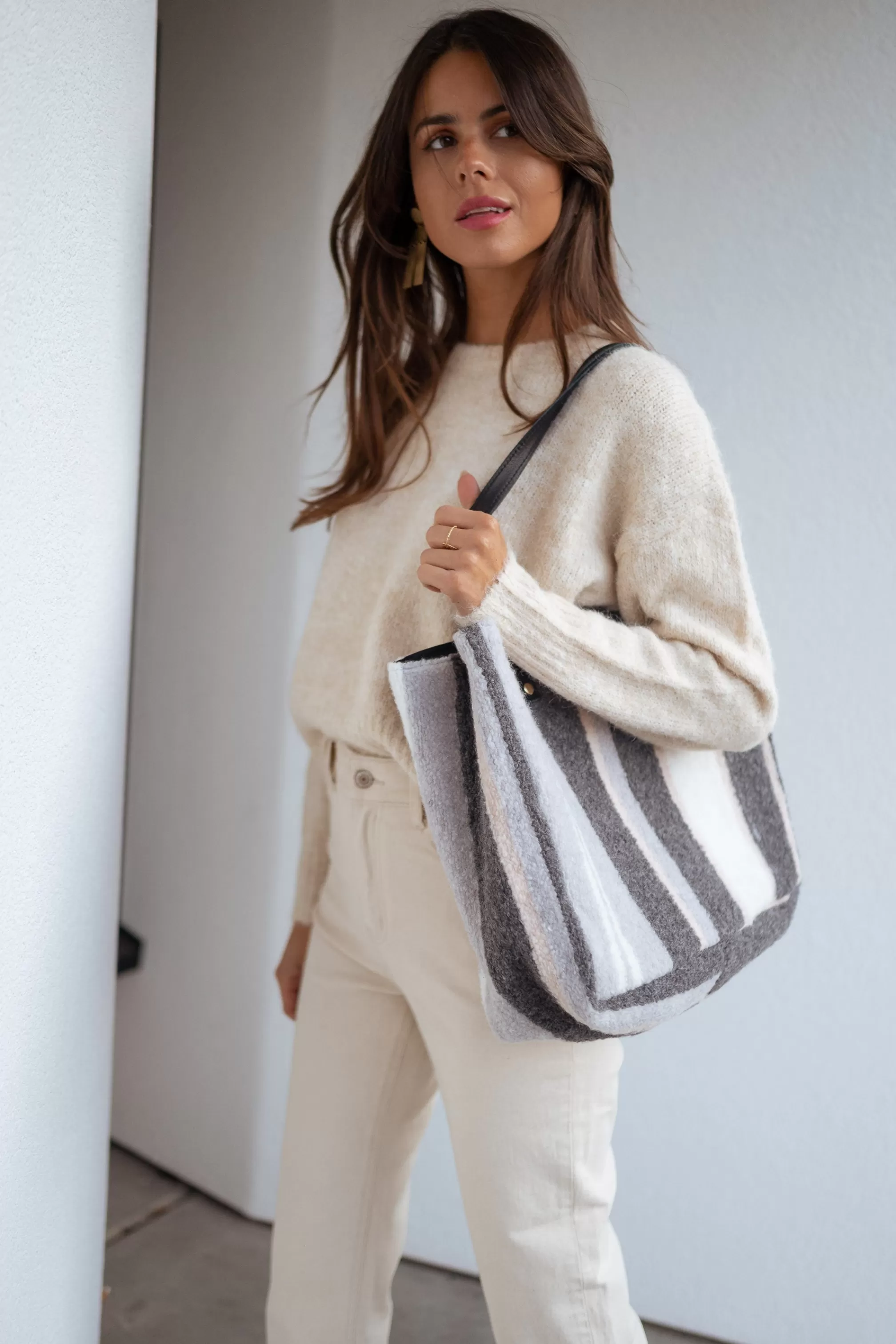 Cabas effectRectangular shapeLeather handleWool effectPocket inside the bag Colors : grey…