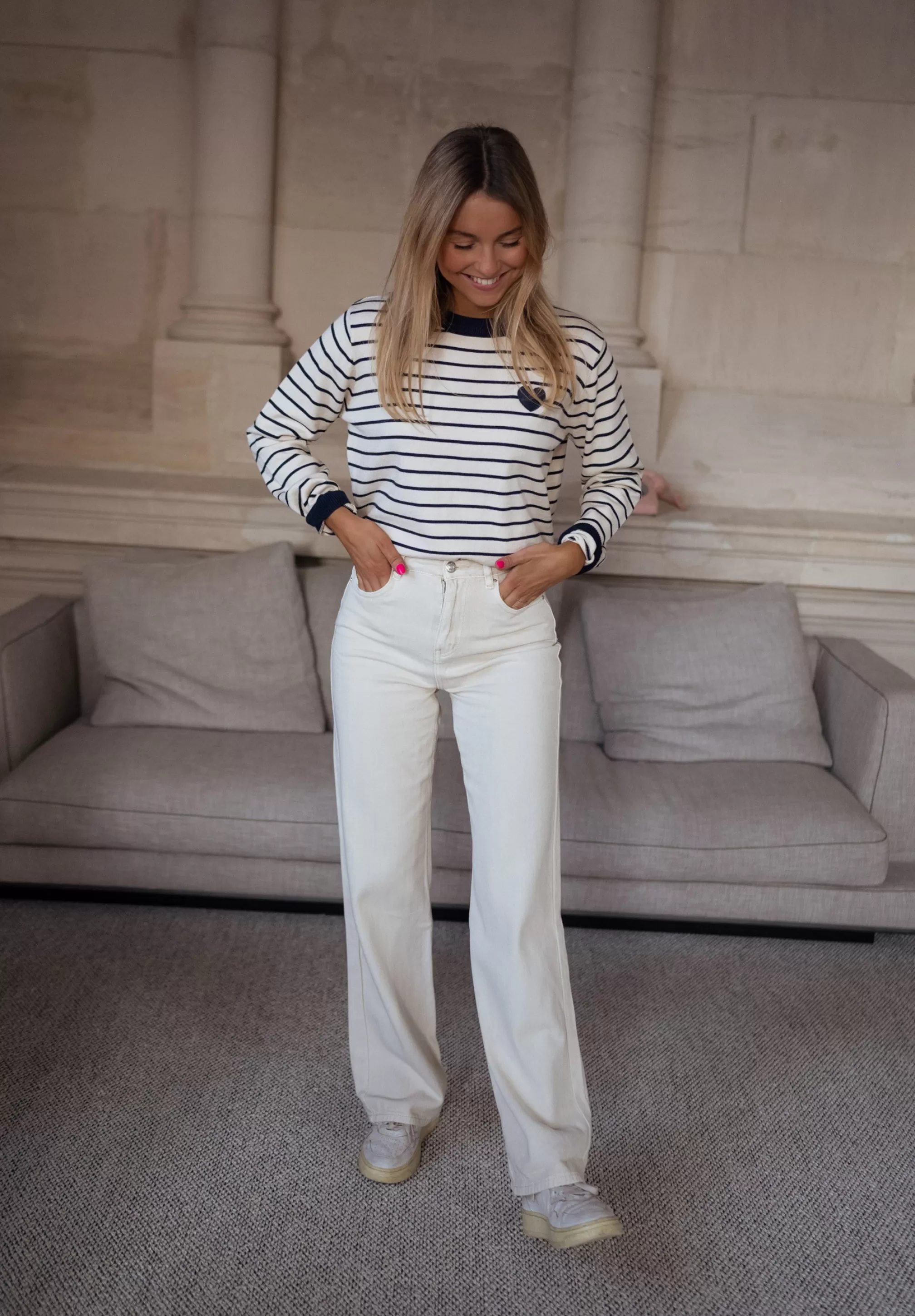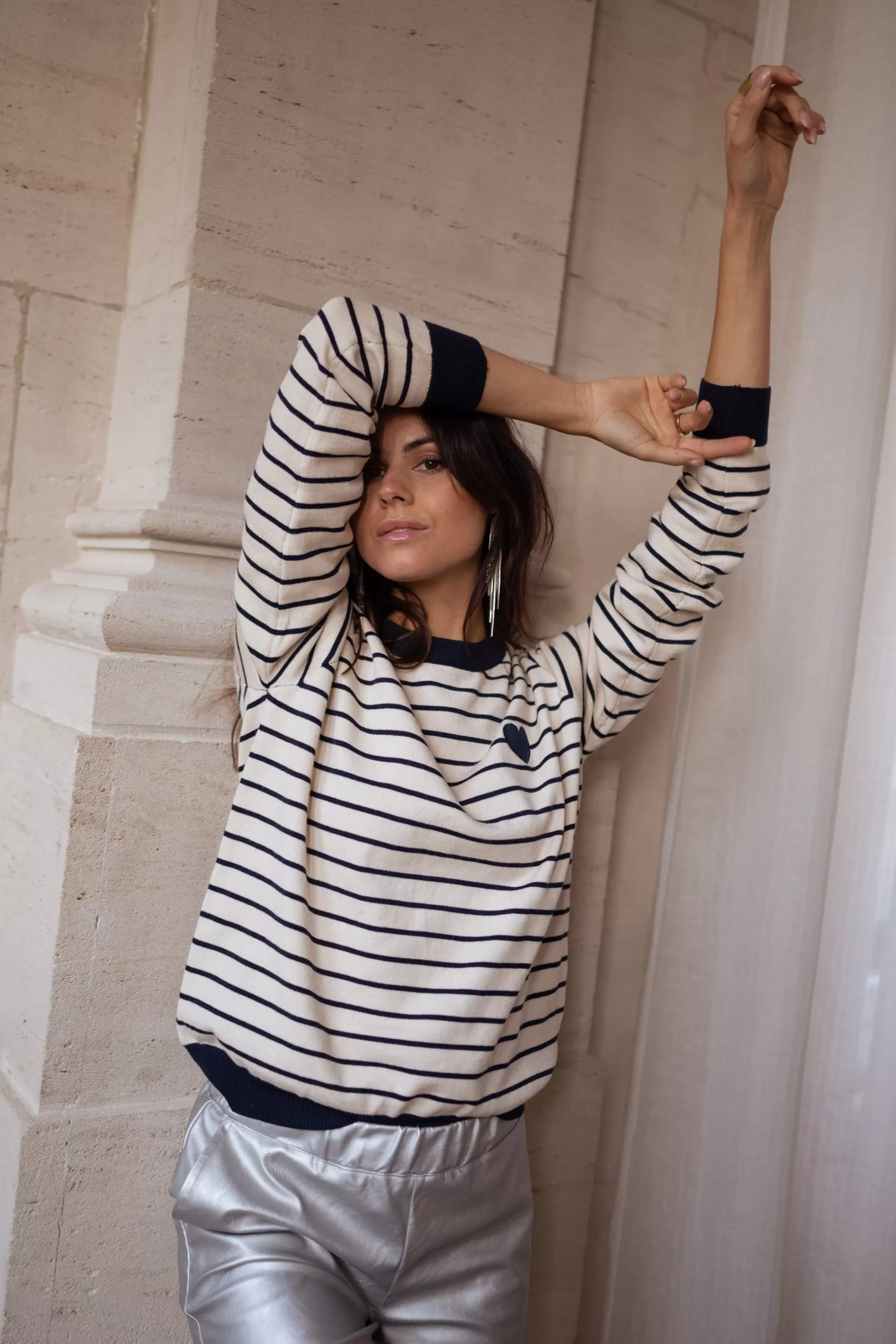 Ecru and blue sweater with lines Blue heart shape on the right Ophélie is 1m68, Lar…