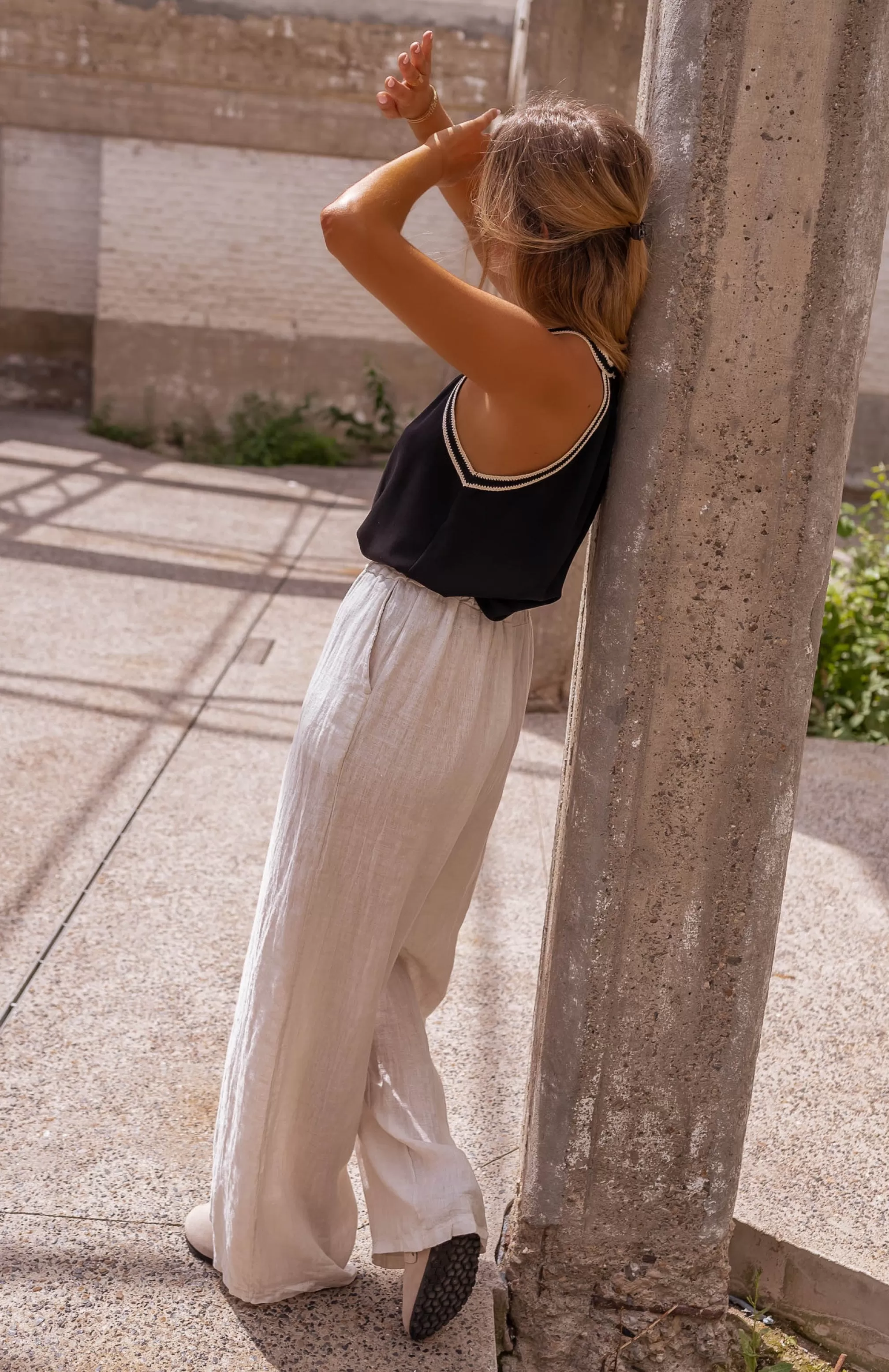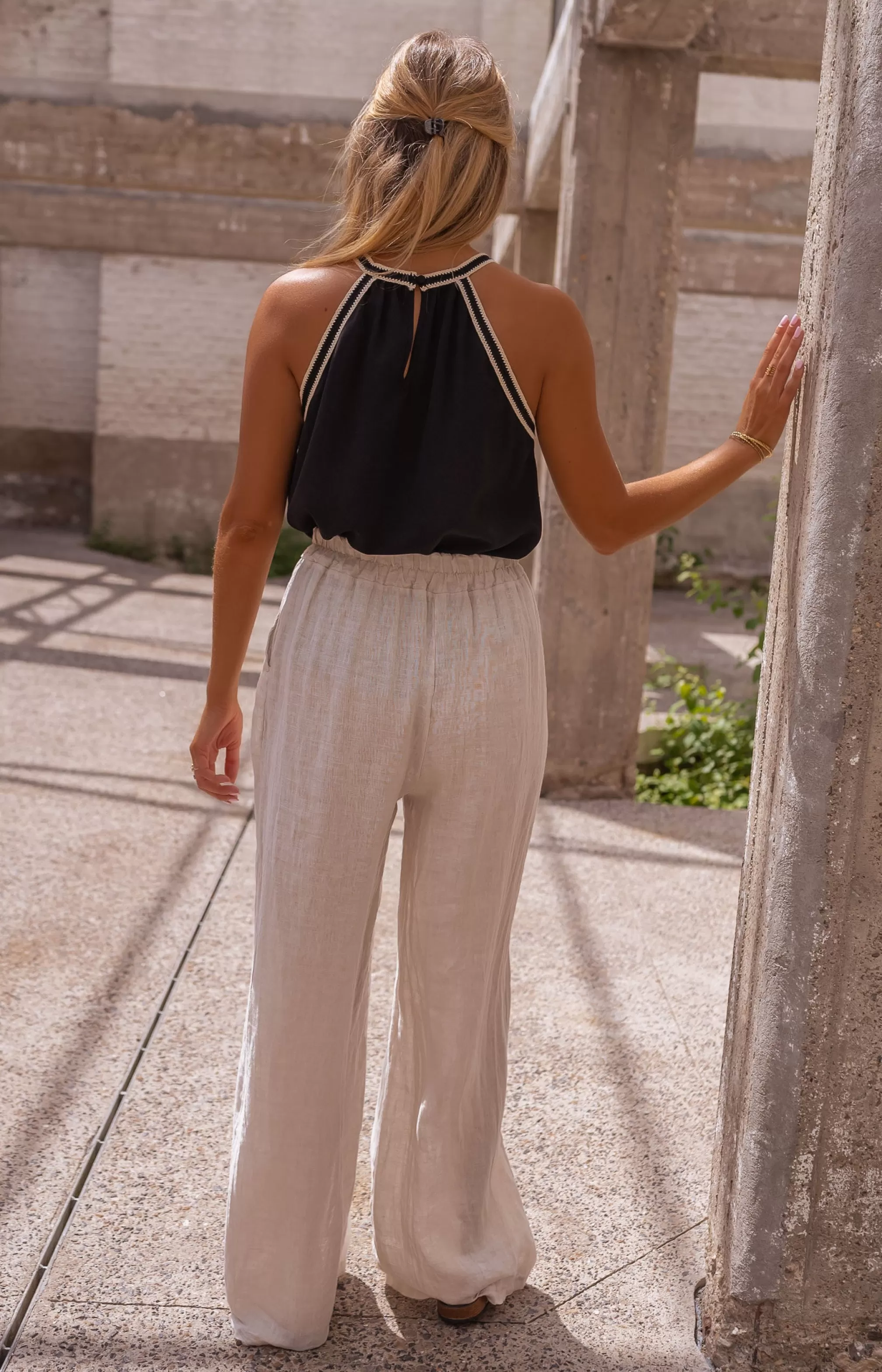 Elastic at the waistLong FluidLinenPockets on the front Slightly sheerOphélie is 1m…