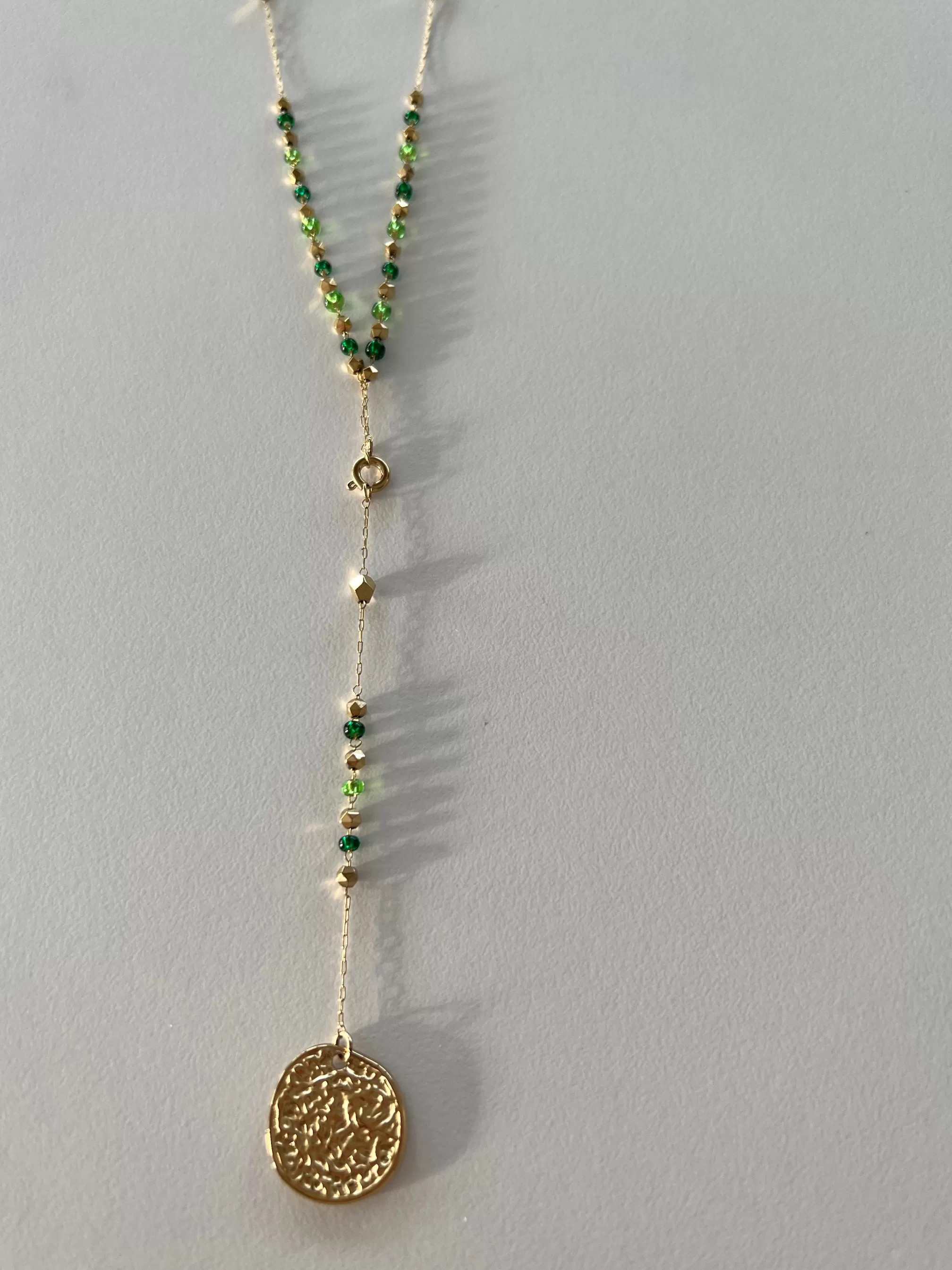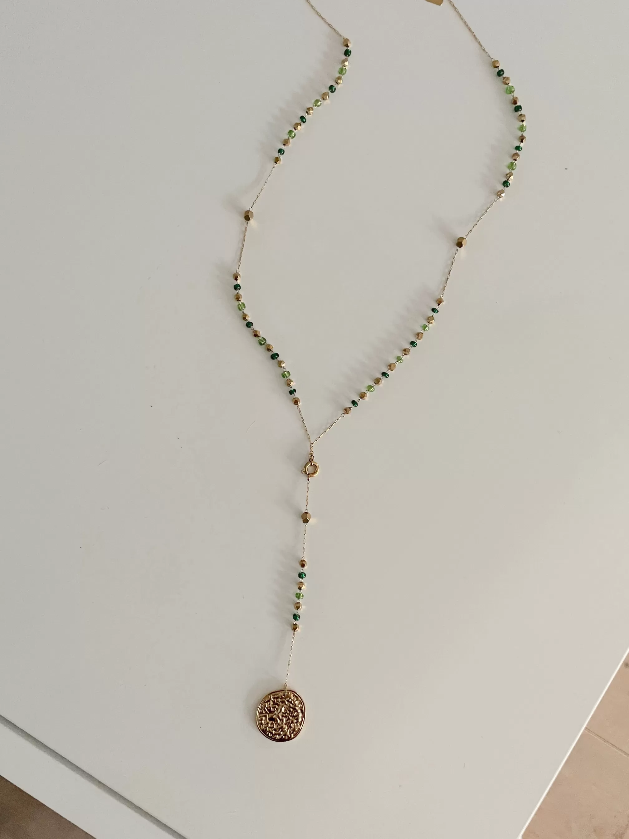 Stainless steel Golden finish Green and golden pearls Long necklaceHammered med…