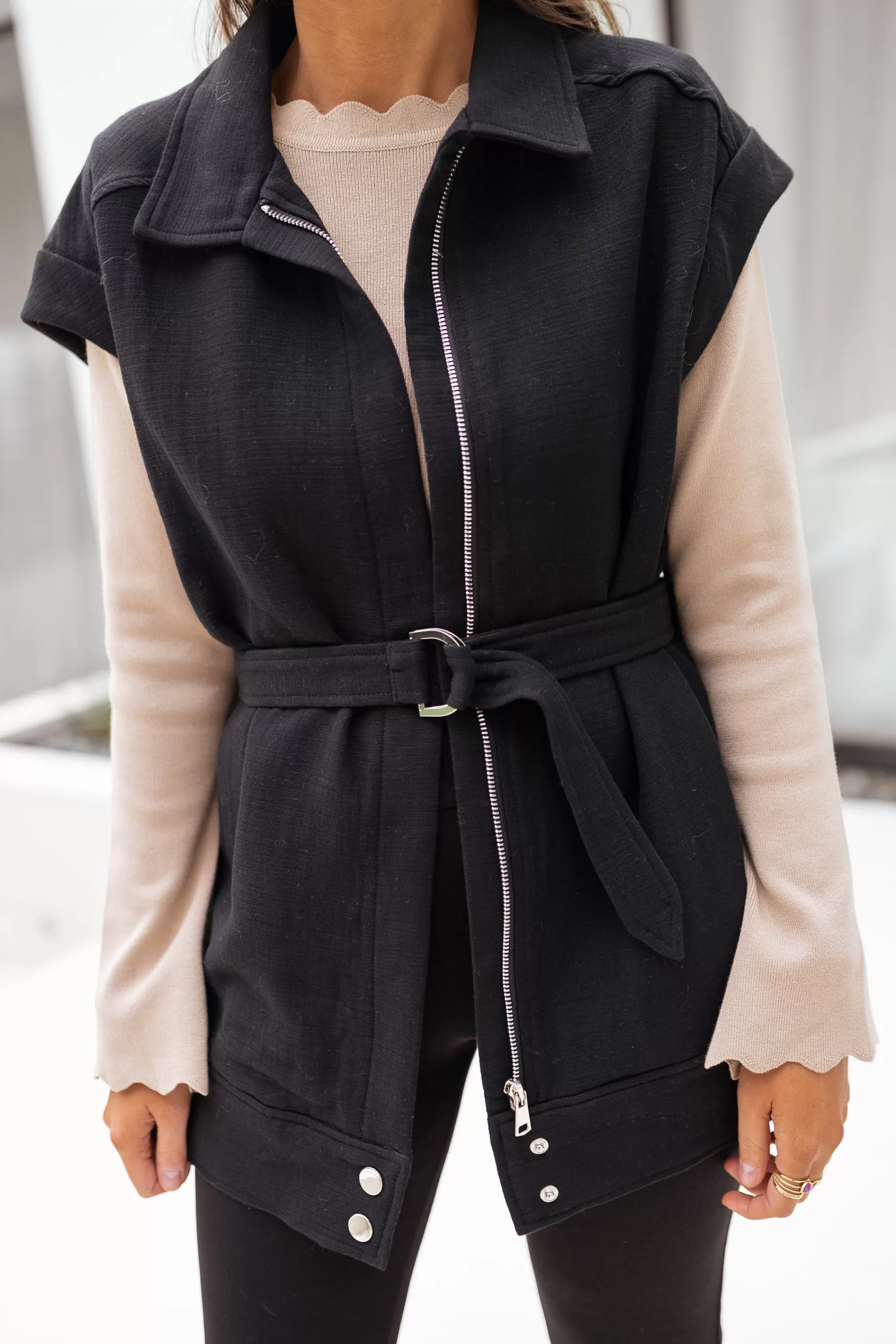- Silver press stud at bottom