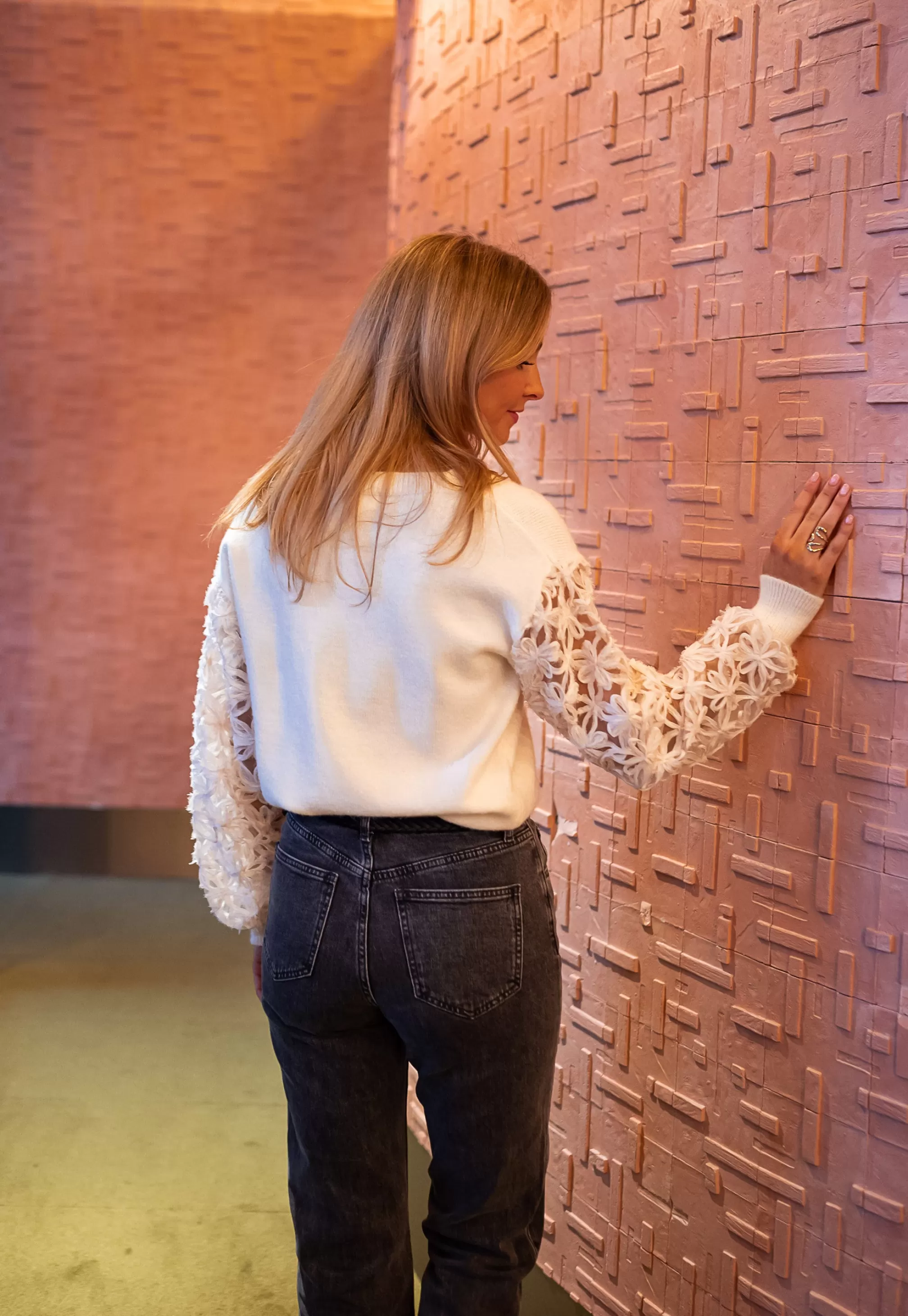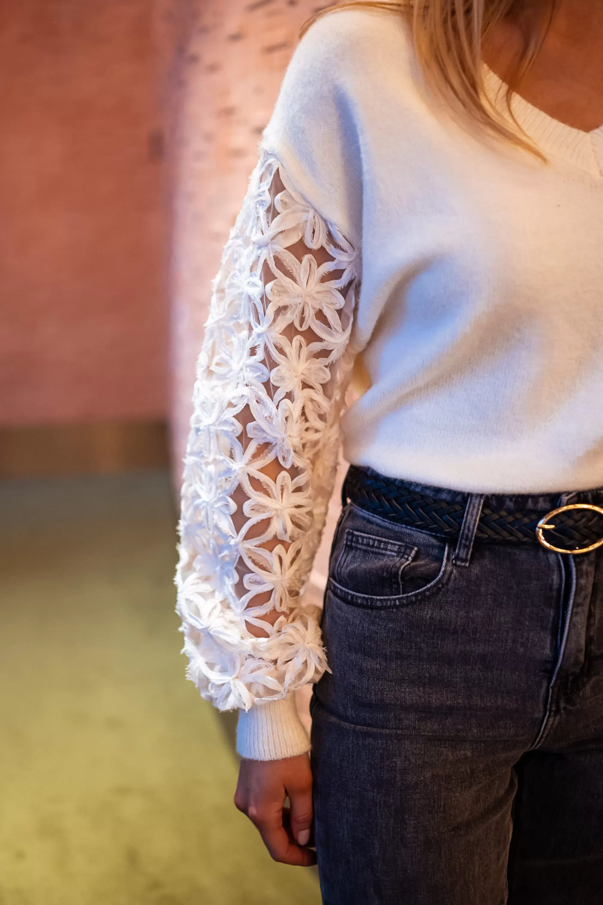 - Floral embroideries on the sleeves
