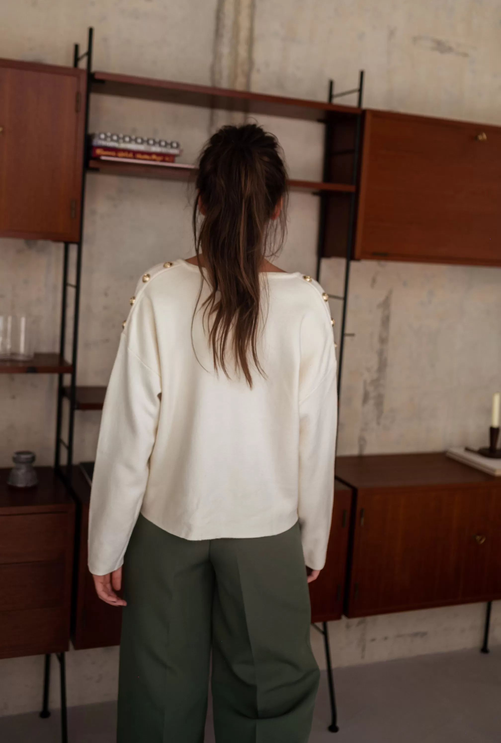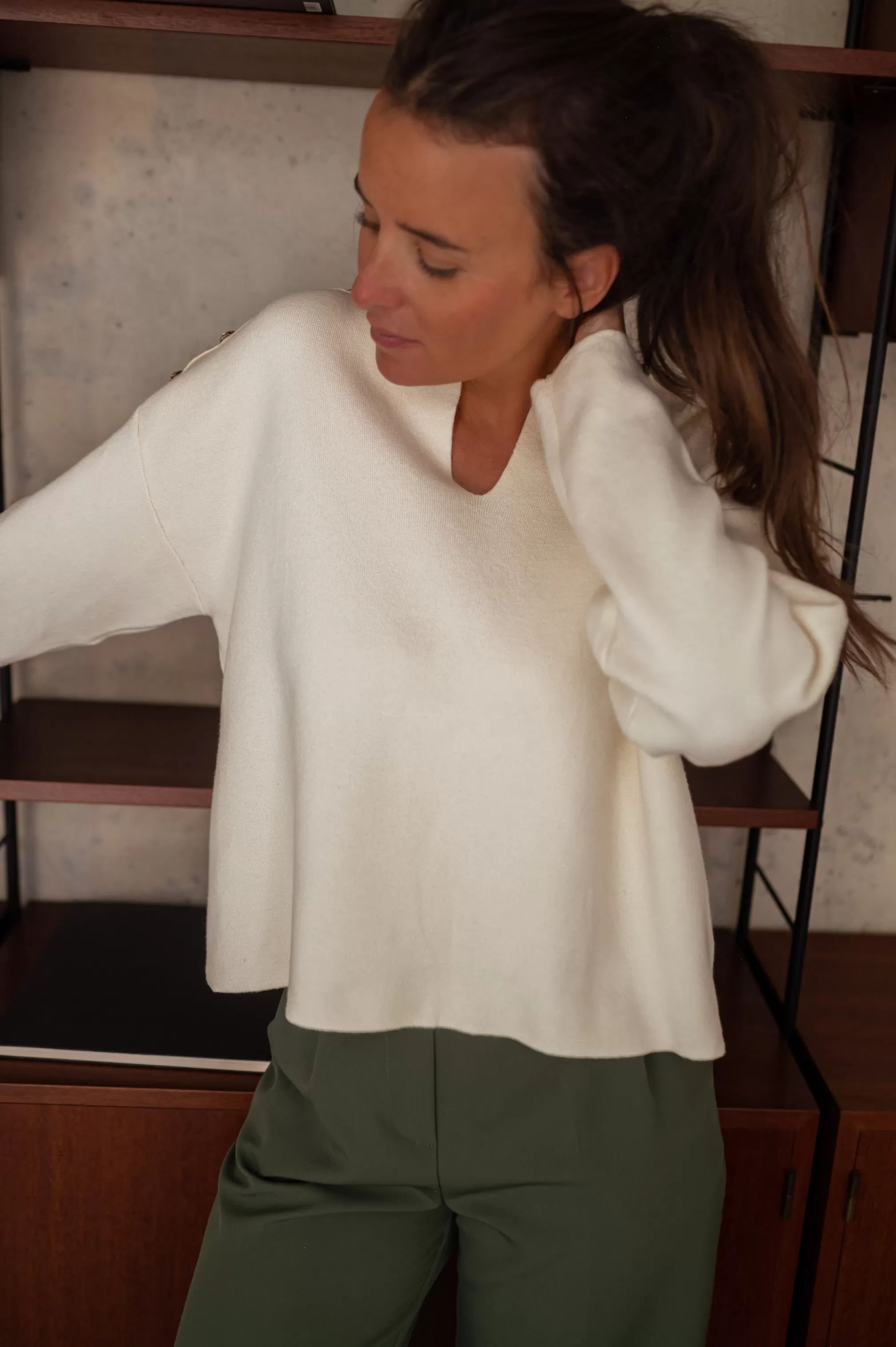 Long sleevesSoft Golden buttons at the shouldersV-neckStraight cutSizes : S-M / M-LS-M : …