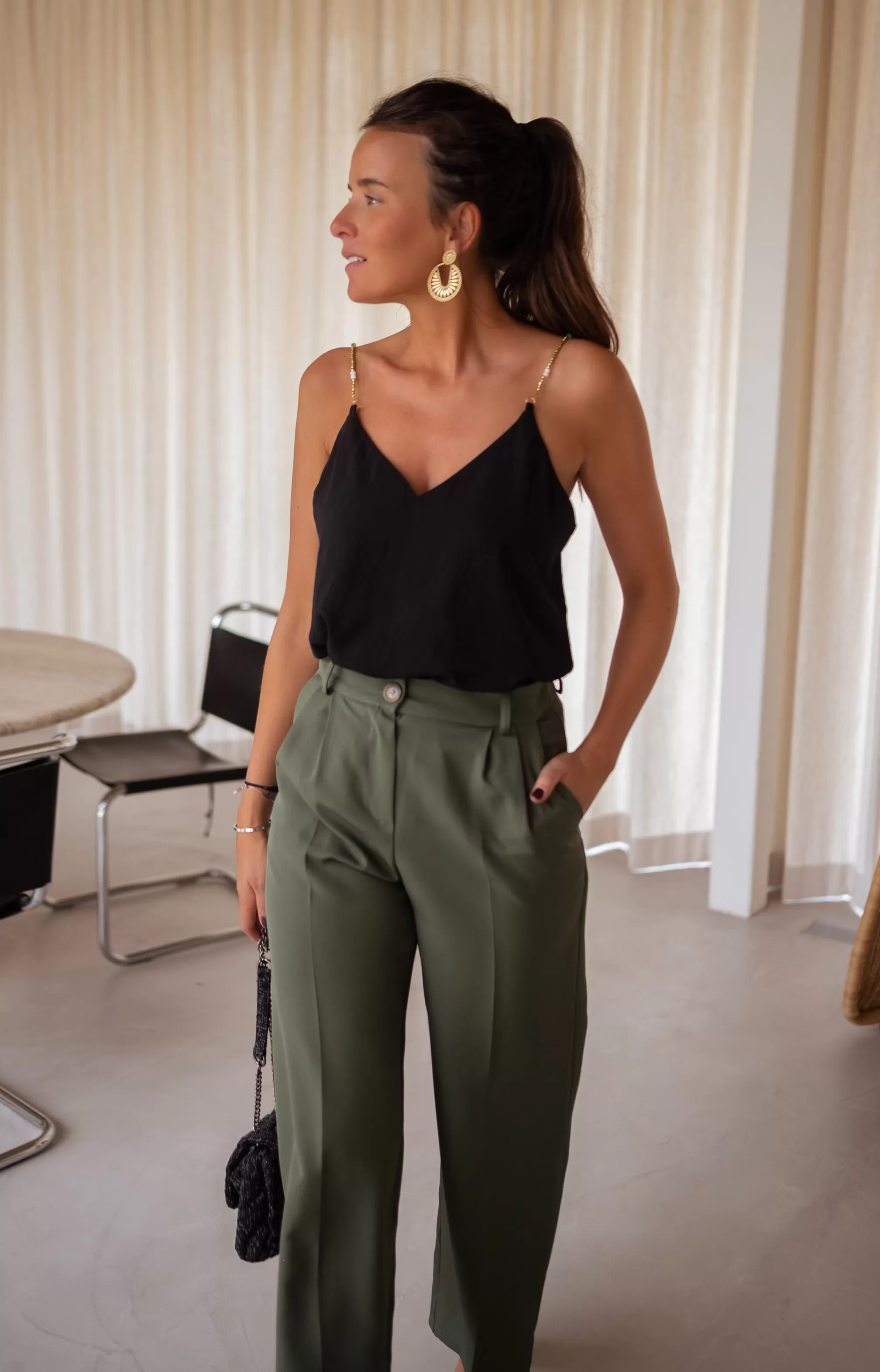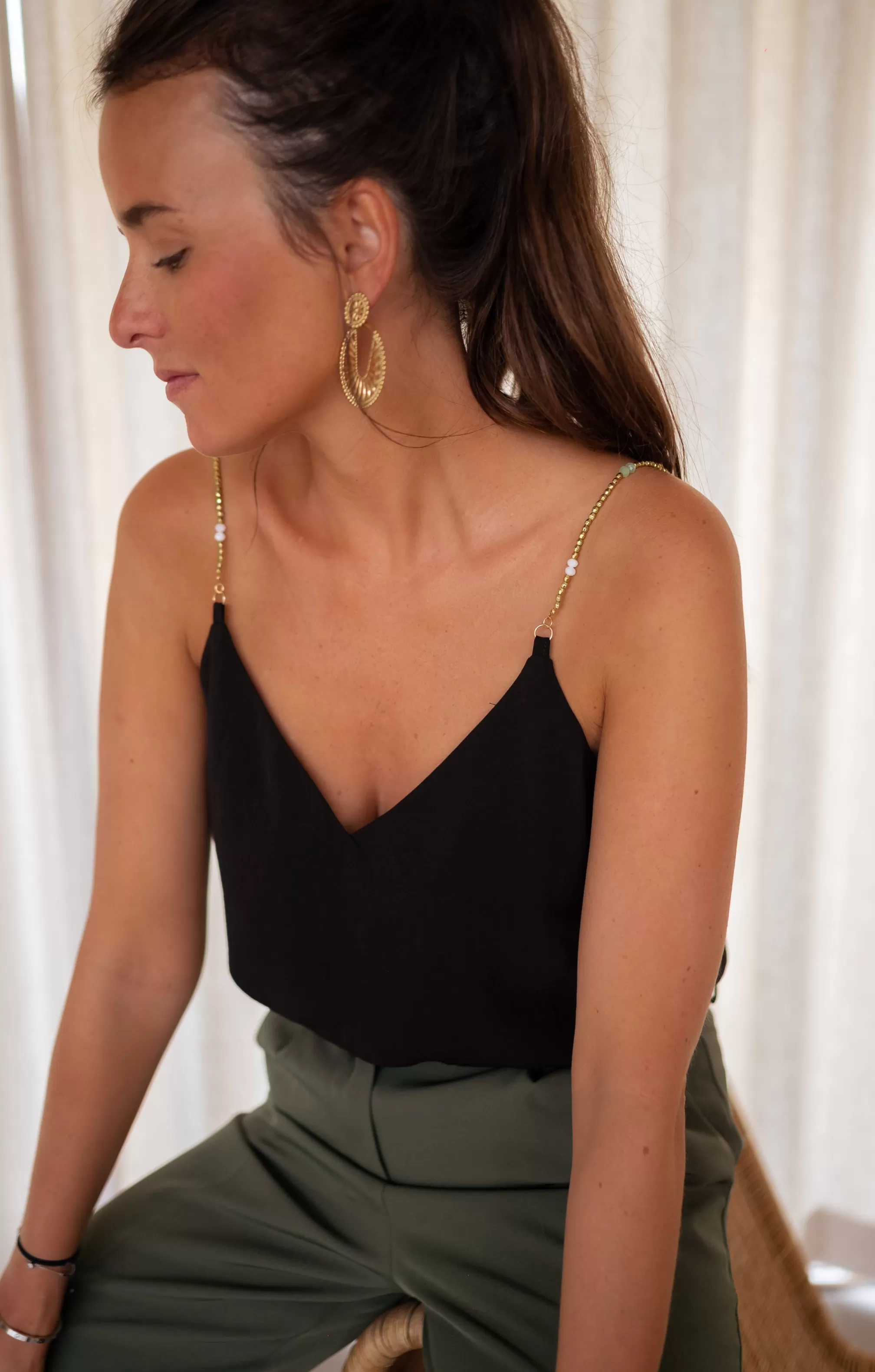 Straps with pearls Not adjustable straps Lining V-neck on the front …